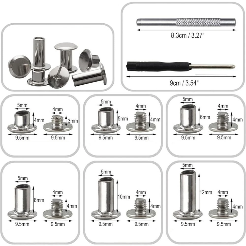 110 Sets 6 Sizes Chicago Screws Assorted Kit Flat Head Stud Screws Metal Leat...