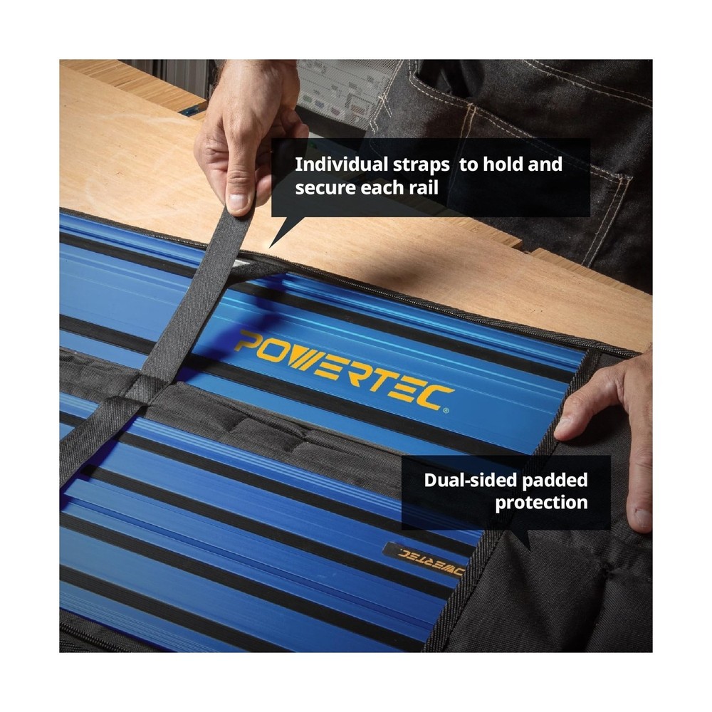POWERTEC 72152 110" Track Saw Guide Rail Joining Set with Protective Bag for Track Saws | Includes 2x55" Guide Rails and (1) Guide Rail Connector for Woodworking Projects Description This track saw guide rail and adapter kit fits the track saw table series and serves an excellent OEM replacement. Once the connector locks the guide rail in, it interacts with the saw base and is engineered to deliver strong, precise cuts, routing and trimmings with optimal positioning. Our guide rail replacement set features two 55-inch tracks (longer than the standard 50"), along with a new and approved connector for perfect alignment and to make installation quick and easy. The guides are made with extruded aluminum for anti-corrosive and rust resistant properties. your woodworking projects get more complex, these tracks deliver accurate and consistent results that you can depend on. Each guide rail has been tested and optimized for the Track Saw and Plunge Saw series. Set Includes: (2) 55" Track Saw Guide Rails (110" inches when connected) (1) Guide Rail Connector "Please Note: 1 Guide Rail Connectors are required to connect/ join ONE guide rail to another." The Protective Guide Rail Bag by POWERTEC. This large black guide rail bag is designed to provide you with a premium looking carrying bag for your guide rails, tracks and other accessories. Universal Design Possessing a 60 inch exterior, it was specifically designed to accommodate (two) 55" POWERTEC guide rails. Seasonal Protection It is made with tear resistant and water repelling material that will come in handy all year around, and both in and on your way to the jobsite. Additional Storage Although primarily used to tote/ transport a set of guide track rails, this bag is equipped with a reinforced pocket for extra storage space. Features: INCLUDES: (2) 55” extruded aluminum track saw tracks and (1) guide rail connector and a 60" protective carrying bag to transport rails PURPOSE: Provides optimal positioning and makes it super easy for various woodworking applications such cutting, routing and trimming - make straight and precise cuts over 9 feet long PREMIUM QUALITY: Made from professional grade, rust resistant extruded aluminum for high performance durability and the power to deliver heavier, high precision cuts – all while staying in place COMPATIBILITY: Track Saw and Plunge Saw OEM replacements ; Track designed for multiple clamping options, will work with POWERTEC clamps 71423, 71409, and 71410 RAIL BAG FEATURES: This track saw guide rail bag is super durable, Comes equipped with a high quality zipper, heavy duty shoulder strap, ergonomic handle, and pockets for additional storage Product Details: Manufacturer: POWERTEC Part Number: 72152 Item Weight: 12.54 pounds Package Dimensions: 63 x 12.5 x 3 inches Item model number: 72152 Size: 110" Guide Rail (For DeWalt) w/ Bag (Limited) Style: 55"x2 Guide Rail (For DeWalt) w/ Bag Material: Extruded Aluminum Item Package Quantity: 1 Included Components: (2) 55” extruded aluminum track saw tracks and (1) guide rail connector and a 60" protective carrying bag to transport rails Batteries Required?: No Date First Available: November 11, 2024 Delivery We Do Not Ship Outside of the Continental US. Return Policy All items qualify for returns within 30 days of receipt. Seller is responsible for return shipping on any item that is not damaged. Feedback We take our reputation seriously, we buy and sell online, so we understand the value of trust. If you are unsatisfied with your order, please contact us and we will work with you to resolve it to your satisfaction.