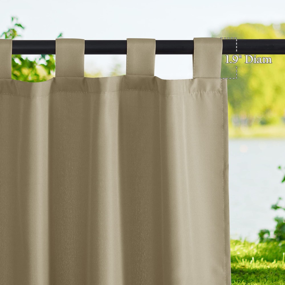 Product Info: Sold by 2-panels per package. The loops can slide directly over a drapery rod under 1.9" diameter. Easy to install. Both sides of the curtains are the same material and color. Nice Material: These outdoor panels are made of heavy-duty canvas which is waterproof, quick-dry, and wrinkle-free, and won't fade through rain and shine. Perfect for indoor and outdoor use. Tab Top: Tab Top design is special and not like the usual outdoor curtain, providing you a more fashionable, elegant, and unique sense, while also easy to hanging and won't bother on grommet rust. Good Performance: These outdoor drapes will provide a real sense of separation & privacy which benefits both yours and your neighbors, perfect for patio, porch, cabana, pergola, and so on. Easy Care: Good Quality to withstand years usage. Machine washable with water temperature below 86F. Mild detergent no bleaching. Low-temperature ironing. 30 days money-back on return policy.