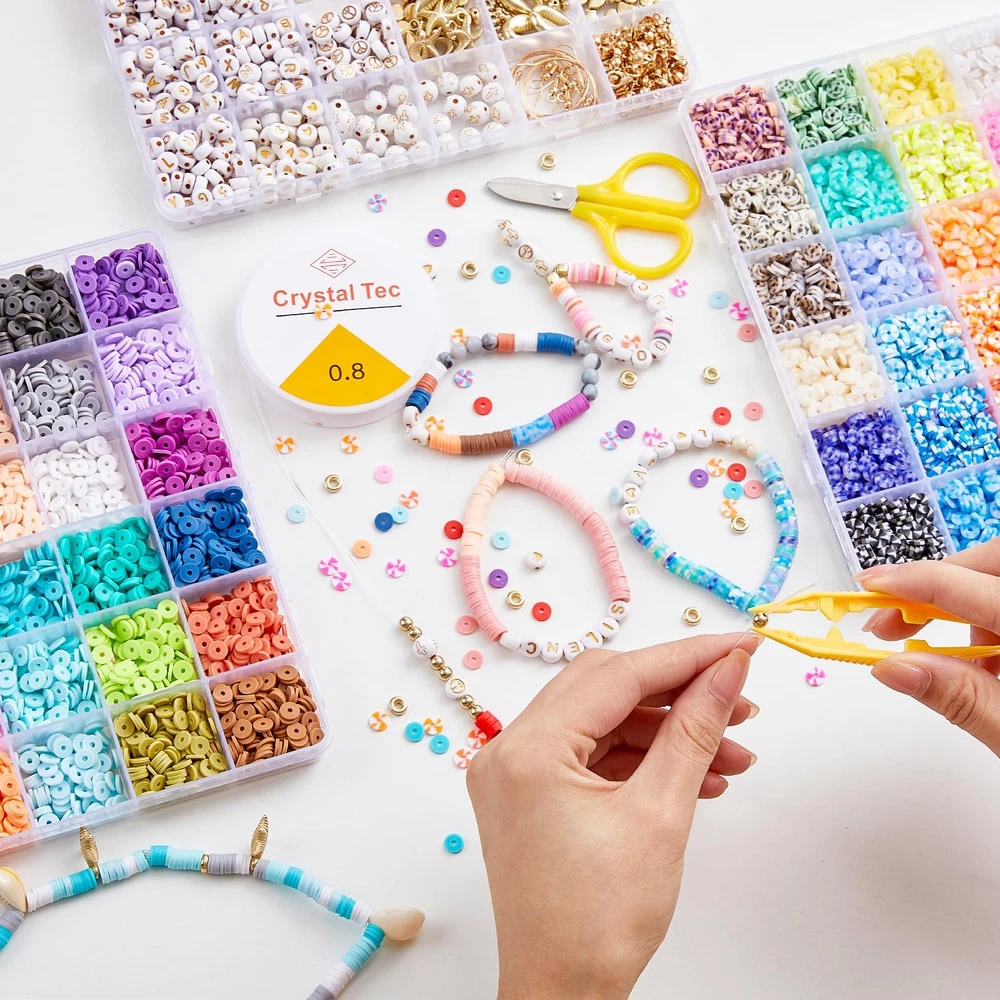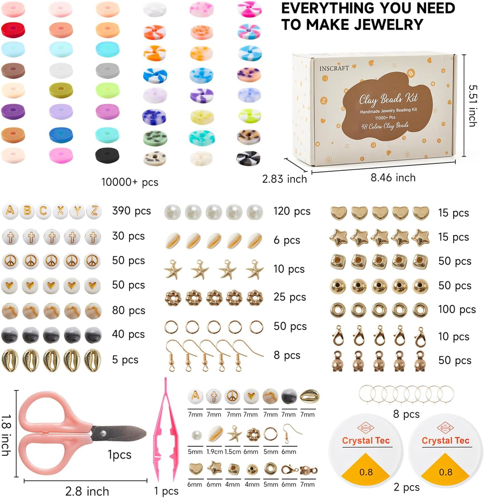 ALL YOU NEED INCLUDED - The Clay beads making kit contains 10,000pcs beads in 48 different colors and 1000+ accessories. The accessories include letter beads, heart beads, evil eyes beads, square beads, gold beads, star beads, pearls, pendants and charms, lobster clasps, 2 rolls stretchy strings, a scissors, 1 tweezers etc. This complete jewelry making kit is filled with endless possibilities to meet all your needs for bracelet & jewelry making. PREMIUM & RAINBOW COLORS - 48 different colors strictly selected popular colors to meet your DIY needs. This kit can make over 80 bracelets and necklaces. Our kits are lightweight, comfortable to wear and made of polymer clay, non-toxic, fade resistant and waterproof. Each color is in a small compartment, which is easy to access and will not not messy. You can easily find it according to your needs. GREAT GIFT CHOICE - Why not consider this fun bracelets set as a gift? This clay bead making kit is a popular gift for kids or adult who like to express their imagination. It’s a grat choice to give it to your loved ones on Birthday, Valentine's Day, Mother's Day, Christmas, Halloween, Thanksgiving and other meaningful days. You can also create unique friendship bracelets to friends separately. PERFECT FOR ACTIVITIES - The 11,000pcs high-capacity bracelet kits are ideal for group craft classes and fellowship activities. Gather your family, colleagues and friends to play a DIY jewelry-making game. Everyone can unleash their creativity to create beautiful bracelets, anklets, necklaces, camera chains, earrings, phone straps, key chains, bag chains and more. PURCHASE WITHOUT WORRY - Customer complete satisfaction is very important to us. If you find any problem with our beads, please feel free to contact us. We promise to give you a satisfactory solution within 12 hours. Thank you for supporting our brand INSCRAFT. INSCRAFT 11000 Pcs Clay Beads for Bracelet Making Kit, 48 Colors Flat Round Polymer Clay Beads, Friendship Bracelet Kit Heishi Beads for DIY Jewelry Making, Crafts Gift for Girls Teen Ages 6-12