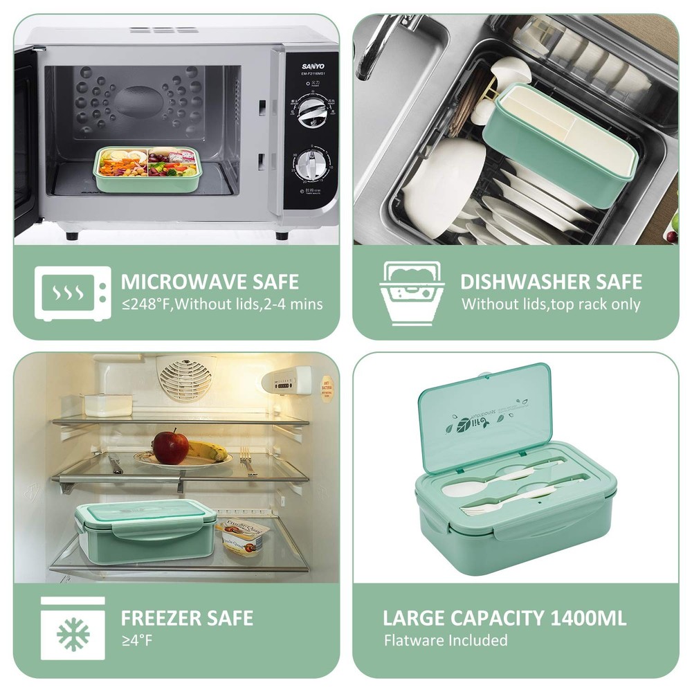 ♥PERFECT BENTO LUNCH BOXES FOR YOUR HEALTHY MEALS: Our reusable bento boxes for adults and kids are easy to use, wash, and store. With our bento lunch box , you can watch what you eat when you're not at home while keeping an eye on your wallet. With 3 different compartments, you can take a complete meal just in one container. The lunch containers with portion control help you keep your diet plan and lose weight. ♥PREMIUM QUALITY! Made from premium food grade materials, this is the best adults bento boxes container for packing healthy food to go. The adult lunch containers can be easily opened using the convenient flaps of the lids.Note also that thanks to their compartments, space-saving design, these bento lunch boxes fit into one another for easy and convenient storage! ♥MICROWAVE, FREEZER, DISHWASHER SAFE: Microwave Safe(without lids, 2-4 mins under 248℉); Freezer Safe(≧-4℉); Dishwasher Safe(top rack only, hand washing is recommended for the lid to avoid any deformation caused by high temperature and pressure washing). ♥PORTABLE, LIGHTWEIGHT, EASY TO CARRY: The dimension of 7.8 x 5.1 x 2.7 inches makes it portable and easy to carry. The perfect design of 1100 ml vs 37 OZ makes the bento lunch box for kids large capacity and light weight. ♥THREE COMPARTMENTS:With three compartments, you can bring different kinds of food for your lunch just in one container. The lunch box containers with portion control help you keep your diet plan and lose weight. NOTE:Its not leakproof from water or sauce, besides, the compartmes not seal up from each other. Recommand for kids over 5 years old!