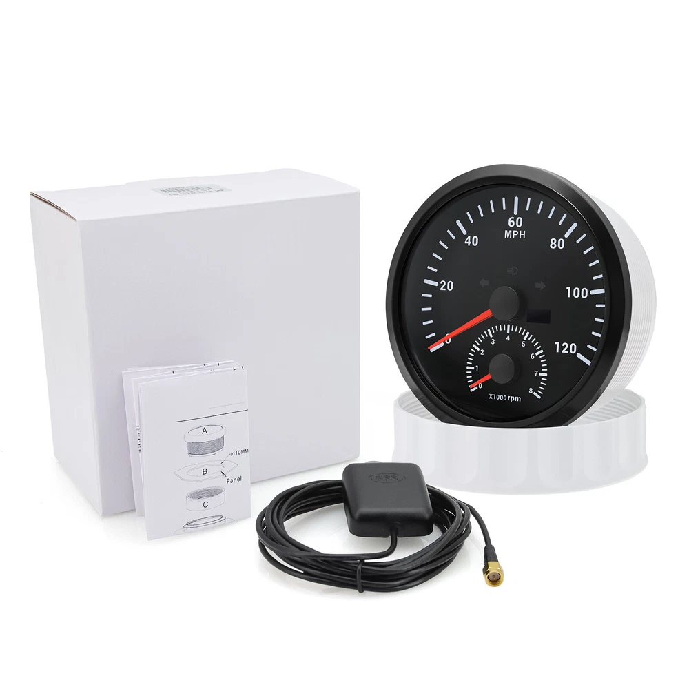 110MM BLACK GPS Speedometer 0-120MPH w/Tachometer 8000RPM Gauge for Boat Car ATV 110mm GPS Speedometer 0-120MPH With Tachometer Gauge 0-8000RPM for Car Marine Boat Features: Suitable for all vehicles and off-road vehicles The signal comes directly from the satellite signal receiver(GPS Antenna), don't need other speed sensor. The gauge has the advantages of high precision, quick location confirmation and short start up time. IP67 waterproof and dustproof grade Reverse polarity protection and anti-fogging performance Stepper motors used for full range of stepping gauges, great feature with its less power consumption, longer life, higher precision, etc. Specifications: Application: Universal fit for Motorcycle/ Boat/Truck/Bus/Car Electronic Speedometer (stepper motor) No Mechanic Sensor, get speed signal from GPS Speed ≠0 and show accurate speed in tunnel with the help of accelerometer GPS Blind Area Odometer Compensation OverSpeed Buzzer Alarm (Value Adjustable) Indication Light (Left, Right and High Beam Installation Diameter: 110mm (4-3/8") Speed Range: 0~120MPH RPM Range : 0~8000RPM Mileage Range: 0-99999.9miles Working Voltage: 12V/24V Working temperatures: - 40 to 85°C Protection rank: IP67 Waterproof Reverse polarity protection and anti-fogging performance Connection: 1. Black: Ground(-) 2. Red: 9-32VDC(+) 3. Blue: RPM Signal 4. Yellow: Backlight(+) 5. White: High Beam(+) 6. Brown: Buzzer alarm(+) 7. Green: Buzzer alarm(-) 8. Yellow: Left Turn(+) 9. Gray: Right Turn(+) 10. White: (no need connect)==(If need to connect, please connect negative) Package Included: 1x GPS speedometer 1x GPS Antenna 1x Multi-plug socket 1x Installation Instruction