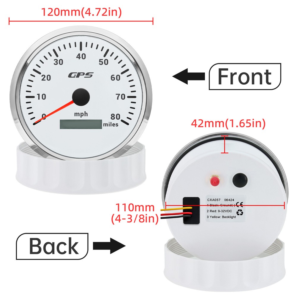110mm White GPS Speedometer 0-80MPH Gauge for Motorcycles Boat Car Truck ATV US 110mm White GPS Speedometer 0-80MPH Gauge 7 Colors LED for Motorcycles Boat Car Truck ATV Feature: High-brightness LED backlight. 316 stainless steel for long-term use even in acid-base, humid environment. IP67 waterproof and dust-proof grade. With curved glass( with anti-fog function). Suitable for all kinds of vehicle modification. Using stepper motor drive pointer, accurate display of the engine speed, and with the LCD display clear display mileage. Gauges have many kinds backlight color (red,yellow,orange,green,blue,purple,white),customers can adjust any color that you like. GPS Speedometer Gauge Install Diameter: Φ110mm (4-3/8") Signal: GPS Working Voltage: 9~32V DC Size: 12x8x12cm/4.72x3.1x4.75 inch Units: MPH Colors:White&Silver Indication Range: 0-80MPH Backlight: 7Colors LED Package Includes: 1X 85MM GPS Speedometer Gauge 1X Wire Harness 1X GPS Antenna 1X Installation Instruction