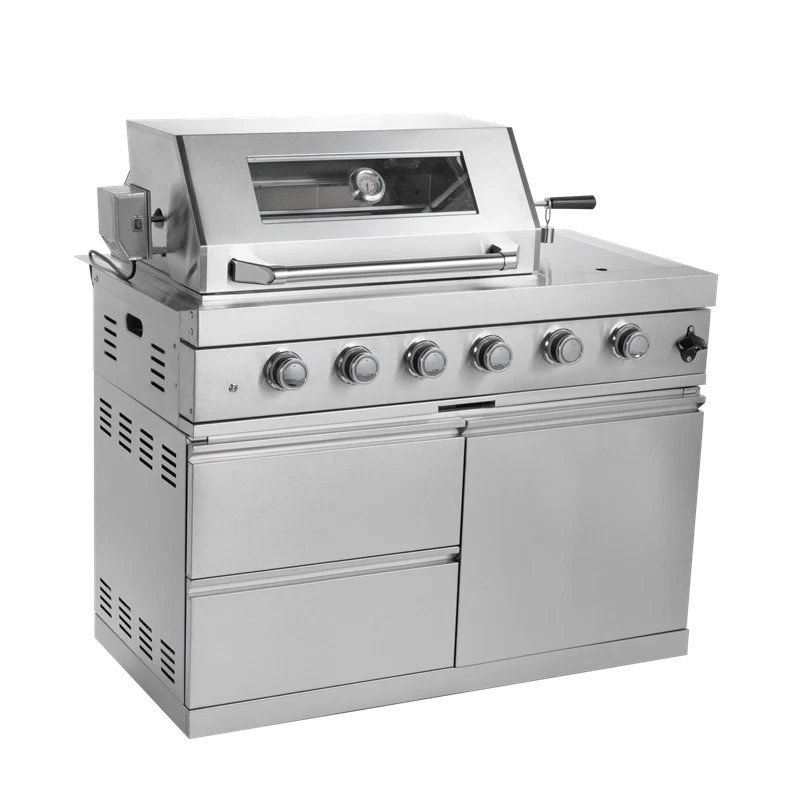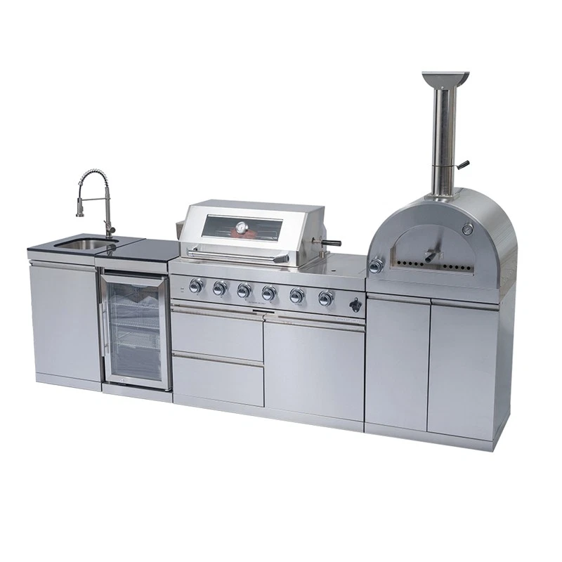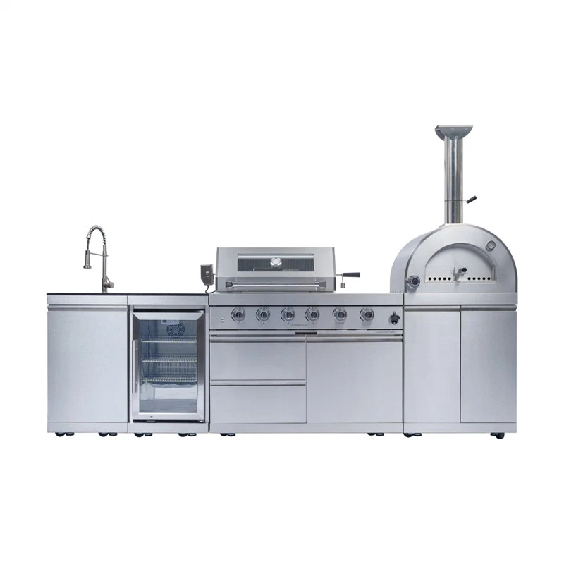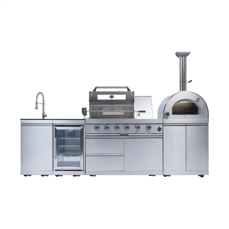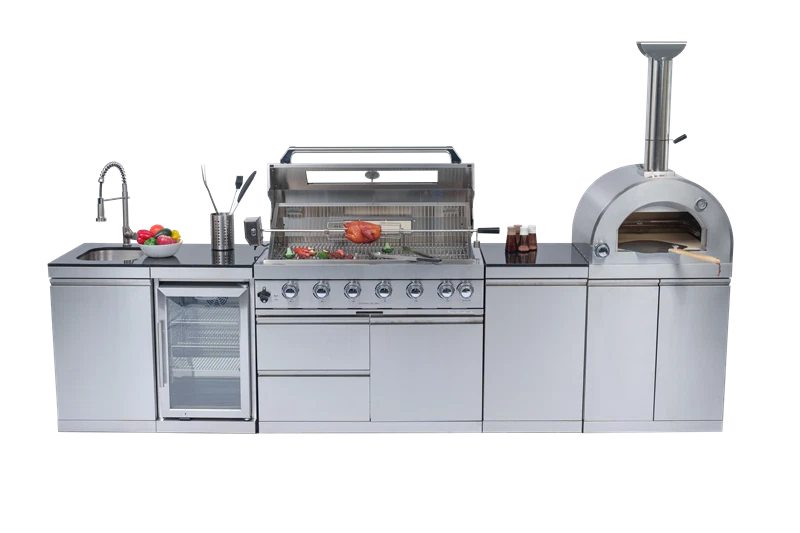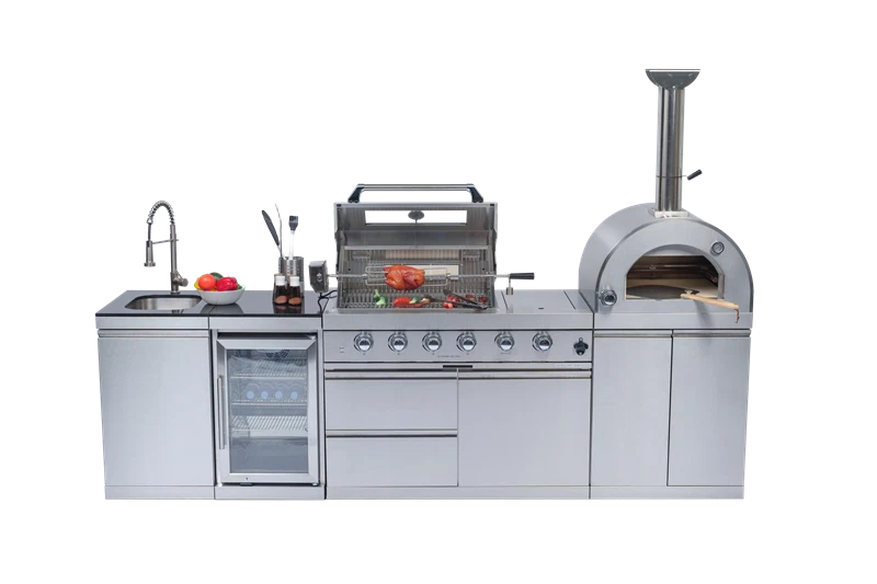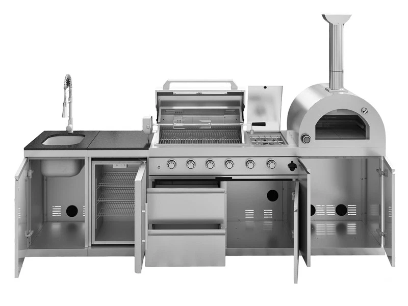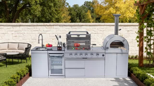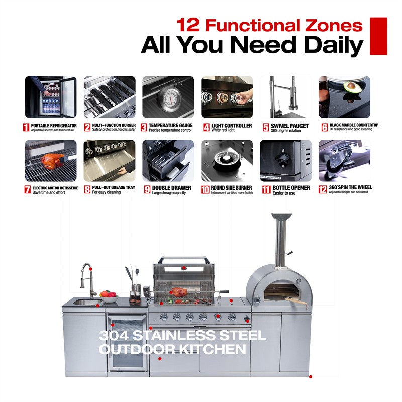 Deluxe Outd oor Kitchen Gas Grill Island This Outdoor Kitchen Island is designed to transform your backyard into a gourmet chef's paradise. With its smooth stainless steel surface, granite countertops, wine cooler, and ample storage, this grill island is not just a cooking appliance—it's a statement piece for your outdoor living space. Advanced Design Features Spacious Cooking Area Enjoy a generous 684 square inches of cooking space, perfect for grilling a variety of dishes simultaneously. Accurate Temperature Gauge Saves time & effort. Evenly roasts food (like the juicy chicken). Set it, let it work—freeing you to prep other parts of the meal. Control Knob Lighting Red and white control knob lights add a stylish touch and enhance visibility. Easy-Cleaning An easy-access grease tray simplifies maintenance, keeping your grill in top condition. Convenient Bottle Opener This integrated bottle opener on our grill is designed for easy use, allowing you to quickly pop open your favorite beverages while grilling. Convenient Storage Keep your favorite drinks and snacks close at hand while you grill. Outdoor-Rated Refrigerator Adjustable shelves and a lockable door ensure your beverages and perishables stay fresh and secure. Effortless Push Handle Crafted for smooth movement, it enables you to relocate the grill nimbly, whether you're adjusting its position in the yard or moving it for cleaning. Electric Motor Rotisserie S aves time & effort. Evenly roasts food (e.g., the juicy chicken). Set it, let it run, and focus on other meal prep. Easy Mobility Gliding castor wheels provide increased stability and make it easy to move the grill island as needed. Multi - Function Burner Powerful and safe. With safety features, it ensures food safety. Versatile for searing steaks, slow - cooking veggies, etc. Low Maintenance The durable materials make cleaning and upkeep a breeze, so you can focus on enjoying your outdoor kitchen. Specifications Overall Assembled Dimensions: 112" L x 23" W x 78" H Countertop Height: 36" Product Weight: 540 lbs Main Material: 304 Marine-Grade Stainless Steel Countertop Material: Black Galaxy Granite Total BTU Output: 72,000 (Includes main, rear infrared, and side burners)+ 35,000 BTU( Pizza oven, cooking area of 20.5-inches x 18.8-inches) Number of Main Burners: 4 Tubular Stainless Steel Cooking Area: 485 sq. in. (28" x 18") Cooking Grids: 8mm Stainless Steel Ignition: Electronic Capacity: 68 Liters (60 Cans) Temperature Range: 32°F to 50°F (0°C to 10°C) Door: Stylish Glass Door with Interior LED Lighting Material: 304 Stainless Steel Tap: 360-Degree Swivel Motor: 120V, 4-Watt Heavy-Duty Electric Capacity: Holds up to 25 lbs.