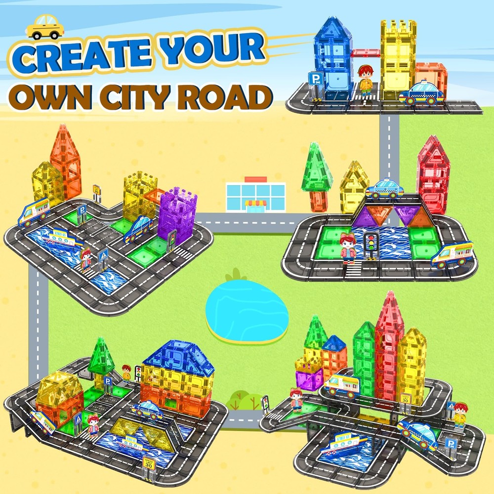 This is a luxurious set of road magnetic tiles, containing a wealth of road elements, so that kids can build houses, roads, trees, bridges and other buildings, not only to bring toddlers happy construction time, but also to develop toddlers' creativity and imagination, is a great set of construction toys! What Makes It Unique - This is a deluxe magnetic tiles road set of 112 pieces, including a variety of personalized components, there are 50 classic magnetic tiles, 38 magnetic road tiles, 8 window tiles, 4 seawater magnet tiles, 4 vehicles tiles, 4 traffic signs tiles, 2 parking spaces tiles, 2 magnet figures tiles. Learning Through Play - Combine learning with our magnetic tiles! The magnetic tiles road set allows kids to stimulate their curiosity and imagination in the process of creating and building city roads, cultivating their STEM skills and hand-eye collaboration, from spatial awareness to the development of problem solving skills, and it is a great set of toys for toddlers to learn while playing! Safety and Durability - Safety is our top priority, and our magnetic tiles are made of safe and durable food-grade ABS plastic with smooth surfaces and rounded edges to protect small hands from scratches. Make sure parents don't worry and kids have plenty of play! Always Compatible - magnetic tiles road set are designed with standard size make it compatible with major brands in markets. Making it a perfect addition to any magnetic tiles collection, allowing for endless play possibilities and expanding kids' collection and providing hours of gaming entertainment. Suitable for All Ages - This magnetic tiles road set offers a wonderful experience for kids of all ages, making it the perfect choice for fun games, early education, family bonding and outdoor play activities. Whether it's a birthday, Christmas, school classroom, and any other special occasion, this is a beloved gift for 3+ years old boys & girls.