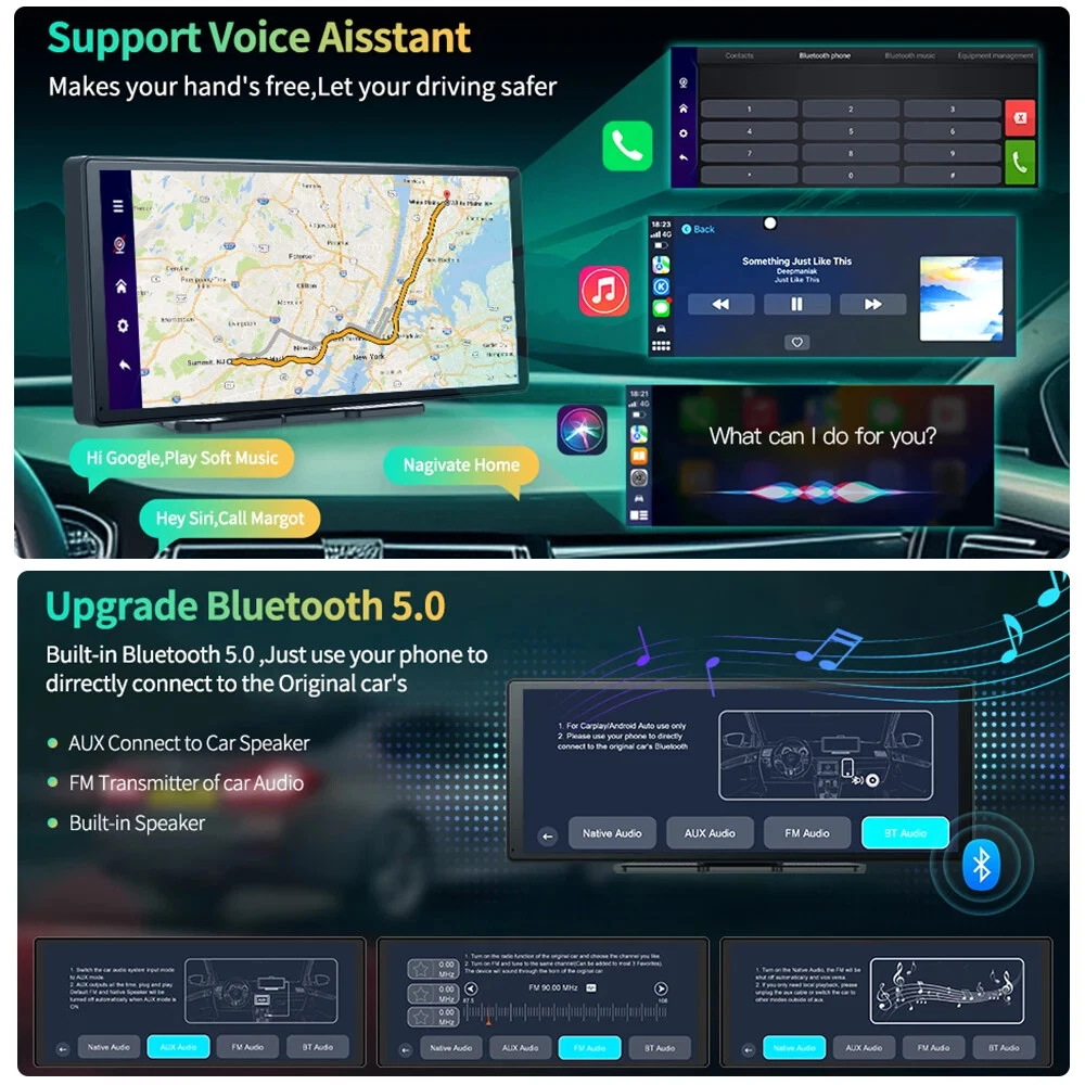Quick Start-Up Experience a lightning-fast 5-second start-up with our 4-core chip, ensuring a smooth and seamless Carplay screen without any delay. 2 Cameras-3 Recording Channels Front 4K 2160P + Rear 1080P Record 11.3 Inch ultra wide-angle full view touch screen, capturing license plates, road signs, and other critical details on the road. Very clear and smooth images display as like a stream flowing on the excellent WDR streaming mirror. Supports simultaneous 1:1 display of front and rear cameras. (The rear camera and cable require purchasing the dual lens option.) Wireless CarPlay & Android Auto Wireless CarPlay &Android Auto, which can adapt to more mobile phone models, enabling you to use mobile phone functions intelligently and safely when driving the vehicle.Except Huawei Wireless Phone Link Via Airplay(for Apple mobile phone) and Miracast(for Android mobile phone),You can watch the video,and play the games on the device. Advanced Driver Assistance System (ADAS) H50 goes beyond exceptional audio experience by featuring an advanced ADAS. Stay vigilant on the road with features like front vehicle starting reminder, forward collision warning, and lane departure warning. Drive with confidence, knowing you have an extra set of eyes keeping you safe. 6 Ul options H50 has 3 Full Screen Theme Ul and 3 Split Screen Theme Ul. Choose Theme Ul What you like. Multiple Screen Display High Fidelity Audio Output: Upgrade Bluetooth 5.0 Are you concerned about the sound quality of the product? You don't need to worry at all, because H50 Build in multi chip audio output mode, allowing H50 to seamless connect to car audio, Wireless Bluetooth or FM output or wired AUX audio output can be selected, and high fidelity audio output can be retained (Include AUX Cable) Support Voice Aisstant Makes your hand's free,Let your driving safer In-app video download & real-time viewing The scenery of a journey is always beautiful. H50 records exciting scenery at any time. When you need images or videos, you can connect to the device through the app to export them, share them on social media in a timely manner, or provide evidence for insurance. 24-hour Parking Monitoring Monitor changes in the surrounding environment when the vehicle is stopped, and automatically record video when the vehicle collides (Need to purchase ACC hardwire kit separately) Loop Recording H50 Will auto-delete older files for new recording when the SD card is full,you will never lack data storage space. Full Screen Reversing Are you worried about the safety behind the car when reversing? When reversing, the system will automatically turn on the high-definition reversing camera at the rear of the car and clearly display the state of the rear of the car on the reverse IPS screen, so that you can accurately grasp the road conditions at the rear. It also performs well in rainy and dusty weather. Packing List: 1 x 11.3 inch dash camera body; 1 x Soft Bottom adhesive bracket; 1 x 6m Rear Camera(optional); 1 x GPS Antenna (optional); 1 x AUX Cable 1 x Car Charger How to install the GPS NOTE: The charger in the package must be used to connect to power in the car, the device will not work using a USB cable.