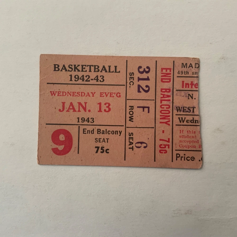 VG. January 13, 1943 - Madison Square Garden. Ticket stub from college basketball game between NYU and West Virginia. The Mountaineers were the defending NIT champs from the prior year, and NYU made the NCAA Tournament in March, but lost in the opening round.