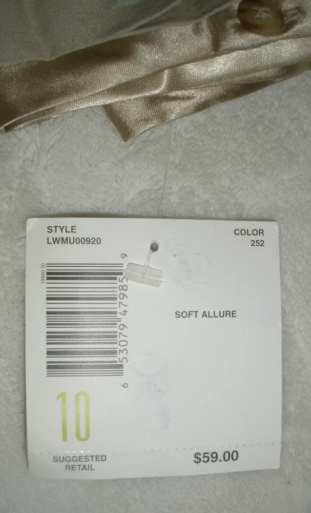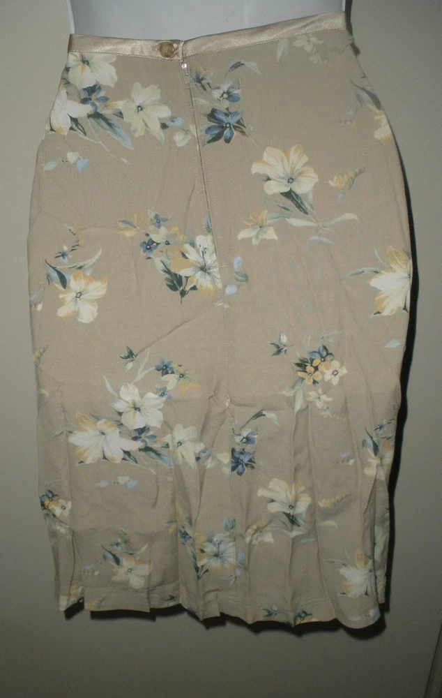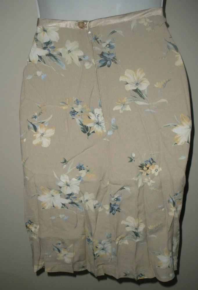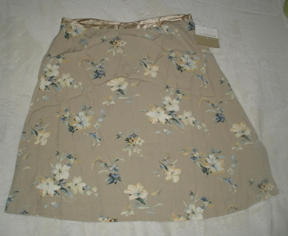this is for Liz Claiborne Lizwear Skirt It is new with tags. It has no rips, tears or stains. IT is made of rayon The skirt is tan. It has an all over print. It has satin ribbon accent on the waistline. It has zipper down the back. IT is lightweight. Liz claiborne calls it Soft Allure. The waist measures laying flat 15" It measures down the back 22". It is a size 10 Manufacturers sizing's due vary please check measurements. If you have any questions or problems - before or after. Please message me.