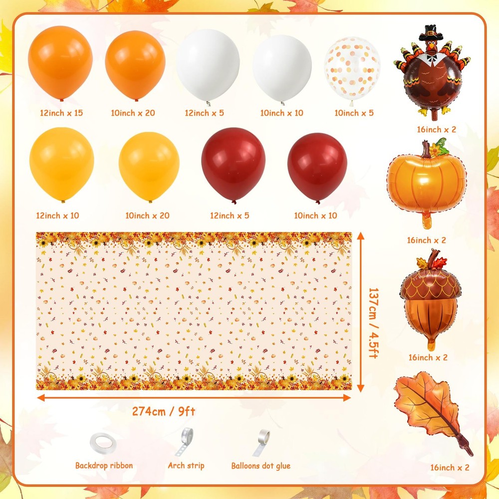 Package Details: 110pcs thanksgiving themed balloons, 1pcs little pumpkin thanksgiving tablecloth Premium Material:High Quality Materials-Our balloons are made of high quality latex materials, durable. You will get a beautiful little pumpkin thanksgiving themed balloon garland that will leave you with unforgettable memories Easy To Assemble:We provided 3 tools to help you make little pumpkin thanksgiving themed balloon arch easily and quickly, the mylar balloons can be pasted onto the balloon garland or background wall by using dot glue to add more elements to your party Suitable for a Variety of Occasions: The little pumpkin thanksgiving balloons come in full, vibrant colors and add infinite vibrancy to your party. The little pumpkin thanksgiving themed balloon garland kit is suitable for any party event such as thanksgiving, pumpkin 1st birthday, pumpkin baby shower and more Service Gusrantee:Providing customers with products and services is our RHGBINLI goal. If you have any questions or suggestions about product, please feel free to email us. We will get back to you within 24 hours