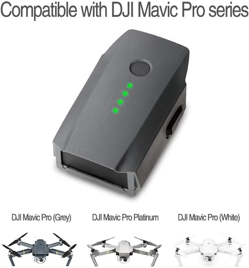 Product Description Specifications: Battery type: Lithium-Polymer Battery Output voltage: 11.4V Capacity: 3830mAh Power: 43.6Wh Battery Weight: 230g /8.11oz Power ON/OFF: Press once and holder the circular power button for 2 seconds to power on/off Compatible with: DJI Mavic Pro DJI Mavic Pro Platinum DJI Mavic Pro Alpine White Original DJI Mavic Pro Charger Not compatible with DJI Marvic 2 Package includes 2 x Battery for DJI Mavic Pro Drones NOTE: Please fully charged the battery before the first-time flight, and make several times flight test to make sure the battery fits your Mavic Pro Drone. And better charge with the OEM charger to avoid problems. Product Guarantee: Any problem, please feel free to contact us. Please click the "Ask a question" on our storefront or in "YOUR ORDER" options click the "contact seller". Tips: 1. Please fully charge the battery before each use. 2. Do not subject batteries to adverse conditions such as extreme temperature, deep cycling. Never leave a charging lithium battery unattended. 3. When the battery is unused, please take it out from the drone and store it in a dry, clean, cool, away from heat and metal objects. 4. When the battery is not used for a long time, we recommend using the battery at least once every two to three weeks. 5. After use, it is recommended that the battery be cooled and then recharged.
