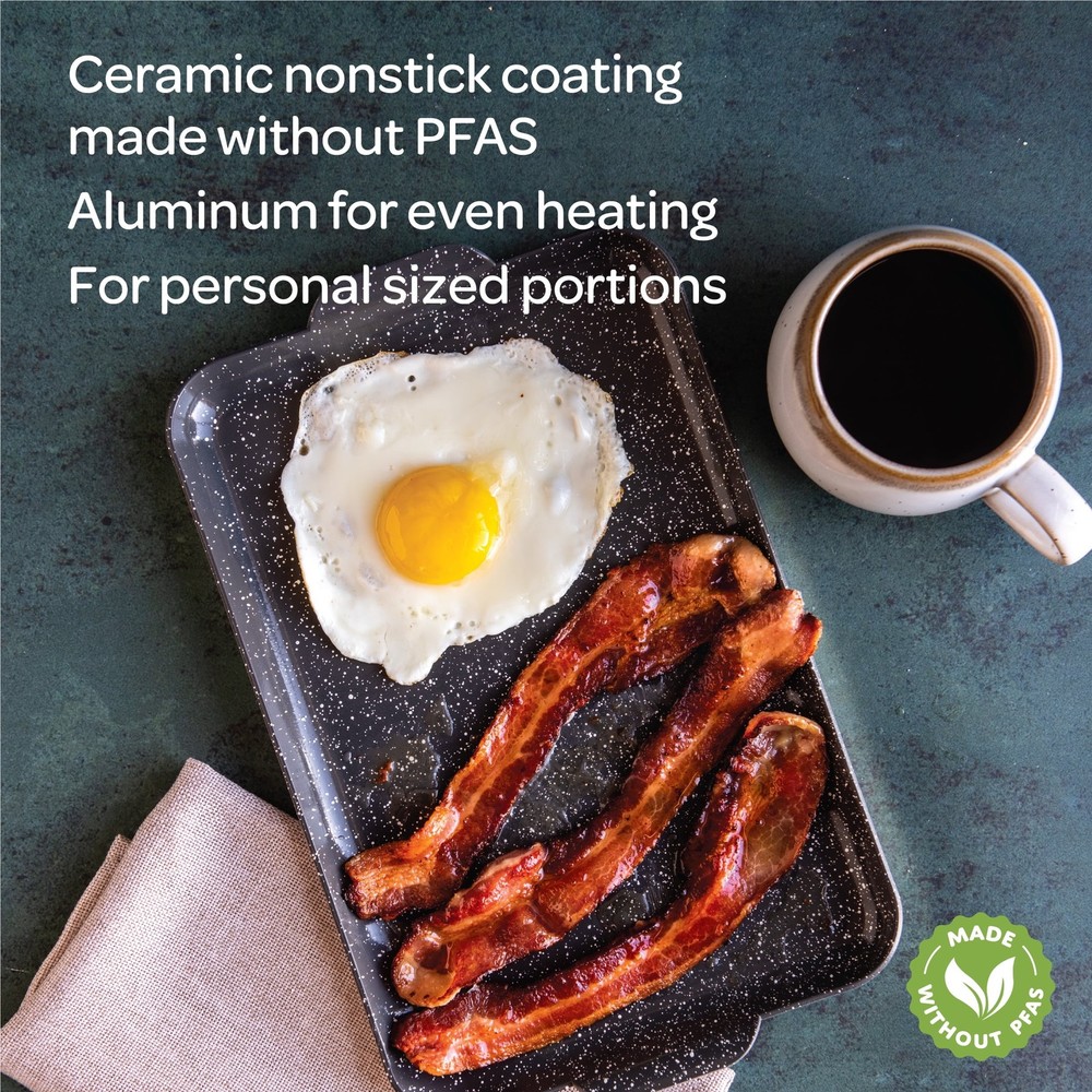 Our best-selling griddle is now available in a personal size! Meet the Mini Griddle, ready for personal portions of pancakes, grilled cheese, eggs, French toast, bacon and more. Nonstick ceramic coated and sized for 1-2 portions, this griddle spans 1 burner and heats rapidly and evenly, thanks to its aluminum construction. The Nonstick ceramic coating is very durable and provides excellent nonstick performance. Its natural uncoated backside makes for a longer-lasting, more durable surface that can even be used directly on your barbeque grill or over a camping stove. Lightweight and easy to take along, this griddle is suited for backpacking, car camping, and RV cooking if you’re the adventurous sort, but it’s equally suited for use right in the comfort of your own kitchen or dorm. Compatible with gas, glass top and electric stoves. We predict this will become a frequently used kitchen companion in your home. Made by Nordic Ware, a family owned company. Dimensions: 11.5" x 7.2" x 1" Material: Aluminum for even heat distribution Ceramic nonstick coating Color: Gray Nonstick surface allows for easy food release and cleanup Hand wash in warm soapy water recommended Dishwasher use is not advised, as it may shorten the life of the nonstick coating and cause cosmetic discoloration on exposed aluminum surfaces Use nylon, wood, or silicone utensils to maintain nonstick performance and prevent scratching