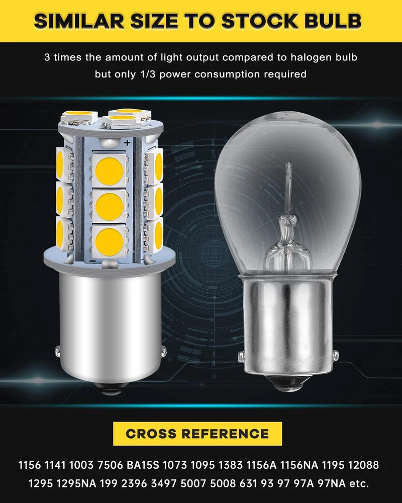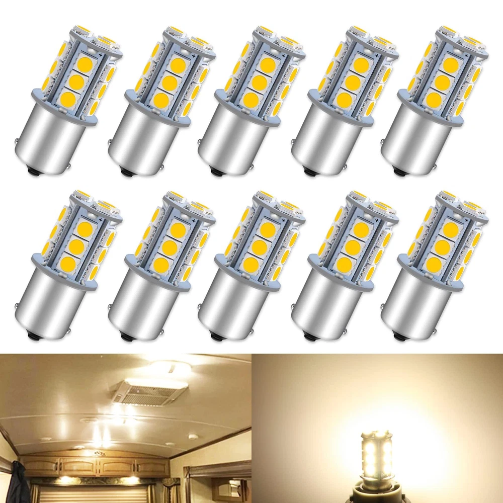 【Specification】Pack of 10 1156 led bulb. Voltage:12V DC. Power: 1.7W. LED chips: 5050 18SMD. 1141 led bulb rv warm white 3000K. 250Lum/bulb, 360° beam angle. Size: 43mm/1.69" * 19mm/0.75". Brighter and more comfortable rv light bulbs to provide you with a warm interior space 【Fitment】Compared to other cheap 1156 led bulbs, our cec 1141 led bulb is better and more sturdy, chips don't come off easily. Fits 1156 1141 1003 7506 BA15S 1073 1095 1383 1156A 1156NA 1195 12088 1295 1295NA 199 2396 3497 5007 5008 631 93 97 97A 97NA base 【Feature】7506 led bulb are 300% brighter than halogen bulb and more energy efficient, low power consumption. 1156 led light bulb with good heat dissipation, extend service life 【Upgrade Your Car】1003 12v led bulbs are used in many scenarios, such as rv interior light bulbs, camper led light bulb, travel trailer led bulb, motorhome, boat, 5th Wheel, turn signal lights, center high mount stop lights, lawn tractor light etc 【Buy with Confidence】Our 1156 BA15S 7506 1141 rv led light bulbs have passed testing, in terms of quality you can rest assured. Any question, please feel free to contact us