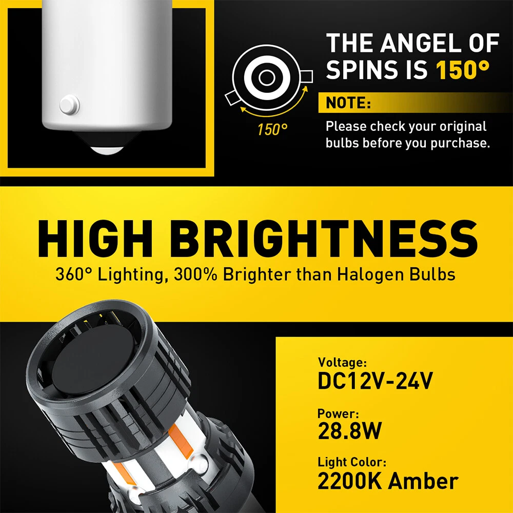 Specification: Model:BAU15S (150°) Lumens: 2000Lm/per bulb, 4000LM/per Set Color Temperature: 2200K Amber LED Chip: High Power 8pcs 1860 SMD Voltage(V): DC 12-24V (only fit 12V cars) Beam Type: 360°Beam Angle Lifetime: More than 30000 hours Certified by: CE & ROHs Warranty: 2 YEARS Applicable Used as a: Turn signal light Easy installation, just plug & play Suitable For Pickup, Wagon, UTB, Cab, ATV, SUV, Jeep, Truck, Bus etc. Features: *Safety Protection 1156PY BAU15S PY21W Amber LED Rear Turn Signal Light Bulbs Bright No Hyper Flash Specification: Model: BAU15S (150°) Lumens: 2000Lm/per bulb, 4000LM/per Set Color Temperature: 2200K Amber LED Chip: High Power 8pcs 1860 SMD Voltage(V): DC 12-24V (only fit 12V cars) Beam Type: 360°Beam Angle Lifetime: More than 30000 hours Certified by: CE & ROHs Warranty: 2 YEARS Applicable Used as a: Turn signal light Easy installation, just plug & play Suitable For Pickup, Wagon, UTB, Cab, ATV, SUV, Jeep, Truck, Bus etc. Features: *Safety Protection The 6063 aluminum construction in the led turn signal bulb will protect bulbs against excessive current and overheating and ensure a longer lifespan with low energy consumption. *High Brightness Each bulb has 8pcs high-quality LED chips to make your turn signal light noticed immediately. The 1680 light source is close to the halogen lamp of the original one. *Simple installation Perfect replacement of the original LED bulbs. *Double Heat Dissipation Aircraft-grade aluminum body built and fan design increases the heat dissipation area. *High decoding rate The decoding rate is higher and can solve most decoding problems compared with the old one. *Important Note: These LED bulbs are used as turn signal lights ONLY. (They are single function, and could not be used as day running light or parking light function) Package Included: 2x BAU15S ( 150° ) LED Turn Signal Light Bulbs Notice: ☛This item is designed for easy DIY installation & direct replacement. ☛Please notice that LED is a low power consumption product and error code might be occurred for some European car. ☛You can simply add a load resistor or decoder to bypass the flecking or error code issue. Resistor or decoder does not included in this listing. ☛Communication is the best way to solve the problem. If you have any problems after purchasing, please contact us in time, before opening return or case. Item Specifics Features Ballast Included CANbus Compatible Bulb Fitment Code BAU15S/7507/PY21W Manufacturer Warranty 1 Year OE/OEM Part Number 8PC-1860SMD-BAU15S-4KP8 Voltage 9V-16V Fitment Type Direct Replacement Ballast Included Yes Performance Part Yes Lighting Technology LED Suitable For Turn Signal Light To Fit Turn Signal Light Bulb Type LED UPC 782890728522 Model EAA-CANBUS-4KP8-PY21W It also fits many other cars As long as your bulb size is the same with this Interchange Part Number 7507/PY21W/1156PY/12496 Color Temperature 2200K Light Color Yellow Number of Bulbs 2 Placement on Vehicle Front Left Right Rear Wattage 28.8W/bulb Waterproof Rating IP67 Waterproof Manufacturer Part Number AUXITO4KP8BAU15S Brand AUXITO Color Amber Package includes 2x LED bulbs Lighting Type Turn Signal Light Available Sizes 3157/3156/1157/1156/7443/7440/T10/T15/31MM/DE3175 Bulb Life Hours Up to 30,000 Hours Type LED Conversion Kit Lumens 1800 lm Universal Fitment Yes Vintage Part Yes Superseded Part Number BUILD IN FAN PLUG AND PLAY STABLE WORKING FAQ ♥ If you have a decoding problem or any other problems, please contact us first, we will help you with it. We will reply you within 24 hours in working days. I'm a new seller, thanks a lot for your trust and convince! I will serve you with all my heart. ♥ Q1: Will this bulb fit my vehicle? A: We can match almost any vehicle to one of our bulb sizes. eBay only lets us include some vehicle fitments per listing, but if your vehicle does not show up on the compatibility table at the top of our listings, welcome you to contact us for free consulation before purchasing a product. Q2: My item has not arrived, what's taking so long? A: Sometimes items take longer than expected, especially if it’s going far or to rural area. Check with your post office to see if your item has been held up. Sometimes Royal Mail will not update a tracking number until it has arrived at its destination. If your item still don't arrive after a few days, let us know so we can double check for you and help solve it asap. Q3: My bulbs won't fit, help! A: Special bulb holder may be required. See if you can take the holder from the stock bulb. If not, let us know. The bulb size may be wrong, double check the item you received with the item you ordered. Do you have an aftermarket lighting housing? These may not be perfectly fitted for aftermarket bulbs and will require some manual modifications. Q4: Neither side lighting up? Both sides flicker, hyper flash, or work inconsistantly. A:Check the light fuses, and then check the ballast plugs to insure correct installation. If this doesn't work, there may be a voltage problem with the vehicle. You probably just need a relay or capacitor. Even though some bulbs are builtin resistors, they may still need a decoder. Pay & Ship (1). We gladly accepts payment via PayPal, We will ship your item(s) within 24 hours. (2). Before payment, please keep the consistency of Paypal address and ebay address. (3). Quantity orders are welcome! Returns (1). We offer 60 days free return policy. Please contact us within 60 days from the date you receive your order if you have any issues with the product or want return. Refund will be send after we got your resend package. (2). All returned items should be in the original packaging , return tracking information should be provided . Contact Us (1).Negative feedback will not help resolve any problems you have, please contact us via eBay messages before leaving negative feedback , our customer service will make best effort to help you with the issues. (2).We maintain hig