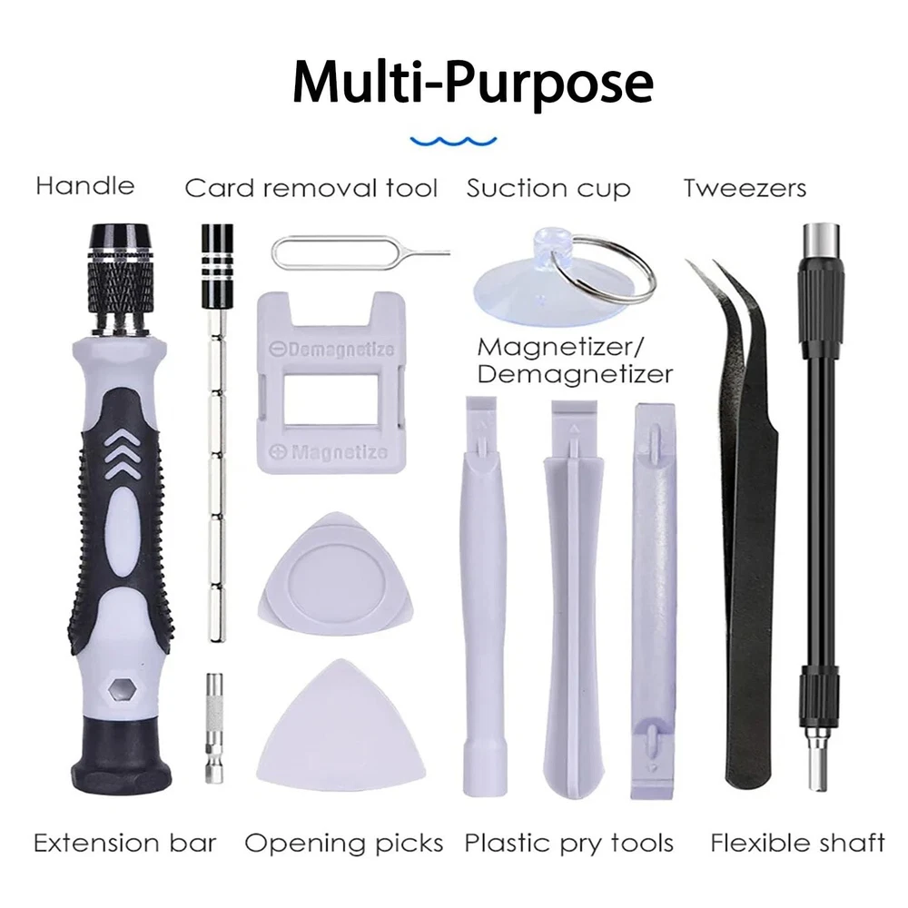 The screw driver set kit Includes Phillips, Flat, Torx, Torx Security, Pentalobe, Hexagon, and more, ensuring you have a compact yet complete repair kit 【Comprehensive 115-in-1 Toolkit】Elevate your repairs with our expertly crafted screwdriver set, featuring 100 versatile bits—Phillips, Flat, Torx, Pentalobe, Hex, and more. This extensive collection is essential for any task, making it a must-have in every home. 【Exceptional Durability】Made from premium Chrome Vanadium Steel, our bits exceed HRC65° hardness for unmatched wear resistance and longevity. The magnetic tips securely hold screws, simplifying the management of even the smallest components 【Bearing Steel Bits & Magnetic】Our small screwdriver set is designed to extend the service life and durability of the hard tempered black oxide shaft. Long-lasting performance guaranteed. Ideal for frequent use 【Robust Storage Solution】Keep your tools secure in our heavy-duty case, featuring a strong latch for safe transport. The molded bit layout ensures quick access to the right tool, saving you time during repairs 【Your Go-To Micro Screwdriver Set】Whether you're a professional or a DIY enthusiast, the Micro Screwdriver Set is perfect for disassembling and repairing devices—from smartphones to laptops. Plus, it comes with a Lifetime Warranty for added peace of mind.