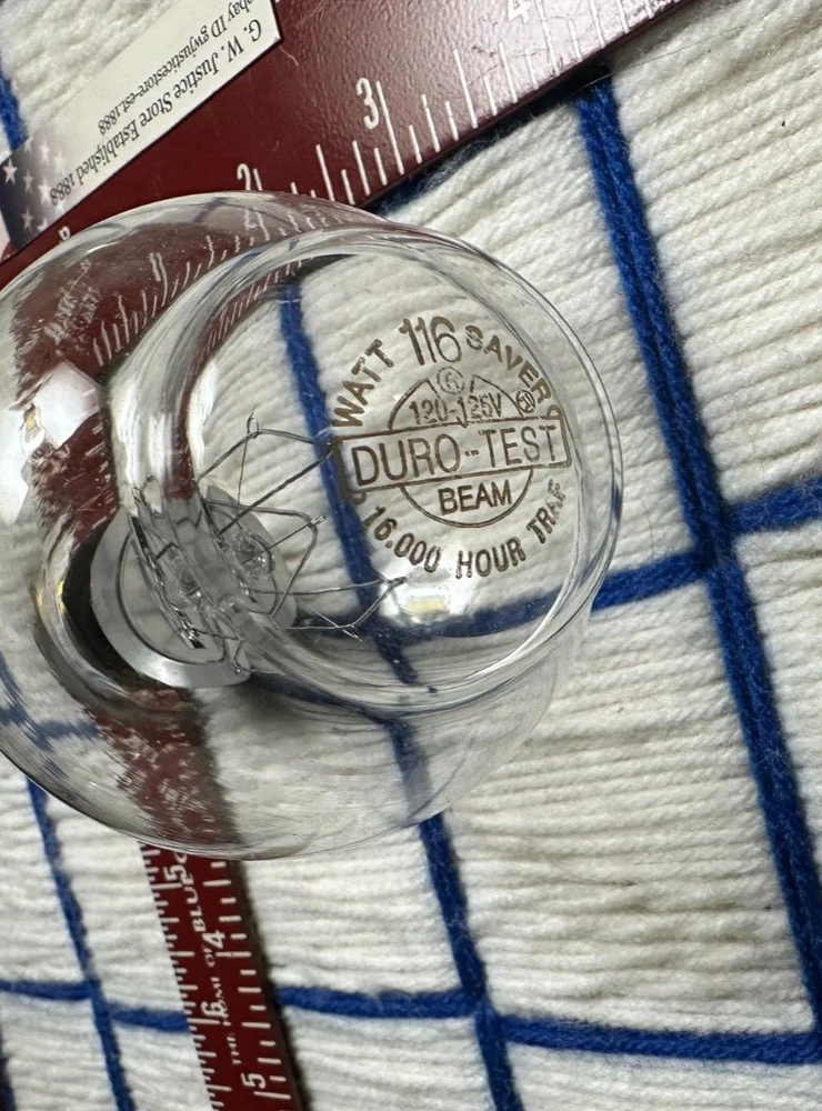 116w traffic signal lamp 120v - 125v clear light bulb 8000 hour 116 watt 1260 lumen tower lamp 120 volt for obstruction rough service world famous Duro-Test brand replacement for Duro-test 424 this is Duro-Test 735 BOX of one SHIPS for $0.07* as an Additional Item G. W. Justice Store Established 1888 "WE DO YOUR DOLLAR JUSTICE" please - contact us with any questions or problems whatsoever for personal Customer Service CALL TOLL FREE (ask eBay for my 800 number) Ships for $0.07* as an Additional Item, to any U. S. Zip Code; including AK, HI, P. R. or U. S. V. I. * Mix & Match SALE $8.88 ships $100.00 or more of qualifying items; or, first item to any U. S. Zip Code; including AK, HI, P. R. or U. S. V. I. and FREE INSURANCE AND FREE UPGRADE TO PRIORITY MAIL WITH DELIVERY CONFIRMATION and Shipping Discount on different qualifying Additional Items see below under "SAVE ON SHIPPING" for details on this and other S & H Discounts YES, WE HAVE MORE IN OUR EBAY STORE if you need 120 volt version of this in Philips see eBay item number 311371413524 or search our eBay store we have MORE SIZES OF TRAFFIC SIGNAL, AS WELL AS OTHER HARD TO FIND AND SPECIALITY BULBS, some ship for only 7 cents each ! (as an Additional Item) bookmark / visit our ebay store http://stores.ebay.com/gwjusticestoreestablished1888 ITEM DESCRIPTION; ONE BULB, BRAND NEW, factory fresh, tower obstruction signal lamp a.k.a. Traffic Signal lamp, for mix & match orders, studio photographic props not included; exact condition is brand new bought factory direct in bulk by us, we are an authorized seller from back in the day, photo approximate, taken in High Noon sunshine, sold as is, no warranty. Originally had one year warranty, no longer in effect. Original packaging will be included whenever possible, especially when bought in pairs, but we do not promise original packaging included, may be hand-wrapped to prevent breakage, . MEASUREMENTS; Length 4 & 3/8ths inches, Diameter 2 & 7/16ths inches M. O. L. 4.438 in 4.438" 3 inch center ELECTRICALLY INTERCHANGEABLE WITH STANDARD bulb, may be used in place of a 116A21 traffic signal lamp, when local codes permit such, with approximate beam candlepower similar, may vary with size of traffic head. CLEAR, multiple use, DECORATIVE, and TRAFFIC SIGNAL light bulb, GREAT FOR table lamps with metal socket rated for this wattage AND MORE, MADE BY Duro-Test in U. S. A. Base Size; regular (Edison, medium) HEAVY DUTY BRASS base, called E26 standard household for U. S. A. single contact medium screw RATED 8,000 HOURS IN TRAFFIC SIGNAL APPLICATION. must be burned base down (as in a table lamp with base pointing to the ground) to horizontal MAY NOT be burned base up. ROUGH SERVICE FILAMENT WITH TWO PRIMARY AND FIVE SECONDARY SUPPORTS, MADE TO WITHSTAND VIBRATION, AND TO BE TURNED ON AND OFF CONSTANTLY. REPLACEMENT FOR: STOCK NUMBERS 22485-7 116A21/TS 9252 870 36101 5 00 46677 22485 6 Traffic signal clear Product Specifications Traffic Sig 116W Med 130V A21 CL 2WR . 049602 Replacement or substitute for: Duro-test 424 and Duro-Test 735 and GE product code 19010 or 116A21/TS this is not an LED nor a fluorescent this is a LEGAL I. N. C. A. N. D. E. S. C. E. N. T. traffic signal LIGHT BULB because it is an appliance grade SIGN SERVICE LIGHT BULB, see page 20 of D. O. E. edict ALL SALES WHOLESALE as per Alabama law; buyer assumes all legal liability as retailer of record once purchased and/or across the Alabama state line; buyer assumes all liability as to Interstate transfer, must be willing to supply record of interstate transshipment, if required by law, sold at absolute auction as per Alabama law, as per "Terms of Sale" published on custom page published on eBay 2004, eBay took all of those down in 2018, that information is now on our Facebook page. Purchaser is buying for resale, all light bulbs should be recycled as per local ordinances and disposed of properly. This applies especially to the U. K. and all EU countries, or any country with laws that apply to the above, such as California Title 20, buyer promises not to purchase as end user if lamp is not legal in your jurisdiction for use. ========================================== mix & match & save ======================================================= SAVE ON SHIPPING ================================== AUTOMATICALLY BY PURCHASING MORE THAN ONE, AND / OR BY ADDING OTHER, DIFFERENT ITEMS FROM OUR EBAY STORE MARKED AS "DISCOUNT AVAILABLE" TO YOUR ORDER PURCHASED ON THE SAME DAY & LOCATED IN THE SAME ZIP CODE Just a very few of our items {such as coffee} are located in different warehouses, or are not discounted due to weight and / or special packaging and handling requirements ========================================= JUST WAIT TO GET AND OK YOUR eBay INVOICE BEFORE YOU PAY (Must use eBay Shopping Cart to Qualify) =================================== We discount shipping instead of the eBay combined shipping because of the vastly different weights and packaging requirements of our various items. Our shipping and handling charge is more about the cost of better packaging than actual postage cost for the most part, and IT IS ABOUT SERVICE Menu of Services Link; http://stores.ebay.com/G-W-Justice-Store-established-1888/Menu-of-Services.html (MISSING LINK; sorry, eBay removed all reviews and guides in 2018, find this information on our Facebook page) ================================================= our FLAT RATE SHIPPING; S & H charge IS THE SAME TO EVERYONE EVERYWHERE IN THE U.S.A. including HI, AK or P. R. and USVI local pickup / delivery / other / SAME PRICE SERVICE MEN AND WOMEN, BE ADVISED, PRICE IS THE SAME TO ANY APO - - fair for one is fair for all http://reviews.ebay.com/Shipping-amp-Handling-Charges-FAIR-OR-NOT-FAIR-the-facts_W0QQugidZ10000000007793201 (MISSING LINK; sorry, eBay removed all reviews and guides in 2018, find this information on our Facebook page) WE ONLY SHIP BY INSURED PRIORITY MAIL WITH DELIVERY CONFIRMATION ON ORDERS OF $1000.00