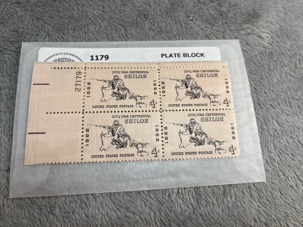 Up for sale is a plate block and single stamp commemorating the American Civil War Centennial. The stamp depicts the Shiloh battlefield and is in mint never hinged condition. The plate block includes four 4-cent stamps and also features the same design as the single stamp. Both items are from the United States and were issued in 1962 with a face value of 4 cents each for a total of 20 cents. The color of the stamps is black and peach blossom. Although ungraded, these items are of high quality and come with no certification.