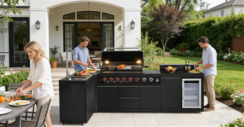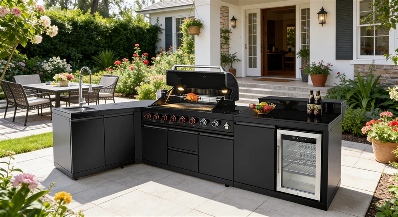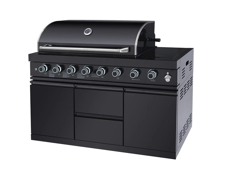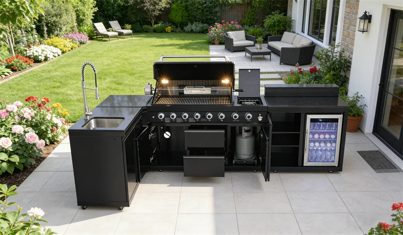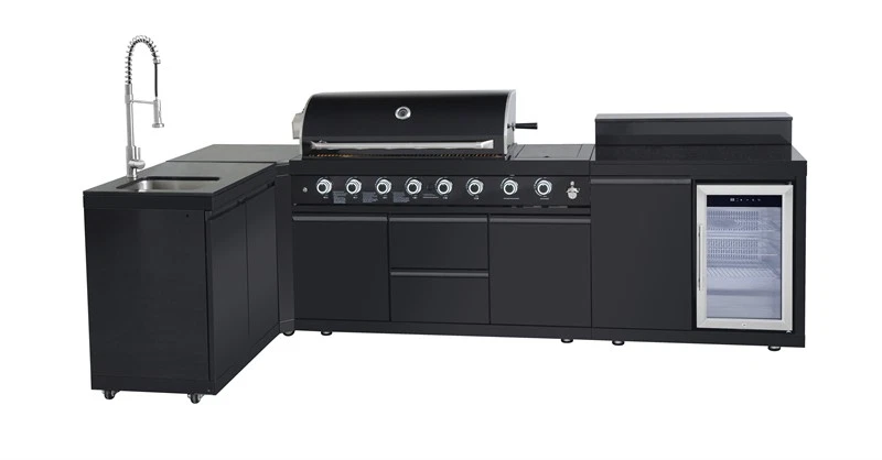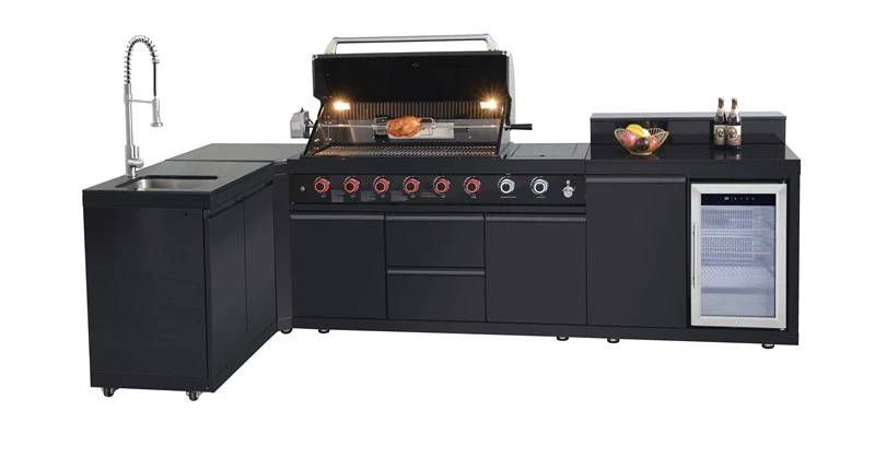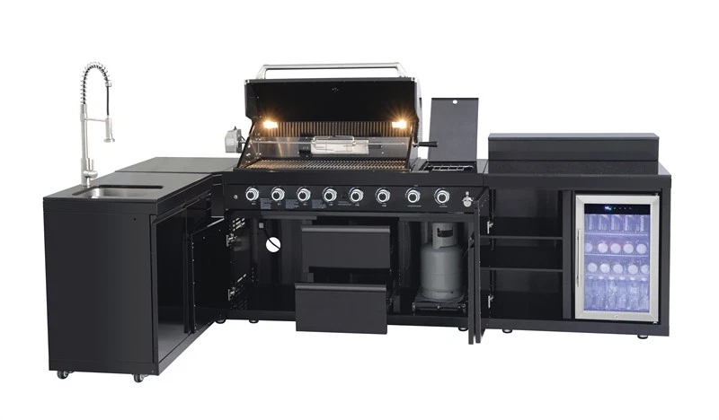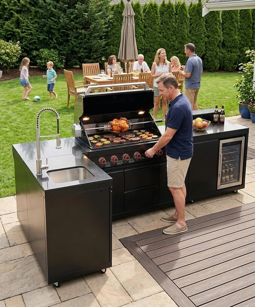 6-Burner 99000 BTU Deluxe Stainless Steel Gas Outdoor Kitchen Bar Barbecue Island Grill + sink with double-door storage cabinet bar counter + Refrigerator + Three-Tier Corner Cabinet Product Features Multifunctional Outdoor Kitchen Island —Combines grilling, refrigeration, dishwashing, and food prep space into a 118-inch-long island countertop. Perfect for backyard barbecues and family gatherings, it delivers a complete outdoor cooking experience. Powerful Heat and Professional Grilling Zone — Equipped with six burners delivering a total heat output of 99,000 BTU and a rotisserie kit, it allows you to quickly sear steaks, roast whole chickens, or cook multiple dishes simultaneously, easily accommodating gatherings of 15 or more people. Premium Materials, Built to Last —Constructed from 304/430 stainless steel with a granite countertop, it offers rust resistance, durability, and easy cleaning while maintaining a stylish, professional appearance in outdoor settings. Versatile Configuration, Conv enient and Practica l —Features an outdoor-grade refrigerator/wine cooler, a stainless steel sink with a faucet, and ample storage cabinets to keep beverages, ingredients, and tools organized and readily accessible. Designed for backyard gatherings —featuring a modular design with casters on the base of each component, allowing for easy movement to the garden or patio. Installation is simple; pre-assembled modules can be connected with just basic tools, saving hours of tedious setup work. Specifications Primary Material: Premium 304 Marine-Grade Stainless Steel Countertop: 5mm Brushed Stainless Steel (Main) & Elegant Granite (Side) Color: Black Stainless Steel Overall Dimensions (Assembled): 118" L x 55" W x 47" H Product Weight: 840 lbs Grate Material: 8mm Stainless Steel Rods Burner Configuration: 4 Main Tubular Stainless Steel Burners + 1 Rear Ceramic Infrared Burner Total Heat Output: 99000 BTU Fuel Type: LPG (To use natural gas, a conversion kit is required. Contact us for details.) Ignition: Electronic Voltage: 120V Included Features: Pull-out propane tank tray, 120V heavy-duty rotisserie (holds 25 lbs), warming rack, hood temperature gauge, halogen cooking lights, control knob indicator lights. Certifications: CSA, ETL, ISO9001, BSCI certified. Packaging: 5 separate wooden crates Product description Previous page The heart of every party—large-scale grilling for the whole family. Next page 1 Family Gathering 2 Essential for Garden 3 Perfect Match Payment 1. We accept paypal and all forms of credit card. 2. Payment is required to be made within 7 days of ordering to avoid a UPI case. Shipping 1. All items are dispatched from our demostic warehouse in CA, GA or NJ, America. 2. Under normal conditions, delivery will take between 3 and 8 working days after dispatch, depending on your location. Remote areas will required longer delivery time. 3. If you're given a tracking number, please use it to track the delivery status of your order. We regret that our warehouse is not accessible to the public. As such, we don't offer a pick-up option. 4. Please note: Some products maybe dispatched in more than one carton, they may arrive at different time. If you only received partial box please don't worry, contact us and we will tell you where are the rest packages. Returns We accept returns, Please contact our customer service team immediately if: 1. You changed your mind and wish to request a return; 2. Your product was damaged during transit; 3. You wish to make a warranty claim for any product you have purchase; 4. You're not satisfied with any product that you have purchased. Please note all returns must be directed to through Customer Service, please do not return or post items before obtaining instructions from us. If you do, there is a risk that your returned item may not be identifiable and accepted. Applicable freight fees will be deducted from your refund incases where you changed your mind and wish to return the product. This also applies to order cancelled while in transit.