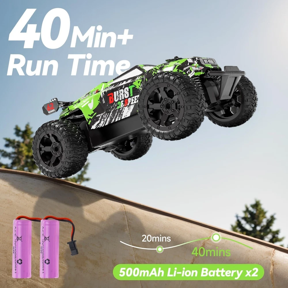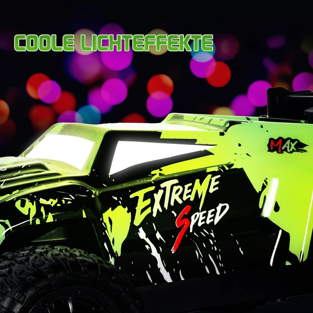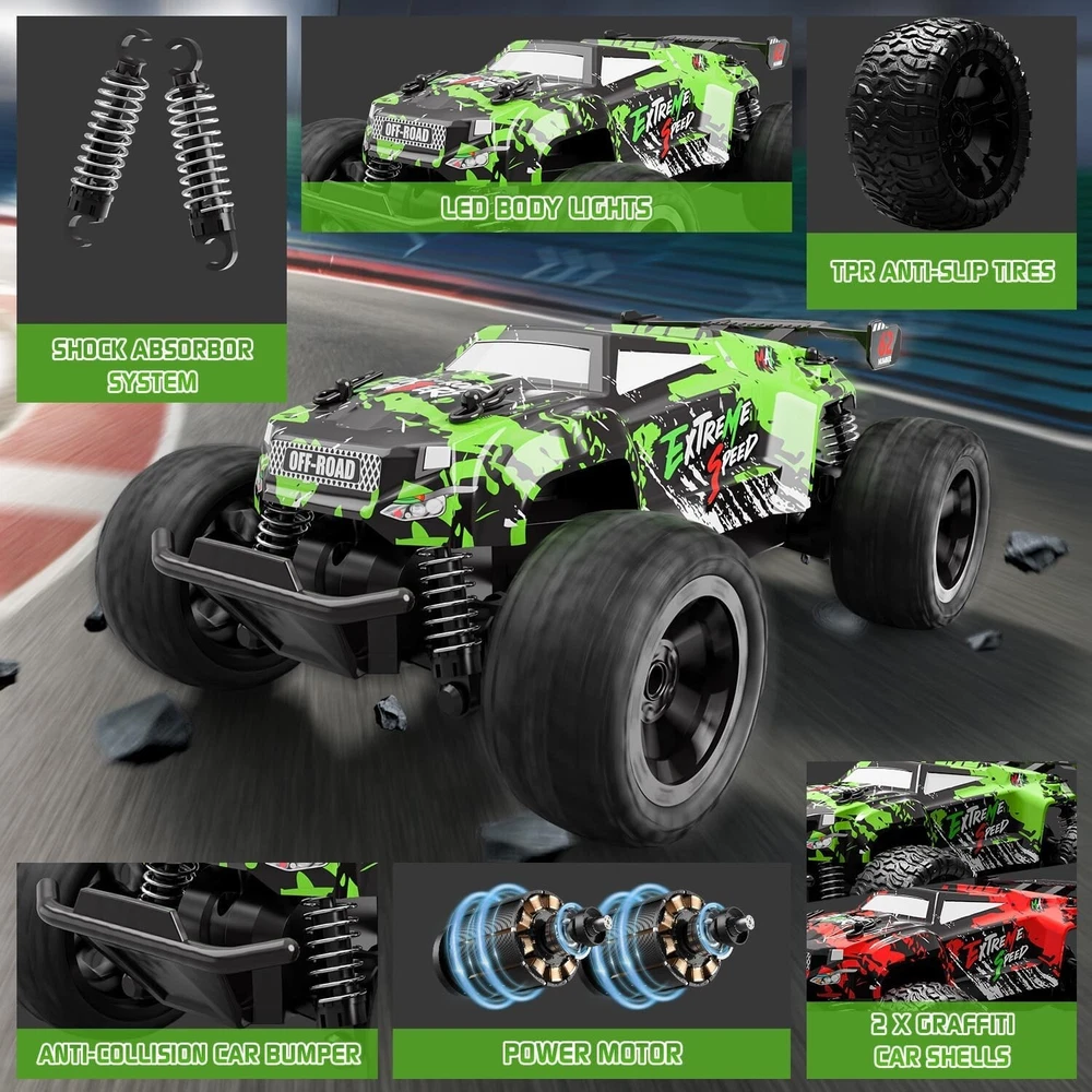 Remote Control Car for Boys 4-7, 2.4Ghz RC Monster Trucks for Boys Age 4-7 & 8-12, 1/18 20 KM/H Off-Road Remote Control Truck Toys W/ 2 Rechargeable Batteries for 40 Min Play, for Boy Girls 【Remote Control Car is a fantastic choice for beginners】 This 1/18 scale remote control monster trucks is equipped with an upgraded motor, reaching top speeds of up to 20 km/h. It not only has excellent acceleration but also allows for agile cornering, making it an easy-to-operate option for beginners. This remote control car for boys 4-7 8-12, serving as an exciting outdoor and indoor toy truck. Its robust structure and dynamic performance promise thrilling experiences, regardless of where your adventures take you. 【Cool Graffiti Car Shells and LED Car Lights】 We have equipped this remote control car with two different color graffiti car shells, so children can choose their favorite color to race. At the same time, we have also fitted the remote control car with cool LED car lights. This allows children to experience the fun of racing even at night. This not only increases visibility for safer night racing but also adds a certain flair to the car's design, making racing even more thrilling and fun.