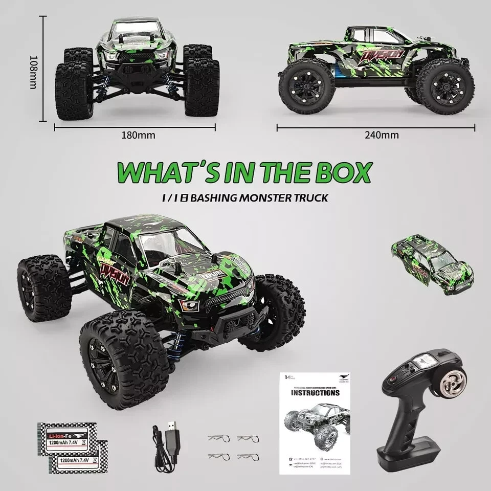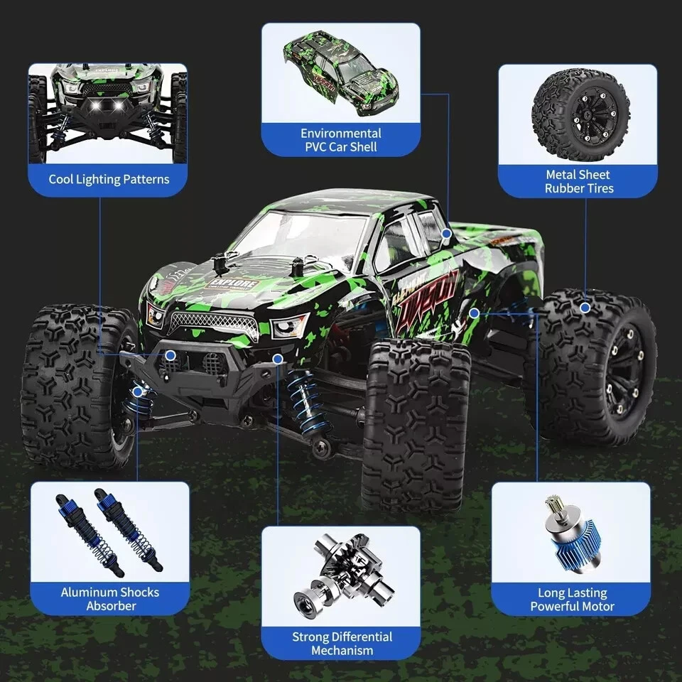 1:18 Scale All Terrain RC Cars, 40KM/H High Speed 4WD Remote Control Car with 2 Rechargeable Batteries This 1:18 all-new high speed rc cars inject with excellent 4-wheel drive performance, increased durability and even more fun. Powered with the fast brushed RC 380 motor in an efficient drivetrain, the remote control truck has a top speed up to 40+ km/h. It's the ideal choice for RC enthusiasts. The larger tires with classic carefully designed tires threads and newly hub metal sheet provide versatility and strong grip for any terrain. This rc monster truck will make you become the focus in the racing. This rc cars for boys age 8-12 equipped with 2.4 GHz full-function remote control system and can be proportionally controlled to throttle and speed. Our rc trucks deliver superior 300 feet range, precision control. Reliable transmission forward, brake and reverse would never fail. High Speed remote control car comes with two long-time service 7.4V rechargeable batteries, you can enjoy the RC fun for 42 minutes a time! Beneath a flexible PVC truck body, quality PA chassis has many properties against collision. All is fulfilled in hobby grade design in independent suspension, durable driveshaft, solid gear differential and classic ball bearings. This rc cars for adults can conquer grassland, sands, rocks, puddles and any bumpy grounds in many weather conditions. Join the TSRC stunning RC world!