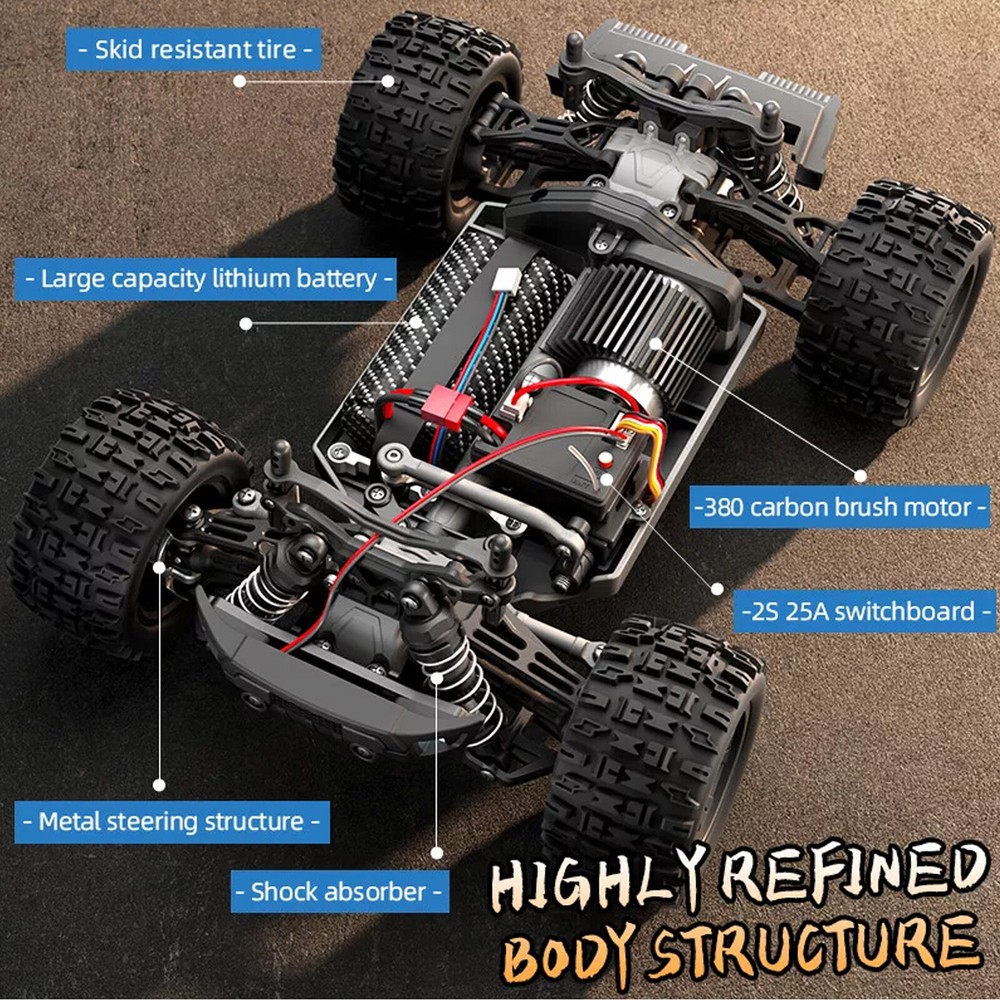 RC Car 1:18 4WD Scale All Terrain 18102 High Speed 4WD Remote Control Product speed (km/h): 28 Product battery: 7.4V 1500mAH lithium-ion battery (T plug) Remote control battery: 3 * "AA" (to be purchased separately) Charging: USB cable charger Remote control time (minutes): 35-40 minutes (continuous full speed running) Charging time (minutes): 180-210 (USB balanced charging) Remote control distance (meters): ≥ 80 Servo: 5-wire, 17g Car light configuration: LED front white light, center white light Differential structure: metal differential (planetary gear) Motor: RC380 high-speed carbon brush strong magnet (magnetic protection+heat sink) Electric tuning/reception: 25A 2S integrated control (splash proof) Remote control category: Fully proportional synchronous control system (gun control) Product Name: Fully Proportional Remote Control Four wheel Drive Bigfoot 1:18 Product frequency: 2.4GHz (supports multiple cars competing on the same field) Product Color: Flower Blue/Red Product Materials: Hardware/Electronics/Plastic Wheelbase parameters (mm): Wheelbase: 165mm, wheelbase: 155mm, wheel diameter: 67mm Single weight (including battery) Kg: 0.75 Single packaging weight (including color box) 1.5Kg 7.4V 1500mAH Weight (g): 91.7 Gross weight/net weight (kg): 13.5/12 Remote control specifications (cm): 12.6 * 8.2 * 18.5 Product specifications (cm): 25 * 19 * 11 Color box size (cm): 26.3 * 16.5 * 22 1: Charging protection: constant current and constant voltage balanced charging, protection against battery overcharge and overcurrent. 2: Motor anti-stuck protection: When overloaded, the motor stops working. 3: High temperature protection: When the working temperature is higher than the set temperature, the drive control circuit stops working, and resumes working after the temperature drops to a safe value. 4: Electric low voltage power-off function, the battery is lower than about 6.3-6.4V, and the power is automatically cut off to prevent the battery from being damaged by over-discharge. Product configuration 1. Complete vehicle 2. Remote control 3. Chinese and English manuals 4. Lithium battery 5. USB charger 6. Shock absorber adjustment buckle 7. Metal pin 8. Cross screwdriver Product parameters 1. Adopting simulation structure design, it has the control feeling of a real car, realizing full-proportional stepless speed change, high-speed driving, sudden acceleration, deceleration, braking, reversing, left turn, right turn; 2. Applicable sites: flat land, sand, mud, grass. 3. Four-wheel drive: front and rear upright spring shock absorbers, double wishbone independent suspension system; 4. Remote control system: 2.4G full-proportional synchronous remote control system. Full-proportional throttle/steering; 5. ESC: 2.4G splash-proof four-way 30A integrated ESC/receiver; 6. Drive shaft structure: front wheel cross ball universal joint drive shaft, rear wheel split dog bone drive shaft; 7. Servo parameters: five-wire 17G servo; 8. Battery parameters: 7.4V, 18650-1500mAh Li-ion battery (T plug); 9. Ball bearings: 15 ball bearings are used throughout the vehicle; 10. Metal parts: metal underbody reinforcement plate, metal differential, metal gear, metal steering knuckle, metal front and rear arm bracket, metal middle drive shaft; 11. Car shell: The car shell adopts high-toughness explosion-proof PVC car shell; the car shell comes with anti-lost silicone buckle; 12. Lighting: Equipped with LED headlights; (three gear modes: constant light, slow flash, fast flash); 13. Other equipment: equipped with head-up wheels; 14. Other equipment: simulated big-foot tires with strong grip Please Note: Communication is the best way to solve the problem.Your satisfaction is our top priority. We appreciate your positive feedback! We have always been committed to providing the best service and reliable products to every customer. However, accidents may occur at times, and we understand your concerns and setbacks. Please contact us to resolve the issue before leaving negative feedback. We will reply to you as soon as possible. If there is no response within 24 hours, please check the email in your email. Our goal is to provide first-class customer service, so we usually do our best to solve any problems! (Note: Weekend Information Will Be Replied on the Next Working Day)