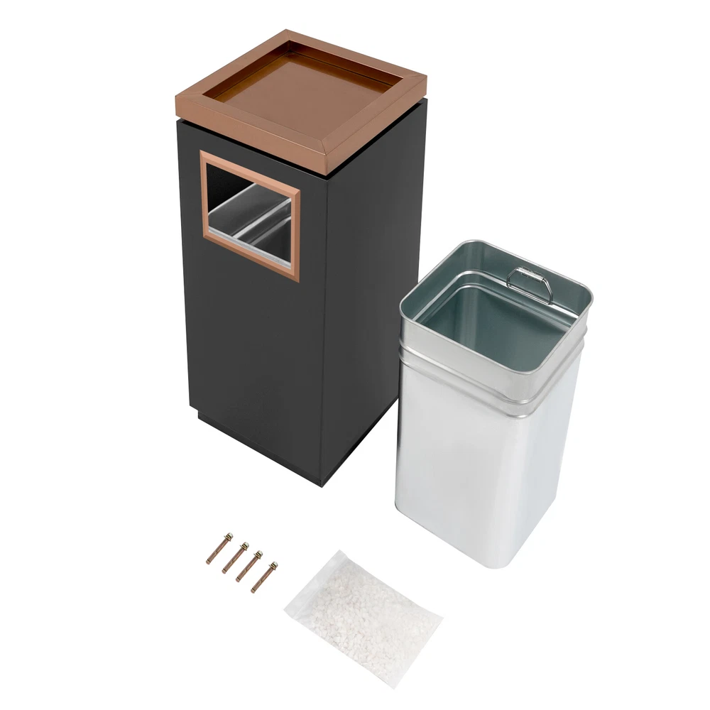 Specifications Color: Black, Rose Gold Material: 201 Stainless Steel, Galvanized Iron Process: Electroplated Mount Type: Floor Mounted Assembly Required: No Capacity: 15L/3.96Gal Product Size: 30*30*72cm/11.81*11.81*28.35in Packaging Size: 32*32*74cm/12.6*12.6*29.13in Gross Weight: 9kg/19.84lbs Net Weight: 8kg/17.64lbs 11.81in Commercial Trash Can Open Top Industrial Garbage Can 15L Capacity Description With solid construction and ample capacity, this trash can be an excellent waste disposal solution for indoor shopping malls. The large opening at the front and the ashtray at the top make it convenient to throw garbage and extinguish cigarette butts from all directions, effectively preventing fires caused by cigarette butts. Additionally, the black and rose gold finish makes this product a great addition to a variety of establishments where it will easily fit in. Key Features Build to Last: The 201 stainless steel, galvanized iron, and electroplated process can protect the product from corrosion, rust, deformation, and abrasion, keeping it glossy and practical for long-term use. Large Capacity: The inner barrel has ample capacity( 3.96gal ) to meet the waste disposal tasks of high-traffic crowds to keep the environment clean. Thoughtful Design: The large opening design allows you to put trash into it with ease. In addition, the ashtray with stones for fire extinguishing prevents hot cigarette butts from directly contacting the product and also prevents it from entering the inner barrel directly and causing fire accidents. Good Appearance: The black and rose gold exterior gives this product a touch of luxury and beauty, making it an ideal complement that can easily blend into a variety of different environments. Easy to Clean: The removable inner barrel allows you to easily dump the garbage. The smooth surface is anti-fingerprint , allowing you to easily clean it with a damp cloth. Simple Installation: Its simple structure and the needed expansion screws allow you to easily and quickly finish the installation. Convenient Design: The inner barrel comes with convenient handles for you to move and carry the barrel and dispose of internal garbage. Customer Service: We aim to provide quality products and services. If you have any problems, please feel free to contact us. We will reply and solve the problem for you as soon as possible. Details Sturdy Base: The thickened and reinforced base is stable, wear-resistant , hard to detach, non-slip , and waterproof , providing sturdy support for the product and preventing the floor from getting scratched. Burr-free Surface: The smooth surface without burrs can protect your hands from getting scratched during installation or in daily use. Application The product is suitable for restaurants, banquet halls, conference venues, cafes, industrial, medical, hallways, hospital corridors, hotel lobbies, office buildings, campuses, kitchens, living rooms, bedrooms, etc. Specifications Color: Black, Rose Gold Material: 201 Stainless Steel, Galvanized Iron Process: Electroplated Mount Type: Floor Mounted Assembly Required: No Capacity: 15L/3.96Gal Product Size: 30*30*72cm/11.81*11.81*28.35in Packaging Size: 32*32*74cm/12.6*12.6*29.13in Gross Weight: 9kg/19.84lbs Net Weight: 8kg/17.64lbs Package Included 1* Trash Can Other Needed Accessories Notes Please check the size carefully before ordering. It is normal that the expansion screw will blow up after the force is applied. Please allow the slight color difference caused by the shooting light and 1-3cm error due to manual measurement, and make sure you do not mind before you order. Payment Delivery details Terms of sales About us Contact us Payment We accept ebay payment 。 Fees such as import duties, taxes are not included in the item price or shipping costs. These charges are the buyer's responsibility. Delivery details Shipping: 2-9 working days to: USA Terms of sales We maintain high standards of excellence and strive for hundred percent customer satisfaction. Feedback is very important to us. We hope that you contact us immediately before you give neutral or negative feedback, so that we can address your concerns. It is impossible to address issues if we do not know about them! About us Your satis faction is our ultimate goal. We work hard to earn your trust and future business. Our certified technicians have tested each item before shipping. The unit comes with 1 year limited warranty on all manufacturing defects. a) If you receive a defective item, you may return it or ask for a discount. Please contact us within 14 days after you receive the package. b) What you returned must be intact and in its original packaging as re? u. Customer is responsible for shipping costs of the returned item. c) We will cover the cost of shipping back t with the shipping rate indicated in the registration page. We will send you a new unit or refund the full payment you paid. Thank you. Contact us Business Hour Business Hour: Monday To Friday: 8:30 AM to 5:00 PM (Beijing China time) Due to time zones, our reply to your questions may not be immediately. But within above working time, we will reply your email within 24 hours. If it's non-workdays, please kindly be patient and wait till Monday. Please contact us with ebay message. Please feel free to contact us if you have any questions. Monday To Friday: 8:30 AM to 5:00 PM (Beijing China time) Due to time zones, our reply to your questions may not be immediately. But within above working time, we will reply your email within 24 hours. If it's non-workdays, please kindly be patient and wait till Monday. Please contact us with ebay message. Please feel free to contact us if you have any questions. Brand Unbranded Item Height 72cm/28.35in Item Length 30cm/11.81in Item Width 30cm/11.81in Type Trash Can Room Home Office/Study Material 201 Stainless Steel, Galvanized Iron Color Black, Rose Gold Size 30*30*72cm/11.81*11.81*28.35in Capacity 15L/3.96Gal MPN Does not apply Shape Rectangle 