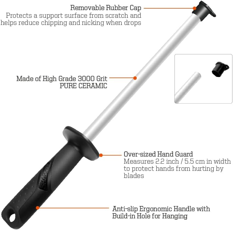 Store New Arrivals Add to Favorite View Feedback Contact 118N Professional Ceramic Sharpening Fine Honing Rod Steel Kitchen Knife Sharpener Stick, with Anti-Breaking Cap Description Item model number 118N Number of Items 1 Color Black, Silver Material Ceramic Honing Rod with Over-sized Hand Guard Material Type Ceramic Honing Rod with Over-sized Hand Guard Item Weight 259 Grams Grit Type Light Product Dimensions 15.16"L x 2.2"W x 2.09"H Manufacturer Inc. Ideal for Valuable Knives of HIGH HARDNESS – Made of high grade 3000 grit PURE ceramic, a material close in hardness to diamond, harder than most of super hard steel that being used by knife manufacturers Hones and Realigns Cutting Edge – Unlike a knife sharpener that takes off too much of your knife’s edge metal, this ceramic honing rod is used to roll the edge back to its original position and keep it at the ideal angle for maximum sharpness. Regular use extends the life of your cutlery. Removable rubber cap to protect a support surface from scratch as well as to reduce chipping and nicking when drops Anti-slip ergonomic handle with over-sized hand guard for safety 3 YEARS of Commitment and Superior After-Sale Service: SHARPAL, headquartered in California, USA, with branches in Germany and Australia, provides easy and effective sharpening solutions. All products undergo rigorous testing to ensure top-tier performance and durability. Product description Note: Ceramic material is fantastically wear-resistant but can easily get broken. Don’t drop the ceramic rod or hit it against hard surface. To clean the ceramic surface, scrub in warm water using a mild brush and a kitchen cleansing powder. About SHARPAL Sharpal Inc. is a leading manufacturer of professional and patented multifunction knife and tool sharpeners for the outdoor and sports, garden and workshop, and culinary and kitchen industries. For more than 25 years we have been passionately researching and developing quality products, which provide consumers with an easy and cost-effective way to obtain a sharp edge. SHARPAL Ceramic Sharpening Rod Ceramic grit: 3000 Rod material: white pure ceramic Ceramic rod length: 10 Inch Ceramic rod diameter: 0.57 Inch Total length: 15 Inch Hardness: 9 Mohs Made of high grade pure 3000 grit ceramic Hones and realigns cutting edge Removable rubber cap to protect a support surface from scratch as well as to reduce chipping and nicking when drops Slip-resistant plastic handle Oversized hand guard for safety Built-in hole for hanging Sharpen most of super hard steel that being used by knife manufacturers including Non-Stainless Steels D2, A2, W-2, 10-series (1095, 1084, 1070, 1060, 1050, etc.), O1, Carbon V, 50100-B (0170-6), 5160, CPM 10V Stainless Steels 420 (420J), 440A (and similar grades including 425M, 420HC, and 6A), 440C (and similar grades including Gin-1, ATS-55, 8A), 154CM (ATS-34), VG-10, S30V, S60V (CPM T440V) / S90V (CPM T420V), 12C27, AUS-6 / AUS-8 / AUS-10 (also 6A / 8A / 10A), ATS-34, BG-42, Damascus Steel Key Features Premium Pure Ceramic Material Made of high grade pure ceramic, a material close in hardness to diamond, harder than most of super hard steel that being used by knife manufacturers Protective Rubber Cap Note : If use this product free hand instead of having the rod tip supported by table, to prevent rubber cap from being cut away by knife, remove the cap from the rod tip Protect a support surface from scratch Reduce chipping and nicking when drops Over-sized Safety Hand Guard The hand guard measures 2.2 inches in width to protect hands from hurting by blades. Anti-slip Ergonomic Handle Slip-resistant plastic handle Built-in hole for hanging How to Use 1. Position the sharpening rod vertically point down on a cutting board, table or other suitable surface. (See Fig. 1) Apply sufficient downward pressure on the sharpening rod to avoid slip during the sharpening process. 2. Angle between the knife blade and sharpening rod should be approximately 20 degrees. (See Fig. 2). 3. Place heel of your knife blade at the top of the sharpening rod at approximately 20 degrees. With consistent downward pressure, push the knife downward along the rod while pulling the knife towards you from heel to tip of the knife blade. (See Fig. 3) 4. Repeat this action on the opposite side of the knife blade. (See Fig. 4) 5. Repeat Step 3 & 4 until knife is sharp. Always take alternating passes with your knife across the sharpening rod applying appropriate pressure. ABOUT US We offer the best prices around on high quality products. Our E-store includes media such as books, movies, music and games while offering electronics, toys, sporting apparel, clothing, tools, general home, garden items and more. SHIPPING We are always working hard to ensure your package arrives as soon as possible. Please understand that some factors like weather, high postal traffic, and the performance of shipping companies are outside of our control. We offer free shipping to the lower 48 states and ship within 2 business days of payment, usually sooner. We do not accept P.O. Boxes. Please provide a physical address. RETURNS We offer a 30-Day Return Policy on items which you are not completely satisfied with. You have the option for a full-refund or an exchange of the item. No returns are available on items shipped outside of the USA. PAYMENT We accept PayPal. CONTACT US This page content is yet to come Please ad us to your favorite seller and visit again later Thank You CUSTOMER SATISFACTION We try our very best to make sure every customer is completely satisfied. If there's a problem, message us! We're happy to help.