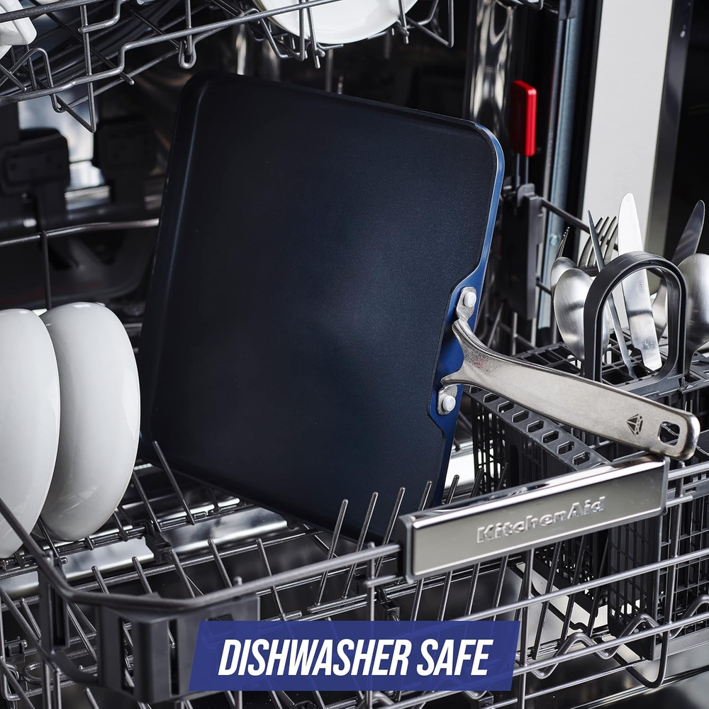 DIAMOND INFUSED CERAMIC NONSTICK: Our signature diamond-infused ceramic nonstick is 5x harder and 10x longer lasting than traditional coatings. LARGE COOKING SURFACE: 11" Griddle Pan provides ample space for cooking. TOXIN-FREE: Free of PFAS, PFOA, lead, and cadmium for healthier cooking. DURABLE CONSTRUCTION: Heavy-duty base prevents warping, wobbling, or degrading over time. VERSATILE USE: Oven and broiler safe up to 600°F for flexible cooking options. EASY CLEANUP: Dishwasher safe for convenient maintenance. COMFORTABLE HANDLING: Riveted stainless steel handle for a secure and comfortable grip. WIDE COMPATIBILITY: Suitable for all stovetops, except induction. METAL UTENSIL SAFE: Durable surface allows use of metal utensils without damage. Give yourself plenty of room for diner fare and everything else with this versatile griddle from Blue Diamond. This pan features Blue Diamond’s signature diamond-infused coating, which is 5x harder and 10x longer lasting than traditional nonstick and metal utensil safe. Diamonds are 4x more heat conductive than copper, so this griddle heats up faster and cleans up easier. The Blue Diamond griddle pan is toxin-free and manufactured without PFAS, PFOA, lead, or cadmium. The riveted stainless steel handle provides a sturdy and secure grip. Dishwasher safe. Oven and broiler safe up to 600°F.