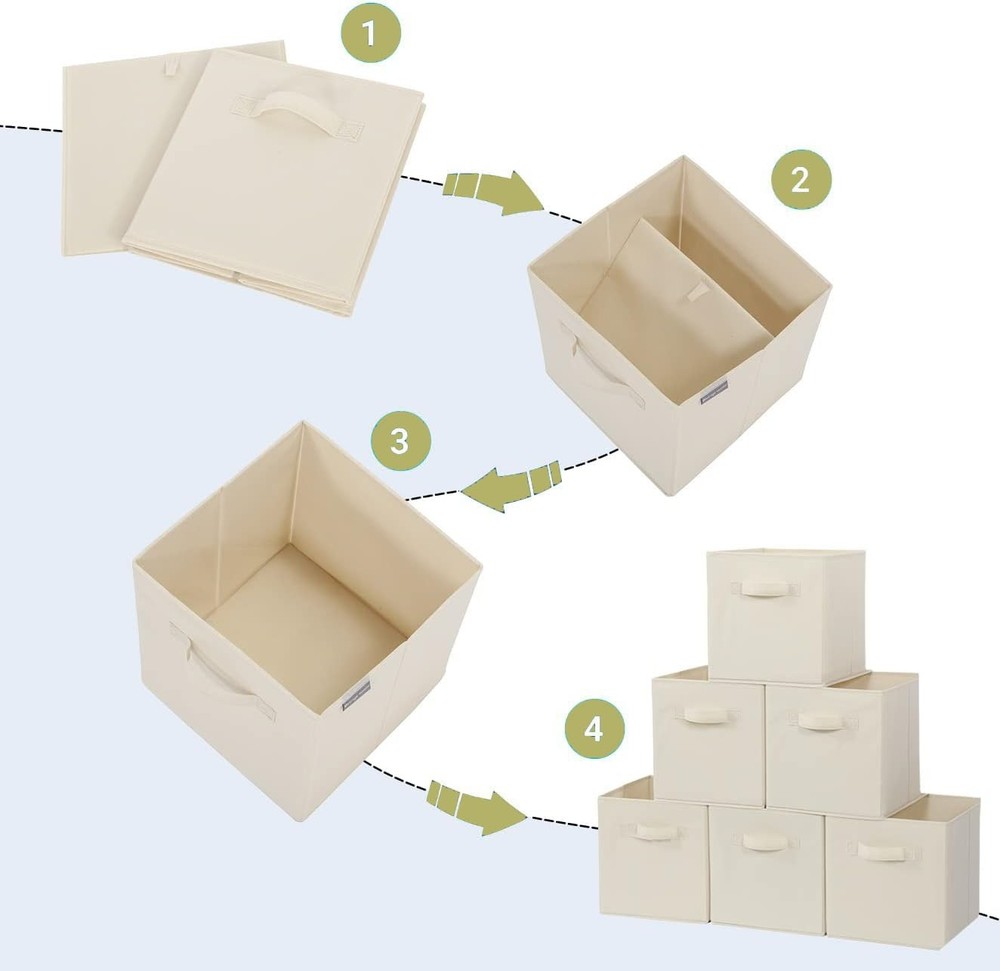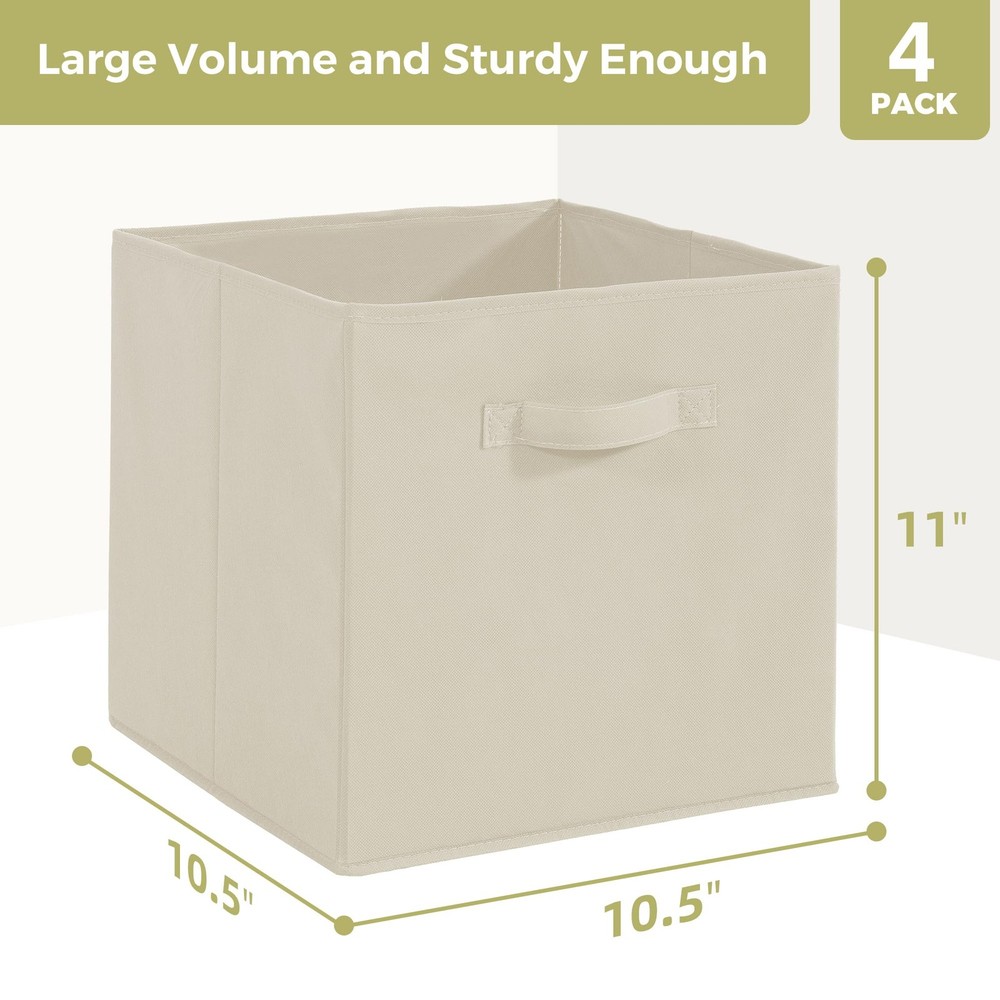 [STANDARD DIMENSIONS FOR CUBE ORGANIZER] With measurements of 10.5"L x 10.5"W x 11"H, ideal for fitting into cube storage organizers with openings of 11" or larger, featuring an open top for easy access. [VERSATILE STORAGE SOLUTION] Perfect for clothes, books, or miscellany in any room. Use in the bedroom, study, living room, Kids Room, Nursery, toy storage, Playroom, family room, or closet. Adds style to any decor, from rustic to modern. [COMPACT STORAGE] When not in use, these collapsible storage bins can be easily stored in a compact manner. [STURDY and DURABLE] Crafted from premium thick fabric that surpasses expectations, with reinforced handles on both sides for quick and easy carrying. [4-PACK STORAGE CUBES] Organize your household, office, or classroom items effortlessly with this versatile set of 4 storage cube bins. Group them together or use them separately in cubbies, shelves, and closets.
