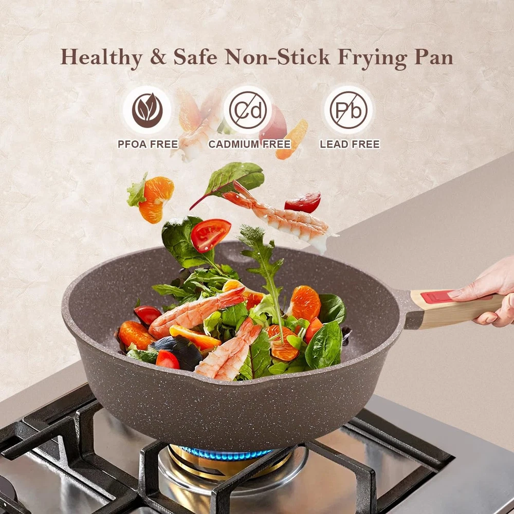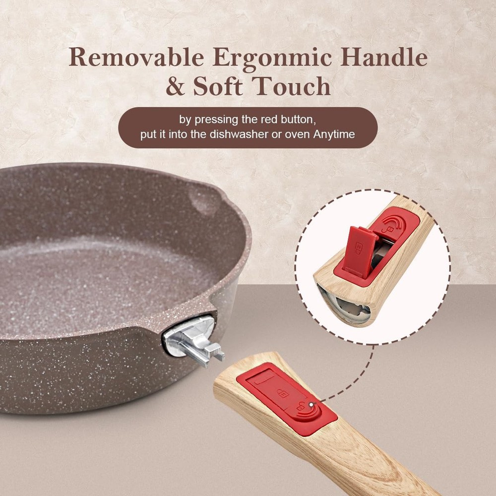 【DURABLE CERAMIC COATING】The 11 inch frying pan is made of natural ceramic coating and free from PFAS, PFOA, lead or cadmium. frying pan glass lid with a silicone seal that can be removed for cleaning. For a healthier and more enjoyable cooking experience at home. 【PREMIUM MATERIAL】The 11 inch nonstick ceramic frying pan with lid is made of high-quality aluminum, which allows better heat storage and distribution than conventional cast iron pans. Suitable for most heating methods. It is recommended to use low or medium heat for cooking. 【11 INCH CERAMIC FRYING PAN WITH REMOVABLE HANDLE】Easily removable by pressing the red button. Removable handle for more stability and no wobbling. Oven & dishwasher safe (without handle). Recommend hand washing to prolong the life of the deep frying pan. 【HEALTHY COOKING】The non-stick ceramic frying pan can be used for a variety of delicious dishes, such as frying vegetables, frying eggs, frying fish or frying steaks! 【NONSTICK CERAMIC FRYING PAN SPECIFICATION】1 *11 inch deep frying pan, 1 *Silicone lid, 1*Silicone Spatula. Non-stick saute pan size: Ø 11 inch, 3.1 inch high, 5 Quart large capacity. The pan with lid is deeper than a conventional frying pan. Please do not hesitate to if you have any questions.