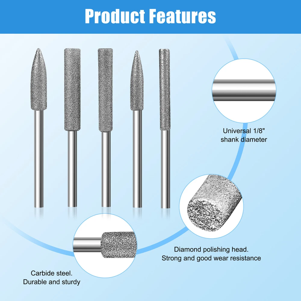 SAFE & SECURE SHOPPING 100% SATISFACTION GUARANTEED FAST SHIPPING Store Categories Store Categories You may also like You may also like Clear Crystal Console Hard Cover Protective Skin Case for Sony PSP 2000 3000 10.98 USD 8 in 1 USB Programming Cable+Software CD For Motorola Baofeng Kenwood HYT Radio 13.83 USD Cooling Gel+Leather Wireless Headphone Ear Pads Cushion Cover For PS5 PULSE 3D 13.94 USD 0.5/0.6/0.7/0.8mm Watch O-Ring Waterproof Rubber Watch Back Cover Gaskets 8.98 USD DIY Simple DC Electric Motor Model Physics Science Educational Toy Assemble Kit 14.98 USD RC Car Brushed ESC 60A Waterproof Electronic Speed Controller For 1/10 RC 18.98 USD 11PCS/Set 1/8" Different Shapes Diamond Burr Bits Rotary Tools Kit Accessories Product Description Features: Diamond Grinding Head Burr: Ideal for sculpting, dressing, and precision grinding carbide in various abrasive materials like ceramic, glass, and precious stones. Diamond Material: Crafted with thick and carbide steel coated with diamond particles for wear resistance, high hardness, and impact resistance, ensuring reliable quality for fine detail work. Universal Compatibility: Featuring a universal 3mm (1/8 inch) shank, these diamond grinder bits are compatible with most rotary tools and die grinders. Multi-functional: Extremely sturdy diamond grinding burr bits perfect for polishing stone, glass, ceramics, and more. Ideal for DIY craft projects, modeling, home repairs, and even pet grooming. Specifications: Type: Diamond Burr Bits Material: Carbide Steel Shank Size: 1/8"(3mm) Grinding Heads Size: 0.5mm 1.5mm 2mm 3mm 4mm 5mm 6mm Package include: 11 x Different Shapes Burr Bits Payment Shipping Return Contact Us Payment We accept all verified payments from ebay. Orders will be shipped after receiving cleared payment. Payment due within 7 days after auction ends and for buy it now listings. Shipping We ship most of our orders within 24 hours, and may up to 48 hours. If you want faster shipping way, please contact us before making a payment. Sometimes due to problems with our transportation company system, your shipping information may be delayed to update. We recommend that you try again after 3-4 days. If you still haven't checked the shipping information, you can contact us via ebay message. Return Always believe we can figure things out with communication, but if it comes to return, the pacakge must be intact and the same as you receive. If you have any questions, please feel free to email our service specialists 24 Hours a Day, 7 Days a Week. We will reply you ASAP. Return/refund is accepted within 30 days after the buyer receives the item. NO exchange will be accepted after 30 days from the date when the item is received. Please contact us first before returning your product!!! Contact Us If you have any questions, you're welcome to email us. We strive to answer all questions and resolve any problems as quickly as possible. You can contact us 7*24, we will reply at the first time, and we will surely solve your problems. Copyright © 2022 Tongtool