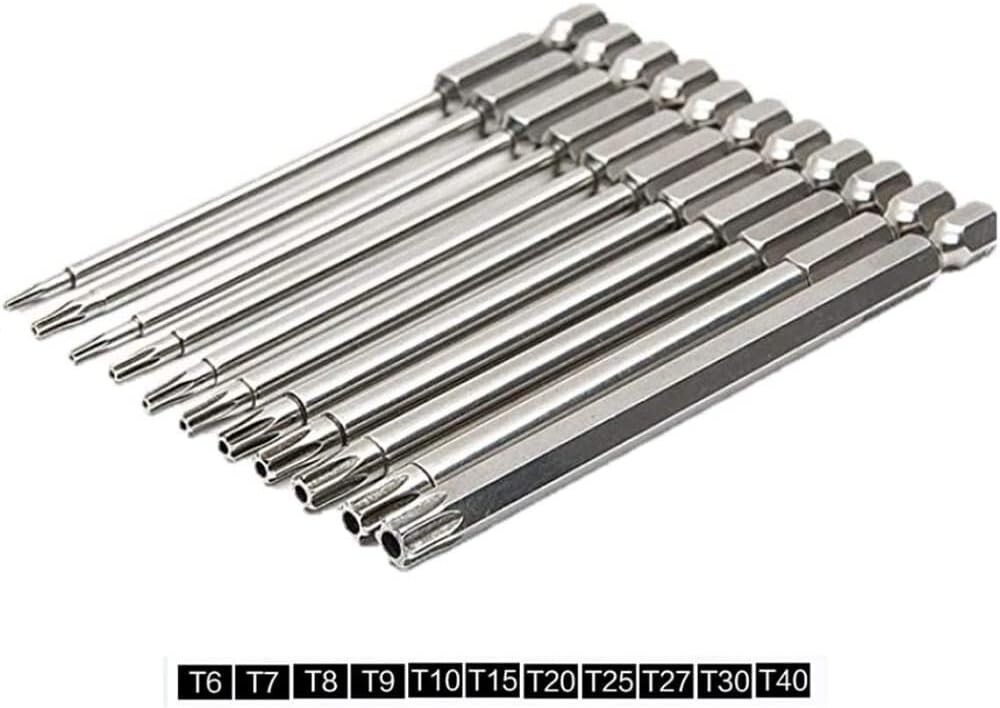 11Pcs Long Torx Security Screwdriver Bit Sets 3" Length T6 T7 T8 T9 T10 T15 T20 Color: 100mm Item Length 4 Inches Material S2 Steel Drive System Torx, Hex Finish Type Steel 【11 Pieces Torx Bit Set】T6, T7, T8, T9, T10, T15, T20, T25, T27, T30, T40. Length: About 100 mm / 4 in 【Premium Quality】Magnetic tips are S2 Alloy Steel -- Good toughness and Will Last For Years. Surface sandblasting treatment improves the fatigue resistance of the product. Return Policy: We offer a 30 day return policy from the receiving date. Please contact us for a Return Label. Please use our return label provided by us because it will go back to our supplier. Feedback: Your satisfaction is very important to us! If you have any problem with your order, please contact us and we will do our very best to make you satisfied. As long as you are happy with your purchase, please leave a positive feedback for us. We will always leave you a positive feedback in return. If you have any problem with your purchase, please do not leave a negative feedback. Please Contact us ... and your issue will be solved quickly and positively We are a small family-owned business trying to make it, not a huge company that doesn't care ... We will ALWAYS do our best for you!