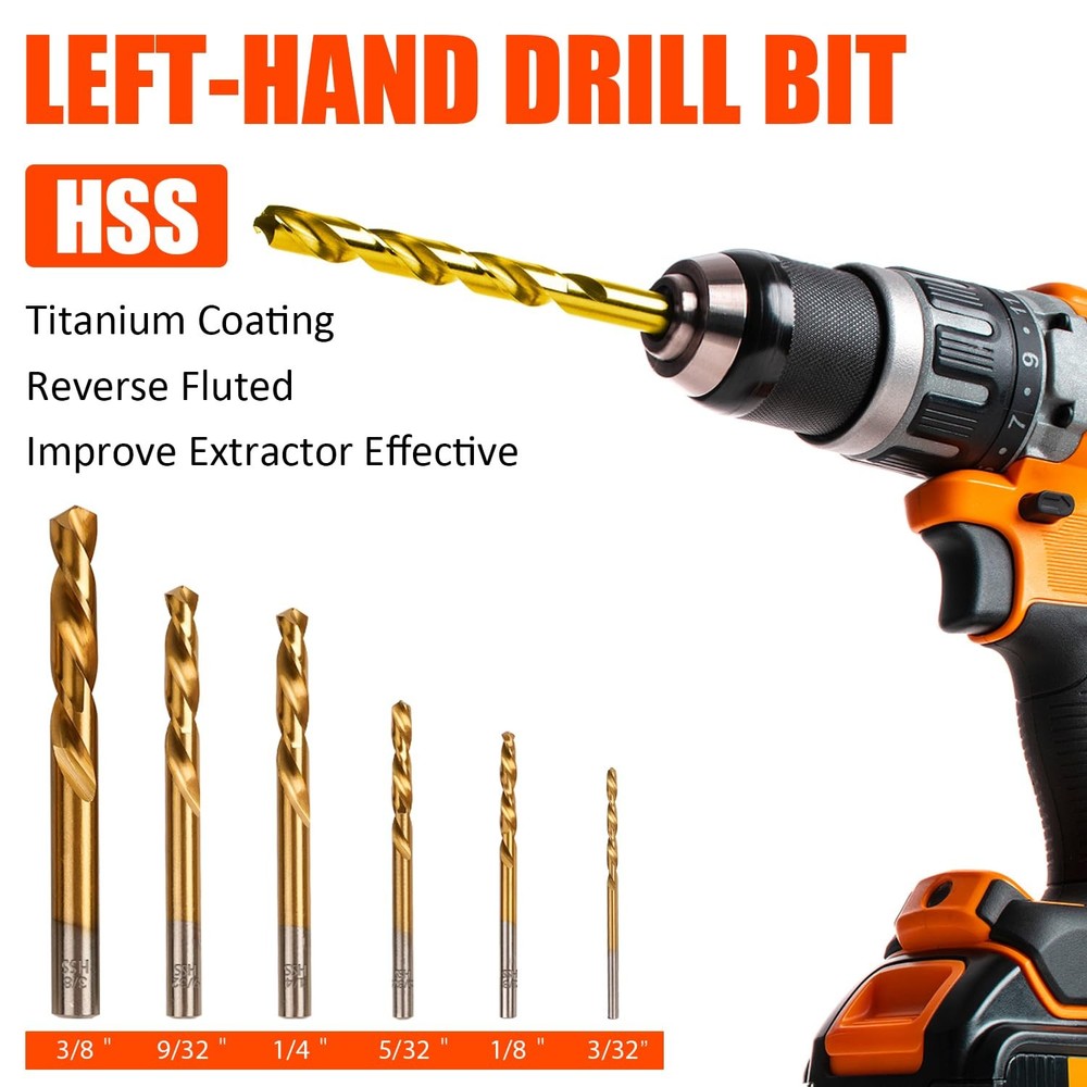 11Pcs Screw Extractor Set, Left Handed Drill Bit and Screw Extractor Kit Easy to Remove Stripped Broken Damaged Screw Bolt and Nut Out, Reverse Drill Bit Extractor Set with Sturdy Case 11PCS SCREW EXTRACTOR SET - Extractor kit includes 5 pcs left-handed drill bits, 5 pcs spiral screw set and a quick adapter. The bottom of the drill bits and the extractors have a unified 1/4 size design can be used more conveniently with an adapter to connect hand tools or electric tools, improving the efficiency of handling most maintenance work. PROVIDE REMOVE SPACE - 135°angle makes bits easier to cut into the workpiece and has less axial resistance providing an effective removal space without damaging other working areas. Left-handed flute design runs the impact wrench in reverse also improves the effect of spinning broken bolts out. Each left-handed drill bit is of high-speed steel material with titanium coating drill bits enhance hardness and wear resistance. EXTRACT BROKEN SCREW - 5 Pc spiral screw extractors with spiral flutes embed themselves to increase grip as resistance increases, easily spin embedded broken bolts and damaged screws out based on drill hole, help out of tough spots. Also providing extra needs can reach deeper places for bolts and screws removed. Each made of premium Chromium-molybdenum steel material is sturdy. EASY TO US - A quick change adapter is added to the kit without worry about disassembling the drill bit and extractor back from hand tools or electrician tools. Each drill bit/extractor and adapter are used in combination through magnetic suction to improve efficiency at work. The palm-sized storage box is easy to carry and increases the number of daily uses. WIDE APPLICATION & RELIABLE - Ingenious drill bit with extractor combination meets most mechanical maintenance, automotive, home decor or craft production repair needs. tools have quality assurance, feel free to contact us if there are any problems with the product. We provide you with service for the first time.