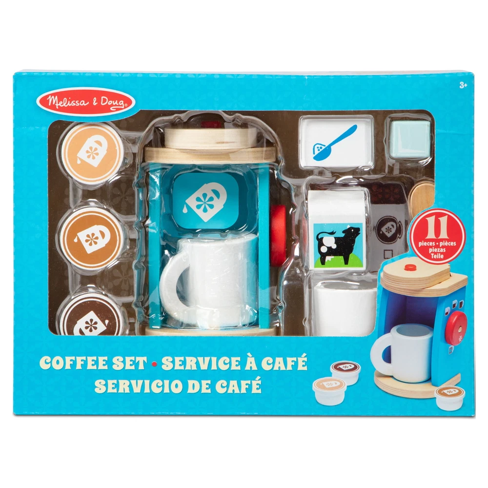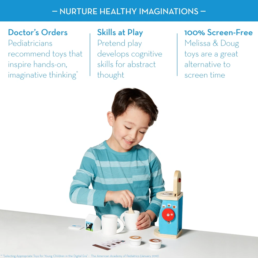 Pretend-play tea parties can now include coffee with this realistic wooden Brew & Serve Coffee Set for two! Lift the lid and in one of three coffee pods (regular, hazelnut, or mocha) and turn the knob to choose the serving size! Too hot for coffee? Add the included wooden ice cube to make it iced. The 11-piece set comes with two wooden mugs, creamer, sugar, a spoon, and even a re-usable order card for budding baristas! Quality construction means endless hours of imaginative play! Makes a great gift for girls and boys, ages 3 to 6, for hands-on, screen-free play. Melissa & Doug products provide a launch pad to ignite imagination and a sense of wonder in all children so they can discover themselves, their passions, and their purpose. Where will your imagination take you today?