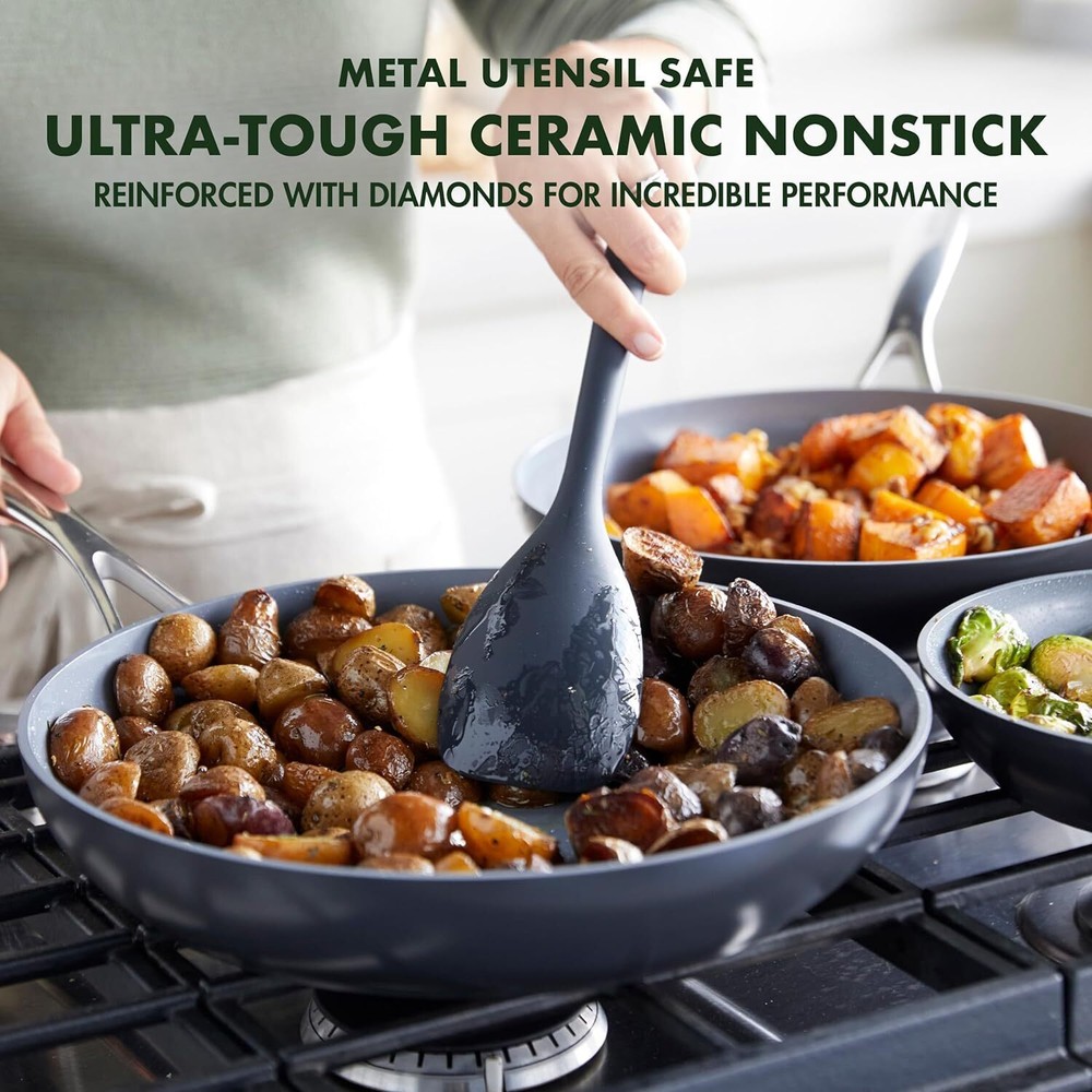 Commercial Electric Meat Slicer Deli Food Slicer w/ Removable 8.5" Blade Cheese 109.42 USD 115.18 USD Free shipping 5% off 3 Tier Folding Bookcase Stackable Solid Wood Sturdy Shelves Storage Espresso US 66.52 USD 70.02 USD Free shipping 5% off Glider Rocking Chair Ottoman Cushion Set Recliner Furniture Baby Nursery Seat US 156.81 USD 165.06 USD Free shipping 5% off 2 Pack Heavy Duty Garage Bucket Dolly Lockable Casters 12 Inch Rolling Trolley 41.91 USD 44.12 USD Free shipping 5% off Rustic Whiskey Barrel Planter UV Resistant Drainage Holes Indoor Outdoor Use New 16.9 USD 17.79 USD Free shipping 5% off Rechargeable Lithium-Ion Battery Powered Pump Zero Technology Sprayer 2-Gallon 100.79 USD 106.09 USD Free shipping 5% off Storage Tool Organizer Utility Box W/ 4 Drawers 19 Compartments Carrying Handle 31.0 USD 32.63 USD Free shipping 5% off 4.4 Cu ft Mini Fridge Cooler Refrigerator Door No Freezer Stainless Steel Look 166.96 USD 175.75 USD Free shipping 5% off 2 Packs 32oz All Natural Sunsweet Prune Juice No Pulp Fiber Potassium Vitamins 27.96 USD 29.43 USD Free shipping 5% off RhinoFLEX 15ft RV Sewer Hose Kit 4-in-1 Adapter Clear Elbow Caps USA Made 45.66 USD 48.06 USD Free shipping 5% off 6 Piece Outdoor Patio Dining Set Table Folding Chairs with Umbrella Garden Red 94.76 USD 99.75 USD Free shipping 5% off 2 Speed 30 Inch High Velocity Drum Fan Tilted Air Circulator Metal Portable New 178.33 USD 187.72 USD Free shipping 5% off About this item SET INCLUDES: 8'', 9.5'', 11'' frypans, 2QT and 3QT saucepans with lids, 3QT sauté pan with lid; 5QT stockpot with lid, and 3 pan protectors. CUTTING-EDGE CERAMIC NONSTICK: Infused with diamonds, GreenPan's metal utensil safe ceramic nonstick offers remarkable durability, balanced heating, and effortless cleanup. TOXIN-FREE: Our signature ceramic nonstick coating is free of PFAS, PFOA, lead or cadmium. AWARD-WINNING PERFORMANCE: Our Valencia Pro has set the standard for ceramic nonstick winner of the best ceramic nonstick 8” and 11” frypans from America’s Test Kitchen and 2023 Good Housekeeping Sustainable Innovation Award. DUOFORGED HARD ANODIZED BODIES: Unbelievably tough and scratch-resistant, these pans are pre-treated before they’re hard anodized for extraordinary durability. MAGNETO INDUCTION BASES: Optimized for performance on all stovetops, including induction. DURABLE GLASS LIDS: Offer an easy way to check on your meal in progress, oven safe up to 425°F EASY TO CLEAN: Most messes wipe clean, plus these pans are dishwasher safe for effortless cleanup. COMFORTABLE STAINLESS STEEL HANDLES: Mirror-polished stainless steel handle stays cool thanks to a V-shaped cutout. PERFORMS WHERE YOU NEED IT: Oven and broiler safe up to 600°F (lids up to 425°F) and suitable for all stovetops, including induction. You may also like Rotator Cuff Pillow W/ Pocket Adjustable Shoulder Support Recovery After Surgery 50.35 USD 53.0 USD Free shipping 5% off Coastal Shell Bath Accessories Sets 4 Pieces Handcrafted Bath Decor Resin Sand 39.88 USD 41.98 USD Free shipping 5% off Nightstand Organizer W/ Fabric Drawers Storage Side Table Bedroom Living Room US 56.8 USD 59.79 USD Free shipping 5% off Electric Coffee Percolator 4 Cup Stainless Steel Keep Warm Function Coffee Maker 59.27 USD 62.39 USD Free shipping 5% off Faux Leather Dining Chair Set of 2 Adjustable Legs Tufted Backrest Indoor Use 113.79 USD 119.78 USD Free shipping 5% off DC Power Supply 0-32V 0-5A Digital Bench Adjustable Laboratory Switching Supply 49.39 USD 51.99 USD Free shipping 5% off 4lb 7in Torpedo Wedge Wood Splitting Tool Forged Steel Durable Firewood Splitter 28.15 USD 29.63 USD Free shipping 5% off Stainless Steel Airpot Hot Water Dispenser Thermos Ideal Coffee Tea Events New 45.74 USD 48.15 USD Free shipping 5% off 5.9 Inch Narrow Console Table W/ Outlet Sofa Table Set of 2 Charging Stations 103.99 USD Free shipping Kids Plush Faux-Fur Saucer Chair Portable Folding Accent Chair Cozy Seating New 29.17 USD 30.7 USD Free shipping 5% off Round Ceramic Planter W/ Drainage Hole Ideal Small Plants Indoor Decor Black New 5.22 USD 5.49 USD Free shipping 5% off Toilet Brush Holder Set Ceramic Cleaning Accessory Bathroom Decor Stylish Design 36.94 USD 38.88 USD Free shipping 5% off