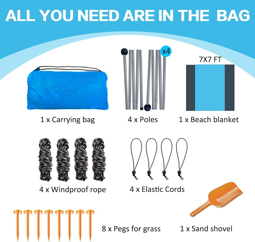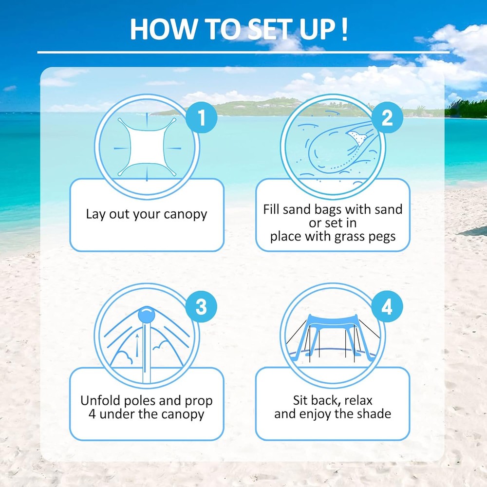 Beach Canopy Tent 11X11 FT Include Blanket Shade Lake blue Product Details Brand: BRONOM Material: Aluminum Color: Lake blue Item Weight: 10 Pounds Recommended Uses For Product: Beach Product Dimensions: 130"L x 130"W x 80"H Ultraviolet Light Protection: True Frame Material: Aluminum Closure Type: Drawstring Water Resistance Level: Water Resistant Pole Material Type: Aluminum Coverage: 11x11 FT or enough for 4-6 people Number of Guylines: 4 Assembly Required: Yes Item Weight: 10 pounds Manufacturer: BRONOM Country of Origin: China Item model number: BC01 Large size and large space- The beach canopy installation size is 11x11 FT, which can provide enough space and shade, can accommodate 4-6 people to enjoy on the beach, outdoor, camping, picnic or use on the grass. Upgrade surprise- In order to meet your needs, we provide a beach blanket as an extra gift. It's very lightweight and cost-effective. Please choose this beach tent pop up shade. UV Protection- This beach shade canopy offering UPF 50+ , which can keep you and your family from the harmful UV rays and reduce sun burn or glare. Portable and lightweight- The beach canopy and beach blanket are packed in a carry bag, weighing 10lbs. You can take this beach sun shade canopy to any where you want to go, also taking it on plane is available. Easy to install- According to the instructions, you can install this beach canopy tent sun shade within 15 minutes and no tools required. In addition, we provide 4 additional windproof ropes to ensure the beach shelter will not be blown down by the sea wind, which is the care you can't enjoy in other brands. How to Install? 1.Lay beach tent fabric flat. 2.Use the sand shovel to fill all of the sandbags. 3.Pull beach canopy fabric apart as far as possible to make large “X” . 4.Put the end of the support rod with the black sponge ball into the fabric seam. 5.Hold up the support poles and insert the other end into the sand. 6.Tie the black sponge ball with a elastic cord. 7.Place the guyline on the black sponge ball, tie the other end on the ground peg and pull it tight, then insert the ground peg into the sand.