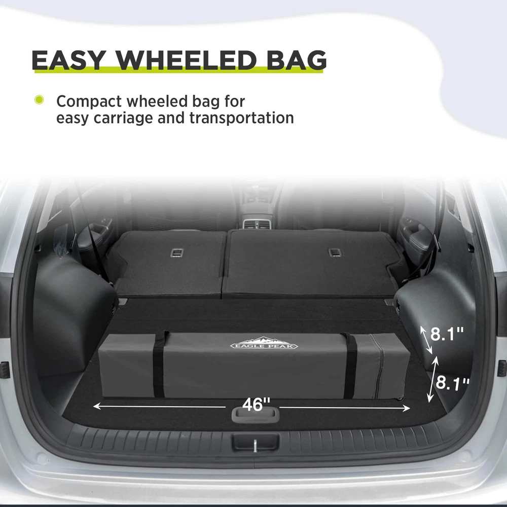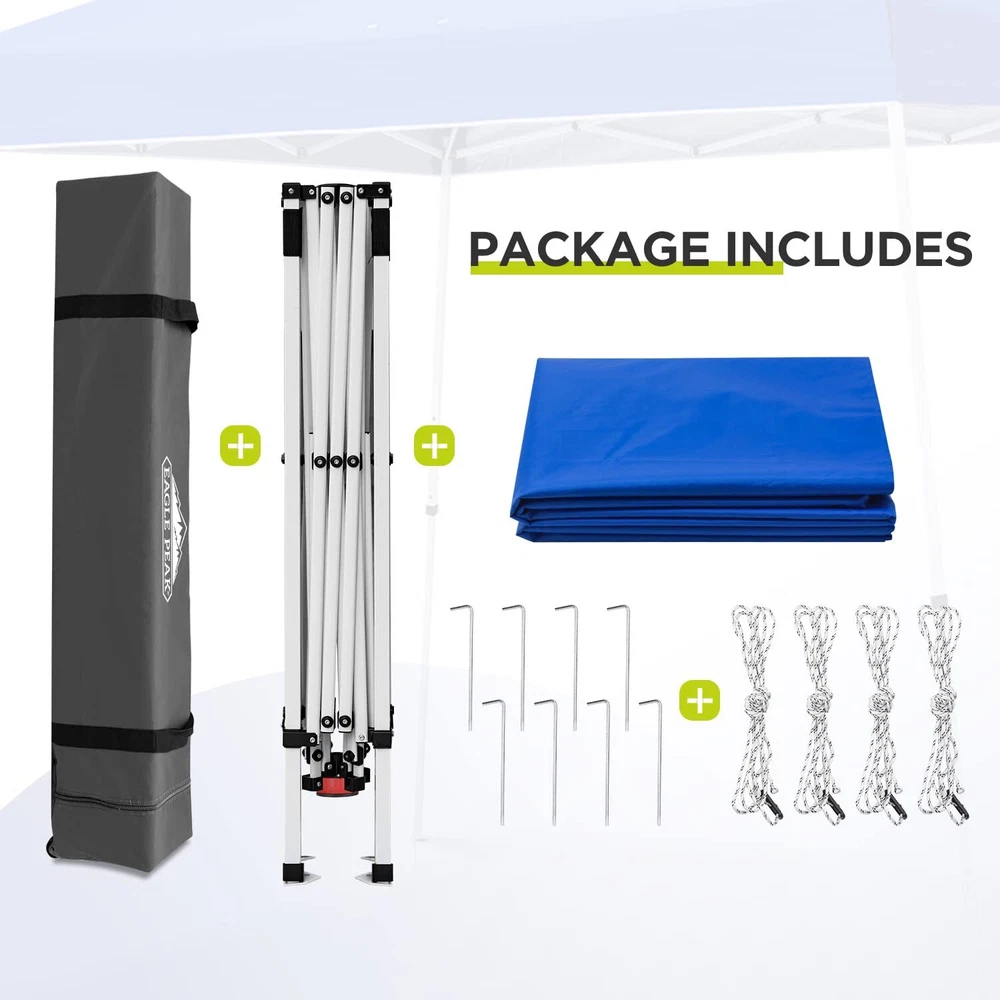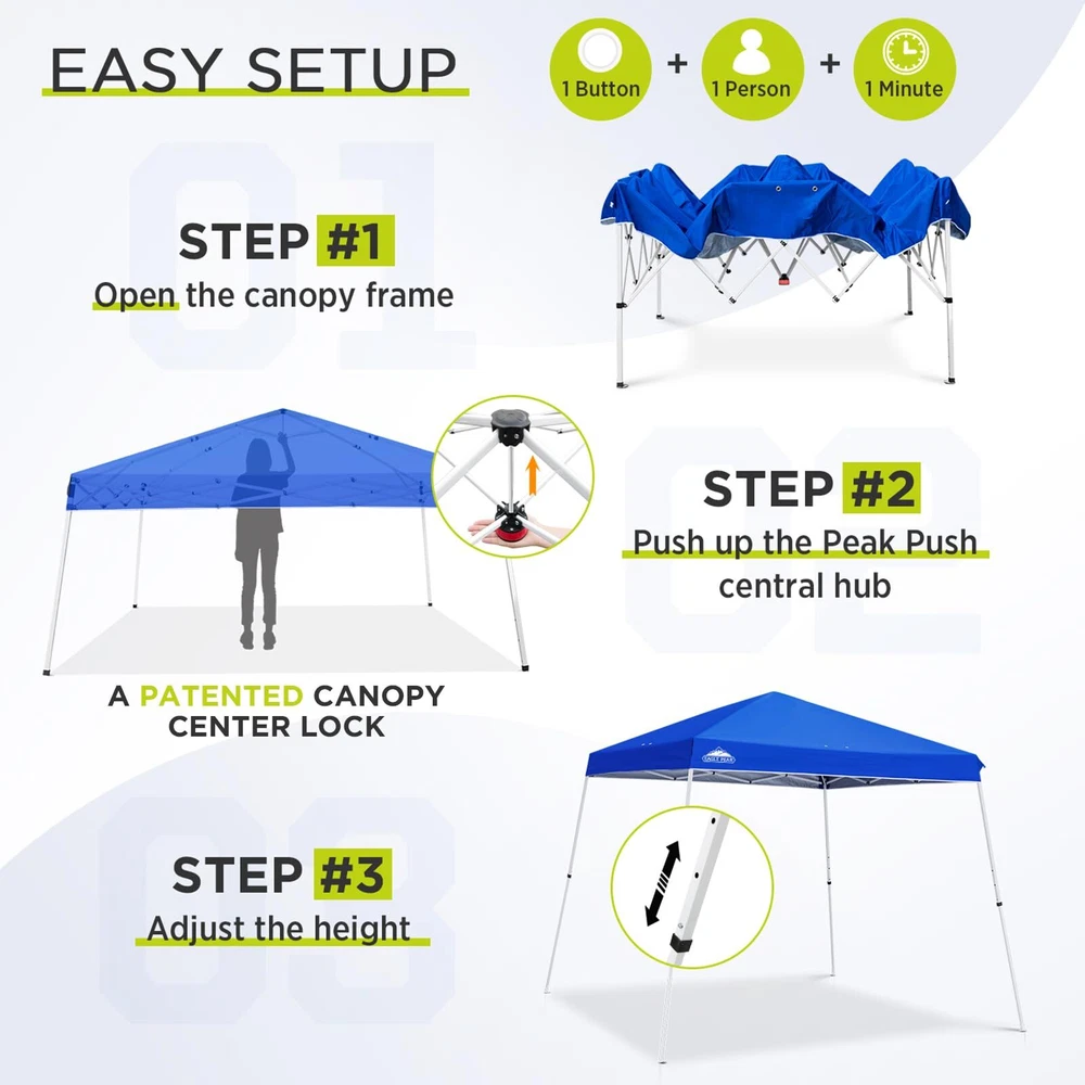 EASY SETUP: Say goodbye to complicated setups; this easy setup pop up canopy tent features the Peak Push system, a patented canopy center lock. This portable canopy requires no tools and easily opens and closes from the center in seconds. Its unique canopy tent center lock enables a seamless, one person setup, letting you maximize outdoor time with minimal effort EASILY ADJUSTABLE: The leg height has three settings to quickly adjust the canopy height and angle to maximize shade throughout the day. 64 square feet of shade, large enough for 5 people. (Slant leg design is 11'x11' at base and 9'x9' at the top) SUPERIOR QUALITY: UPF 50+ UV protection, water resistance, CPAI-84 flame resistance, 150D oxford fabric canopy top. Frame is powder-coated, rust-resistant, high-grade engineered steel, with hardened M5 bolts and nylon connection hardware for maximum durability COMPACT AND PORTABLE: Take this lightweight canopy anywhere with the 600x300D wheeled carrying bag; fits into most car trunks. Perfect for tailgates, the beach, the park or wherever your fun begins PROMISE: offers a 1-year limited after sale protection from the original date of purchase. Unlike many other canopy manufacturers, offers this for our frames, canopies and bags! If you have any other questions, please contact our professional service team