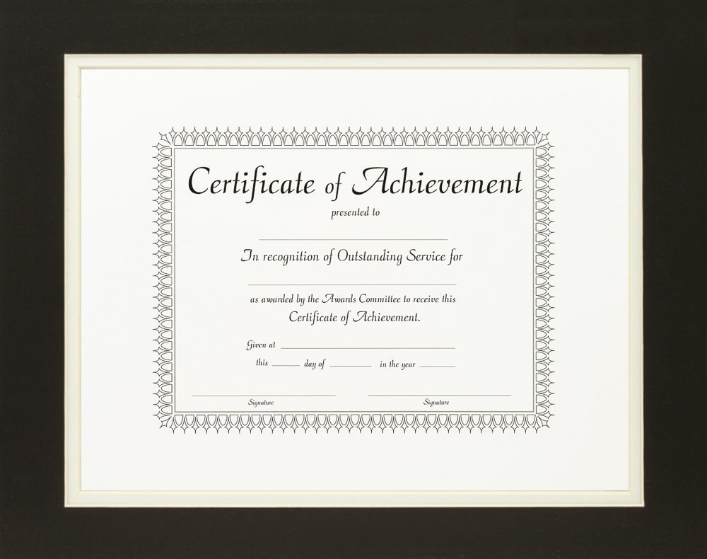 This brand new picture frame with double matting is manufactured in the USA at our facility in Ithaca, Michigan. Please Review the product listing details of the frame selection you have made. Our picture frames smaller than 12x18 inches (inside dimensions) are carefully and completely assembled with glass facing and a durable backing with machine-cut, low profile wall hangers for both horizontal and vertical hanging. Our picture frames will compliment any space that you hang them in, they make great gifts and they will protect and display your documents, photographs and artwork for years to come. If you have any questions or comments, please do not hesitate to us. Feel free to visit our storefront and seller info pages to browse our extensive selection of frames, read customer feedback or Review our policies and info. At the end of the day we want you to be completely happy with your purchase. Be sure to add us to your list of favorites so you can easily find us the next time you need a quality picture frame. Thank you for shopping with us. We are and we are framing the world.customer at a time. Display your achievements, certifications and memories with our framed single opening mats Complete framed matting kit includes: picture frame, double matting, glass, rigid black backing and pre-attached stamped hanging hardware Double matting has .25 inch reveal. Mat opening is designed to fit an 8.5 x 11 inch document. There will be approximately quarter inch of matting overlapping the document on each side (actual mat opening is 8 x 10.5 inches). The overlap is necessary to prevent the document from falling through the mat opening. Frame moulding is 1.38 inches wide; black; smooth finish; wood composite Each mat is .05 inches thick; cream core; pH neutral; bevel cut openings