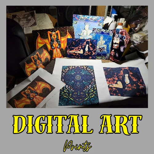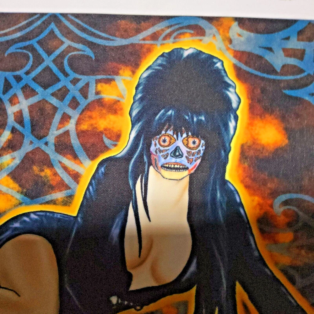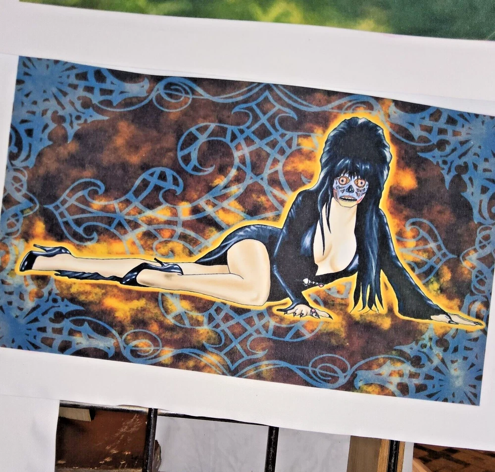 11x7 elvira as they live alien goth pinup halloween digital art prints by me,the artist. Decided that Elvira would still make a hot alien so drew her up as a "They live" baddie just straight chillin'. She gets a pass for being Elvira. Made some sublimation prints so we can all enjoy this piece. Check out other prints of my art in my shop. ***Treasure Suite offers you many pieces of my art prints now*** ###This section is for large sized sublimation prints of my digital art. measurements are 15"hx12"w. ### *Welcome to my unique collection of digital art, where creativity meets craftsmanship! Each piece in this category features my original designs, heat pressed into vibrant sublimation prints on polyester canvas material. These art pieces are not just decorations, they are collectibles that bring a touch of gothic, rock and roll, horror, pin-up, and lowbrow art into your space. *I leave extra fabric border so you can gallery wrap on frame,cut to size, or sew onto clothes. Sublimation printing is what's done on clothing, like all over sweaters,tshirts,banners,etc. So that means it can be used on clothing and washed. If print gets wrinkled, you can steam it. *These pieces are perfect for adding a distinctive edge to your home or office, and they make fantastic gifts for art enthusiasts and collectors alike. Who doesn't enjoy vibrant digital art of out of this world space huntresses, demon witches, cyberpunk vixen cyborgs, spooky mistresses,and so on?