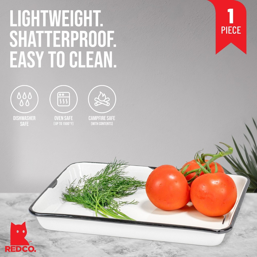 Bring classic, traditional camping style to your home kitchen with this enamel serveware. A big step up from disposable cutlery and safer than glass to use outside for picnics, outdoor barbecues, poolside parties, or gatherings on the patio. Simple yet practical, it is suitable for both home and professional use; it serves beautifully in diners, school and office canteens, cafeterias, bakehouses, coffee shops, bars, or restaurants. The tray is especially well-suited for catering, weddings, receptions, buffet-style get-togethers, family reunions, and everyday household use. It makes a great gift for housewarming parties and for family and friends who have a passion for food, cooking, and baking. Features a rectangular shape with a smooth, enameled white surface, black rim, and slight black distressing to perfectly complement vintage, shabby chic, antique, cottage, farmhouse, and country living décor An ideal serving vessel for salads, lasagnas, appetizers, cakes, meat, and fish dishes Lightweight, shatterproof, and easy to clean, it’s perfect for camping, BBQ, picnics and outdoor activities Made from the highest quality enameled metal, it is food, oven, freezer, and dishwasher safe (but not microwave safe) Dimensions: 11” L x 8.6” W x 1.3” H; Capacity: 2 quarts (1.9 liters or 66 fluid ounces); Wash before use