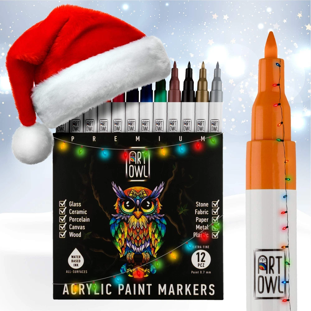 paint markers. Featuring an extra fine tip, these markers are ideal for calligraphy, hand lettering, illustration, scrapbooking, doodling, coloring, and graffiti. Quick drying paint pens are safe on skin. Waterproof after baking or sealing. Multi surface acrylic markers will be a great gift to a loved . Essentials acrylic paint marker kit for kindness rocks, customizing mugs, Christmas balls, mandalas, porcelain, pumpkin, rock river, photo albums, card stock, and paper projects. Ideal for art amateurs, professionals, and hobbyists. Before starting your project, vigorously shake pen for 15 seconds with lid on to activate mixing ball, depress nylon nib several times to . The marker is ready to use when tip holds paint. is a family-owned supplier of paint markers designed in the USA. 0.7mm extra fine Japanese tip, rich and opaque Italian Ink. Create detail and fine lines when sketching, painting, lettering, and drawing on rocks. You will enjoy DIY, craft, and art projects on many surfaces from paper, card stock, bullet journaling, rock, stone, ceramic, plastic, fabric, canvas, and wood slices. 12 popular colors: metallic gold and silver, white, black, red, yellow, blue, pink, green, brown, orange, and purple packaged in our cute aesthetic box. Every artist, student, or professional will utilize these primary colors in their illustrations and drawings. Outdoor or indoor paint pens are waterproof, fast drying, fade-free, UV resistant, no odor.