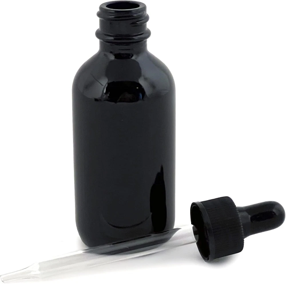 12 - 2 oz, Black Glass Bottles, with Glass Droppers, and Black Caps Perfect for essential oils, perfume oils, or other liquids. Safe, secure and convenient packaging Perfect for travel, and conveniently fits in your purse. These high quality black glass bottles with glass eye droppers, are perfect for storing your essential oils, perfumes or colognes. The Black glass provides protection from potentially harmful light and the convenient size makes it perfect for travel. The Eye Droppers allow for the perfect amount of product to be used every time.