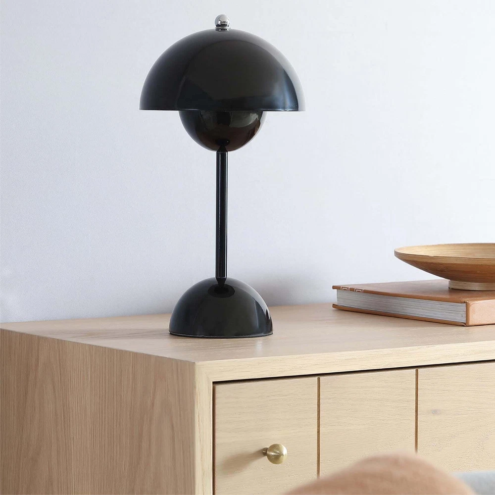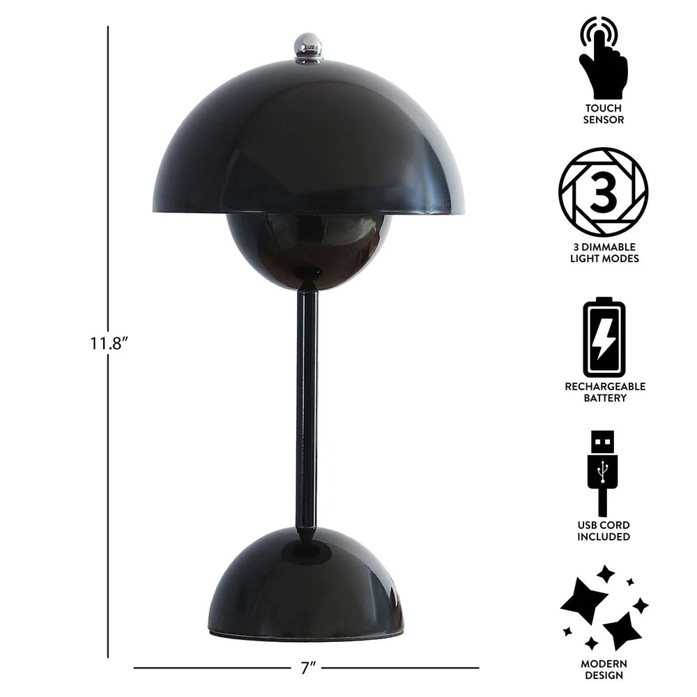 Introducing the Mainstays 11.8" Black LED flowerpot Mushroom Table Lamp—a sophisticated and versatile addition to your home decor. Equipped with a rechargeable battery and included USB cord, you can place this lamp anywhere you need. Enjoy three adjustable dimmable light modes to create the perfect ambiance for any occasion! The unique contemporary style of this lamp adds a touch of elegance and sophistication to your living space. From bedside tables to office desks, this table lamp is the perfect blend of form and function. Cordless Convenience: Enjoy freedom of placement with a built-in rechargeable battery, allowing you to place the lamp anywhere without the constraints of cords or outlets. Adjustable Dimmable Light: Choose from three dimmable light modes to create the perfect ambiance for reading, working, or relaxing. Contemporary Design: Elevate your space with the sleek and sophisticated black metal flowerpot design, adding a modern touch to any room in your home or office. Spot clean