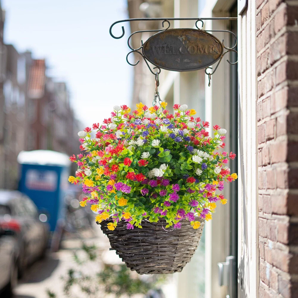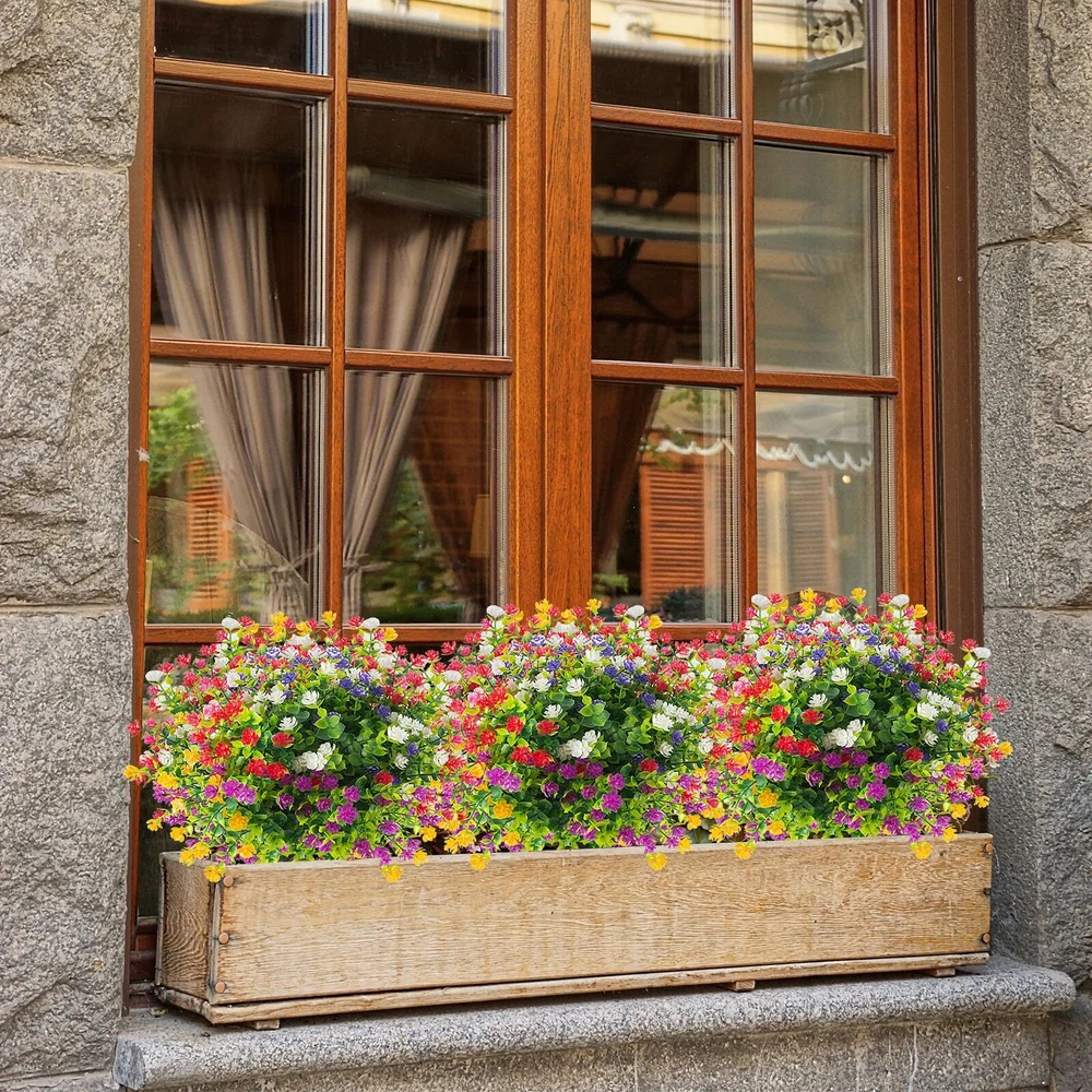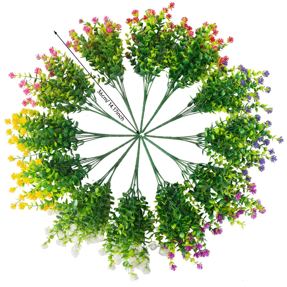 【Colorful with 6 colors】-You only need to make a one-time purchase, and there will be enough color mixing effects to surprise you!Each flower come as close to real as can be, offer true-to-life petal and foliage textures, especially under the ultraviolet rays of the sun, more durable and realistic, and the color is more vivid and atmospheric. 【UV RESISTANT AND SUITABLE】- The artificial eucalyptus flowers are truly UV resistant and never fade, adding a charming charm to your front porch, windowsill, garden, walkway, kitchen, living room, bedroom, patio and garden fence. Artificial plants are also great for everyday home garden decor, weddings, birthdays, holidays, shops, table centerpieces, wedding arrangements, bridal bouquets, bridal showers, baby showers, garlands and more. 【Fuller Size】 A pack of 12 artificial flowers(The most perfect blend of colors: bright red * 2, fuchsia * 2, purple * 2, yellow * 2, white * 2, pink * 2), each bunch is about 14 inches high x 9 inches wide, with 7 flexible stems, we add more bushy leaves to each bunch of eucalyptus flowers at the time of production, make the decorative effect more layered and the scene more vivid. 【Brand Promise】We carefully mix and match colors to enhance the decorative effect;The lush artificial shrub plants provide you with sunshine in spring at any time, light up the enthusiasm of summer, share the harvest of autumn, and bring greenery in winter; never fall, never wither. 100% satisfaction guarantee. 【Safety Materials】Natural and fresh color, non-toxic and harmless, 100% safe, environmentally friendly, generous and elegant, the new product is colorful and looks more real compared to the eucalyptus on the market.
