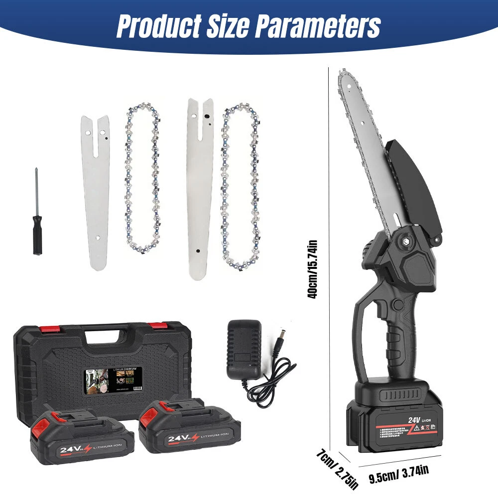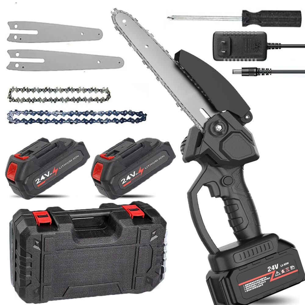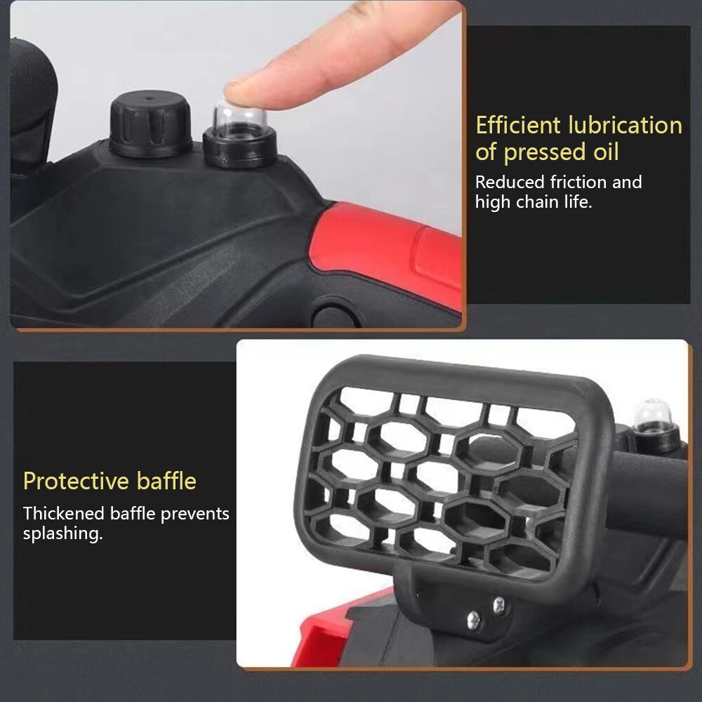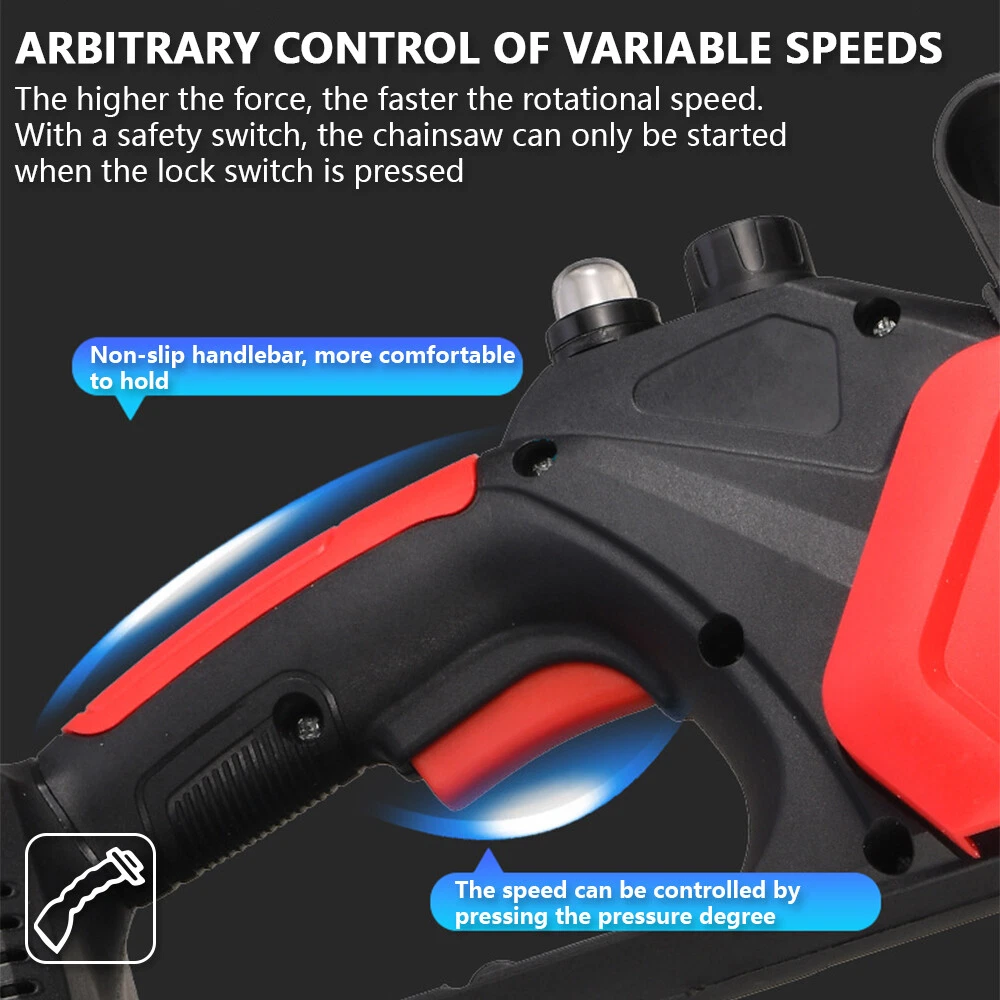 Red - 12" Chainsaw Features: Our 12-inch electric chain saw has an upgraded high-efficiency brushless motor with reliable and efficient performance. The motor also reduces noise, making it an ideal tool for quiet and smooth cutting. Powerful brushless motor, large capacity and high working efficiency. Dust-proof cooling net can prevent foreign objects from entering the motor, which can effectively dissipate heat and will not burn the machine. Our hand-held cordless chainsaw weighs only 4.85 pounds, which is compact, convenient and easy to carry around. It can be used with one hand, and it is not easy to get tired after long-term use. Even the elderly and women can easily control it. Our cordless chainsaws are widely used in gardens, farms, parks, forests, pastures, orchards and indoors to meet all your cutting needs. If you go camping, you can also take this cordless chainsaw with you. Our mini super saw is also a perfect gift for dad, friends and husband. In this mini chainsaw kit, you will get everything you need. Specifications: Voltage: 21V Power: 1100W Idle Speed: 0-3500r/min (Sprocket Speed) Chain Speed: 8.0m/s Chain Specification: 3/8 Guide Plate Size: 12 inches Maximum Cutting Diameter: 285mm Scope of Application: Pruning, Chopping Wood and Logging. Package Contains: 1 x Chainsaw 2 x Battery 1 x Charger 1 x Guide Plate 1 x Socket Wrench 1 x Chain 1 x Storage Box 1 x English Instruction Manual Black - 8" & 6" Chainsaw LARGE-CAPACITY BATTERY: Rechargeable lithium battery chainsaw, powerful lithium battery, wireless binding, free cutting, 6000mAh lithium battery life is greatly improved. HIGH-QUALITY CHAIN: After deep quenching treatment to ensure smooth cutting, the wooden tooth design can make the chain saw stuck in the branch, more effective and faster cutting. The tungsten steel ball material does not need to be lubricated, which reduces the resistance of the machine during use, reduces the wear of the machine, and increases the service life BUY ONE EQUALS TWO: Upgraded 8/6 Inch chain switch design, allows you to switch 2 length of chains easy and quickly for multi-purpose use when cutting/trimming different size of trees/branches as you like. 8 inch chain for larger thicker wood cutting (6-10inch diameter); 6inch chain for regular size wood cutting(0-6inch diameter). SAFETY CHAINSAW: This small chainsaw has a safety switch, you need to hold down the safety lock and trigger at the same time to start the saw to prevent accidental; Anti-splash baffle prevents wood chips from splashing during work. PERFECT GIFT : Mini chain saw is an excellent alternative for all kinds of the household, garden, yard, or farm projects. It is suitable for wood cutting, tree limbs chopping, branch pruning, gardening and more. Perfect Gift for Dad, Friends, husband. COMPLELETLY ACCESSORIES : , 1 x Electric Chainsaw, 2 x battery, 1 x 8-inch saw blade, 1 x 6-inch saw blade, 2 x 8" chain, 2 X 6" chain, 1 x Charger, 1 x Screwdriver,1 x Suitcase.