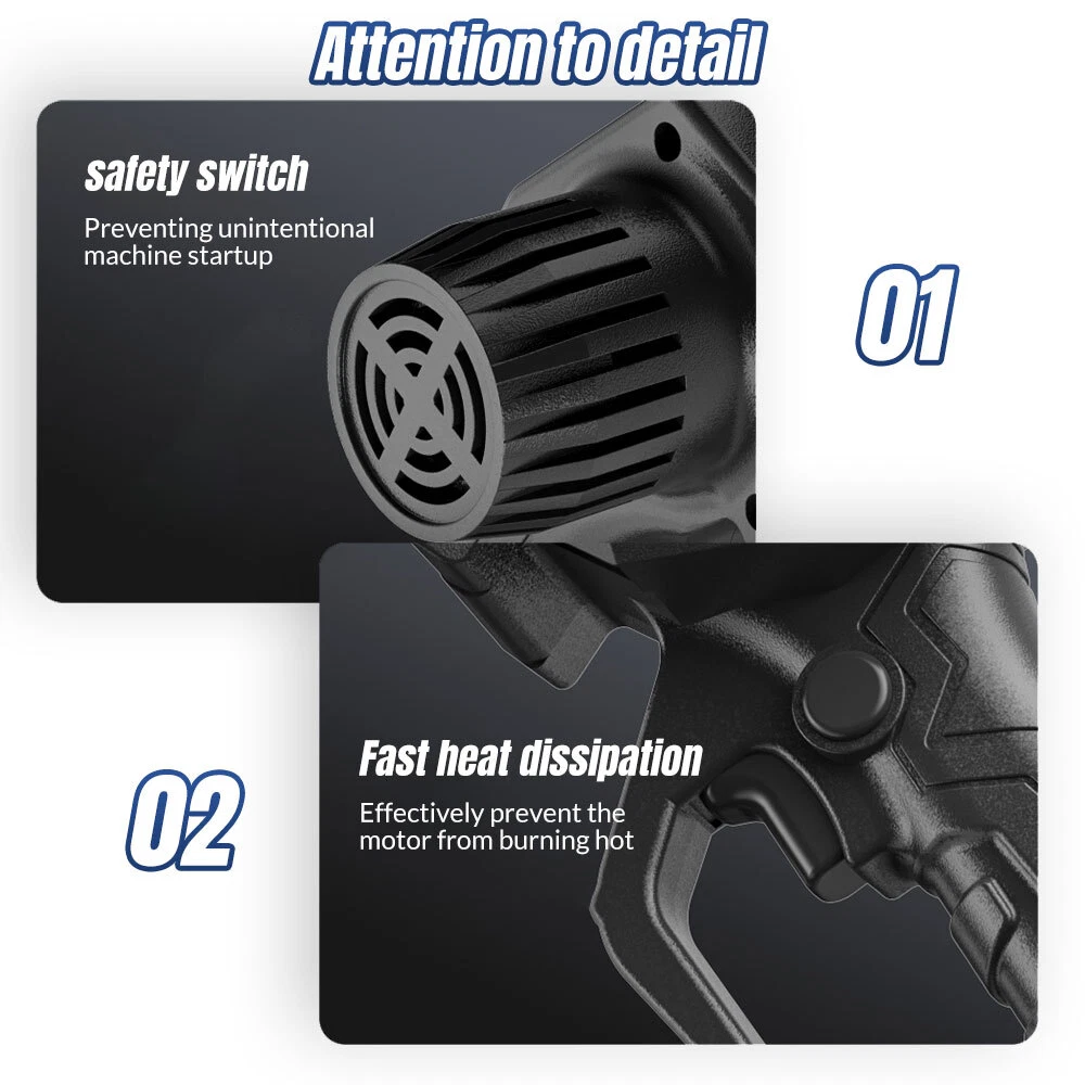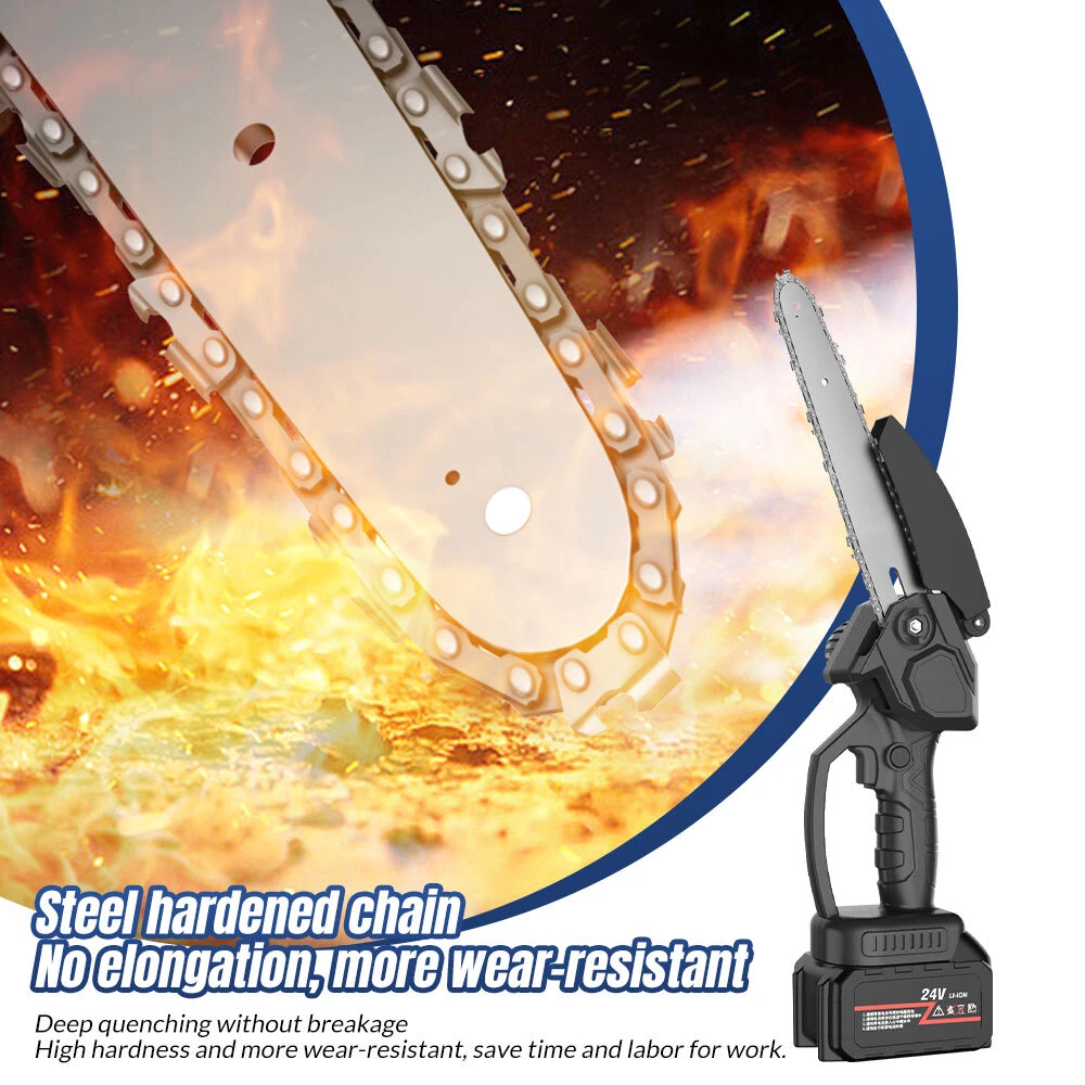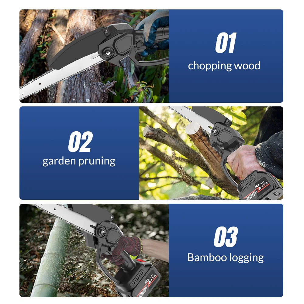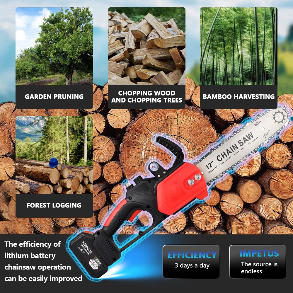 Red - 12" Chainsaw Features: Our 12-inch electric chain saw has an upgraded high-efficiency brushless motor with reliable and efficient performance. The motor also reduces noise, making it an ideal tool for quiet and smooth cutting. Powerful brushless motor, large capacity and high working efficiency. Dust-proof cooling net can prevent foreign objects from entering the motor, which can effectively dissipate heat and will not burn the machine. Our hand-held cordless chainsaw weighs only 4.85 pounds, which is compact, convenient and easy to carry around. It can be used with one hand, and it is not easy to get tired after long-term use. Even the elderly and women can easily control it. Our cordless chainsaws are widely used in gardens, farms, parks, forests, pastures, orchards and indoors to meet all your cutting needs. If you go camping, you can also take this cordless chainsaw with you. Our mini super saw is also a perfect gift for dad, friends and husband. In this mini chainsaw kit, you will get everything you need. Specifications: Voltage: 21V Power: 1100W Idle Speed: 0-3500r/min (Sprocket Speed) Chain Speed: 8.0m/s Chain Specification: 3/8 Guide Plate Size: 12 inches Maximum Cutting Diameter: 285mm Scope of Application: Pruning, Chopping Wood and Logging. Package Contains: 1 x Chainsaw 2 x Battery 1 x Charger 1 x Guide Plate 1 x Socket Wrench 1 x Chain 1 x Storage Box 1 x English Instruction Manual Black - 8" & 6" Chainsaw LARGE-CAPACITY BATTERY: Rechargeable lithium battery chainsaw, powerful lithium battery, wireless binding, free cutting, 6000mAh lithium battery life is greatly improved. HIGH-QUALITY CHAIN: After deep quenching treatment to ensure smooth cutting, the wooden tooth design can make the chain saw stuck in the branch, more effective and faster cutting. The tungsten steel ball material does not need to be lubricated, which reduces the resistance of the machine during use, reduces the wear of the machine, and increases the service life BUY ONE EQUALS TWO: Upgraded 8/6 Inch chain switch design, allows you to switch 2 length of chains easy and quickly for multi-purpose use when cutting/trimming different size of trees/branches as you like. 8 inch chain for larger thicker wood cutting (6-10inch diameter); 6inch chain for regular size wood cutting(0-6inch diameter). SAFETY CHAINSAW: This small chainsaw has a safety switch, you need to hold down the safety lock and trigger at the same time to start the saw to prevent accidental; Anti-splash baffle prevents wood chips from splashing during work. PERFECT GIFT : Mini chain saw is an excellent alternative for all kinds of the household, garden, yard, or farm projects. It is suitable for wood cutting, tree limbs chopping, branch pruning, gardening and more. Perfect Gift for Dad, Friends, husband. COMPLELETLY ACCESSORIES : , 1 x Electric Chainsaw, 2 x battery, 1 x 8-inch saw blade, 1 x 6-inch saw blade, 2 x 8" chain, 2 X 6" chain, 1 x Charger, 1 x Screwdriver,1 x Suitcase.