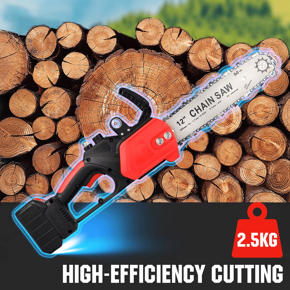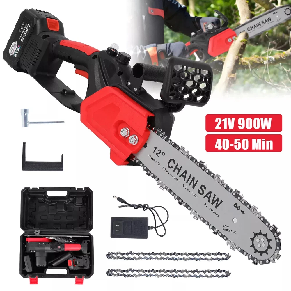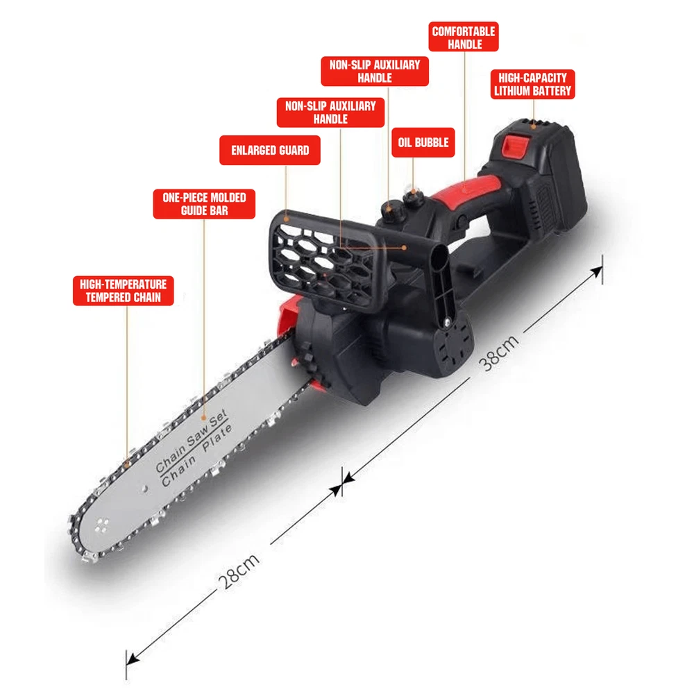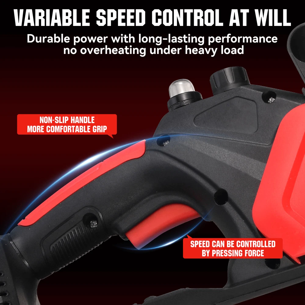 Product Description: Why Choose Our Chainsaw? --Upgrade the powerful copper motor, strong power, load capacity, and cutting efficiency is higher. Getting rid of the clunkiness and ineffectiveness of traditional tools makes your job easier and saves you a lot of money. Width Usage --Whether you're gardening, ranching, camping, or home DIY , this Mini Chainsaw has you covered. Must-Have Investment -- Easy to Use & Save Time Hand Tool Featu res: 【Upgraded High-Power Pure Copper Motor】 This chainsaw is equipped with an upgraded high-power pure copper motor, providing an unprecedented cutting experience. It ensures continuous efficient operation and can easily handle various cutting tasks, from small branches to thick trunks. 【High-Capacity Battery, Long-Lasting】 Equipped with two 1.5Ah high-capacity batteries, this chainsaw offers impressive battery life. The batteries can be recharged over 3000 times, meeting your long-term cutting needs. Additionally, the batteries feature overload and temperature protection, ensuring stable performance and longer life. 【 Compact and Portable, Easy to Use 】 The compact suitcase design is practical, acco mmodating all components perfectly and making it easy to carry. The chainsaw is 99% assembled and ready to use in just one second by inserting the battery, allowing you to start cutting immediately. 【Automatic Oiling System, Extended Lifespan】 This chainsaw features an automatic oiling system that provides the chain with the right amount of lubrication during operation. This reduces the hassle of manual lubrication, minimizes wear on the chain, and extends the chainsaw’s lifespan. 【Safe and Reliable, Triple Protection】 This chainsaw adopts the strictest triple safety measures. First, the safety lock ensures the chainsaw can only be activated by pressing two different buttons simultaneously, preventing accidental activation. Second, the blade guard activates when pressing with the other hand, preventing injuries. Lastly, the handle guard keeps your hand completely separated from the chain, ensuring your safety during operation. 【Wide Usage, Versatile】 This handheld chainsaw is suitable for wood cutting, tree pruning, and various gardening tasks. It is an excellent helper for farms, gardens, and home DIY projects. Whether felling wood, pruning branches, or performing other cutting tasks, it can handle them with ease, making your work more efficient and convenient. Specifications: Type: Chainsaw Color: Red Number of Batteries: 2 Battery Voltage: 21V Charging Time: 1-2 Hours Output Power: 1800W Charging Method: DC Cutting Diameter: Approx. 30 cm Carton Dimensions: 35.5×20.5×15.5 cm / 14×8×6.1 in Plastic Case Dimensions: 38.5×27×16 cm / 15.2×10.6×6.3 in Weight: Approx. 2.5 kg without battery Product Dimensions: Body Length 69 cm, Guide Bar Length 30.3 cm, Main Body Length 40 cm, Handle Length 12 cm Item Incl uded: 1× 12-Inch Chainsaw 2× 1.5Ah Batteries 3× Chains 2× Guide Bars 1× Guard Plate 1× US Standard Charger 1× Box This chainsaw is equipped with an upgraded high-power pure copper motor, providing an unprecedented cutting experience. It ensures continuous efficient operation and can easily handle various cutting tasks, from small branches to thick trunks. Equipped with two 1.5Ah high-capacity batteries, this chainsaw offers impressive battery life. The batteries can be recharged over 3000 times, meeting your long-term cutting needs. Additionally, the batteries feature overload and temperature p rotection, ensuring stable performance and longer life . The compact suitcase design is practical, accommodating all components perfectly and making it easy to carry. The chainsaw is 99% assembled and ready to use in just one second by inserting the battery, allowing you to start cutting immediately . This chainsaw adopts the strictest triple safety measures. First, the safety lock ensures the chainsaw can only be activated by pressing two different buttons simultaneously, preventing accidental activation. Second, the blade guard activates when pressing with the other hand, preventing injuries. Lastly, the handle guard keeps your hand completely separated from the chain, ensuring your safety during operation. This chainsaw features an automatic oiling system that provides the chain with the right amount of lubrication during operation. This reduces the hassle of manual lubrication, minimizes wear on the chain, and extends the chainsaw’s lifespan. This handheld chainsaw is suitable for wood cutting, tree pruning, and various gardening tasks. It is an excellent helper for farms, gardens, and home DIY projects. Whether felling wood, pruning branches, or performing other cutting tasks, it can handle them with ease, making your work more efficient and convenient .