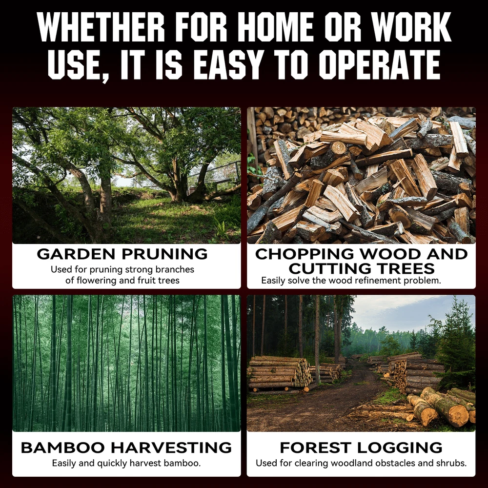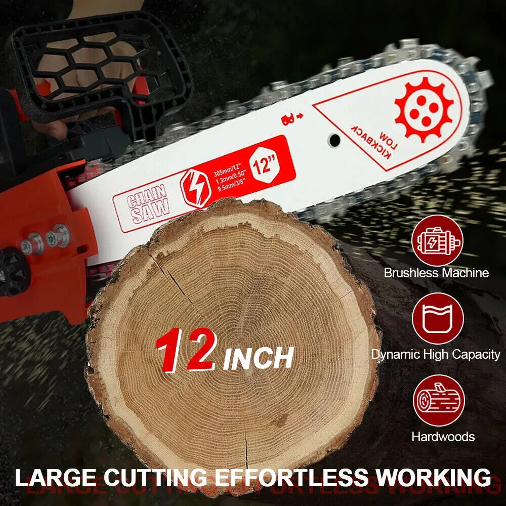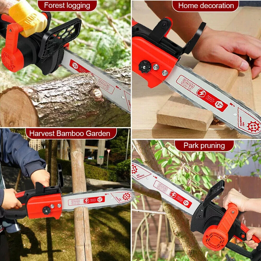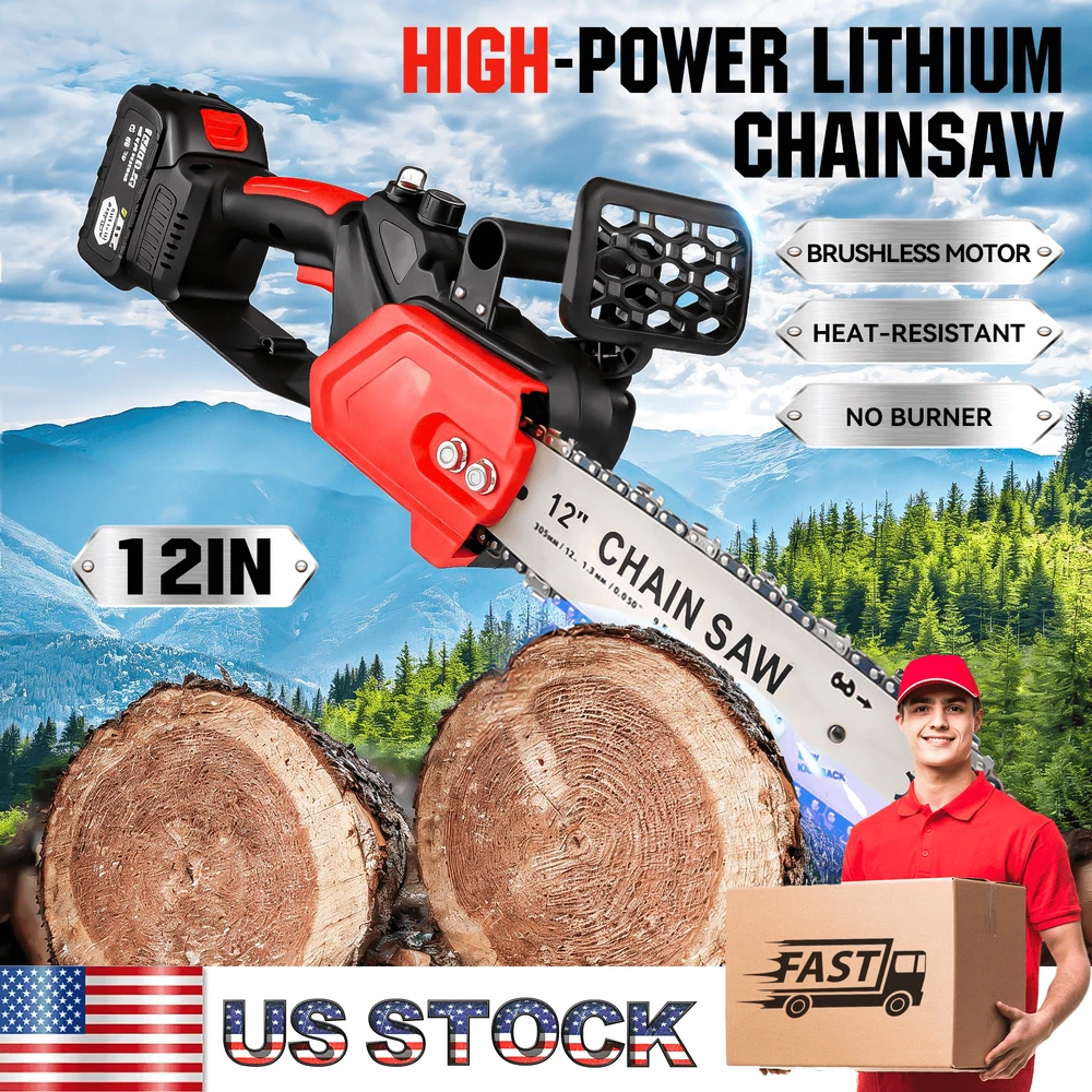 Product Description: Why Choose Our Chainsaw? --Upgrade the powerful copper motor, strong power, load capacity, and cutting efficiency is higher. Getting rid of the clunkiness and ineffectiveness of traditional tools makes your job easier and saves you a lot of money. Width Usage --Whether you're gardening, ranching, camping, or home DIY , this Mini Chainsaw has you covered. Must-Have Investment -- Easy to Use & Save Time Hand Tool Featu res: 【Upgraded High-Power Pure Copper Motor】 This chainsaw is equipped with an upgraded high-power pure copper motor, providing an unprecedented cutting experience. It ensures continuous efficient operation and can easily handle various cutting tasks, from small branches to thick trunks. 【High-Capacity Battery, Long-Lasting】 Equipped with two 1.5Ah high-capacity batteries, this chainsaw offers impressive battery life. The batteries can be recharged over 3000 times, meeting your long-term cutting needs. Additionally, the batteries feature overload and temperature protection, ensuring stable performance and longer life. 【 Compact and Portable, Easy to Use 】 The compact suitcase design is practical, acco mmodating all components perfectly and making it easy to carry. The chainsaw is 99% assembled and ready to use in just one second by inserting the battery, allowing you to start cutting immediately. 【Automatic Oiling System, Extended Lifespan】 This chainsaw features an automatic oiling system that provides the chain with the right amount of lubrication during operation. This reduces the hassle of manual lubrication, minimizes wear on the chain, and extends the chainsaw’s lifespan. 【Safe and Reliable, Triple Protection】 This chainsaw adopts the strictest triple safety measures. First, the safety lock ensures the chainsaw can only be activated by pressing two different buttons simultaneously, preventing accidental activation. Second, the blade guard activates when pressing with the other hand, preventing injuries. Lastly, the handle guard keeps your hand completely separated from the chain, ensuring your safety during operation. 【Wide Usage, Versatile】 This handheld chainsaw is suitable for wood cutting, tree pruning, and various gardening tasks. It is an excellent helper for farms, gardens, and home DIY projects. Whether felling wood, pruning branches, or performing other cutting tasks, it can handle them with ease, making your work more efficient and convenient. Specifications: Type: Chainsaw Color: Red Number of Batteries: 2 Battery Voltage: 21V Charging Time: 1-2 Hours Output Power: 1800W Charging Method: DC Cutting Diameter: Approx. 30 cm Carton Dimensions: 35.5×20.5×15.5 cm / 14×8×6.1 in Plastic Case Dimensions: 38.5×27×16 cm / 15.2×10.6×6.3 in Weight: Approx. 2.5 kg without battery Product Dimensions: Body Length 69 cm, Guide Bar Length 30.3 cm, Main Body Length 40 cm, Handle Length 12 cm Item Incl uded: 1× 12-Inch Chainsaw 2× 1.5Ah Batteries 3× Chains 2× Guide Bars 1× Guard Plate 1× US Standard Charger 1× Box This chainsaw is equipped with an upgraded high-power pure copper motor, providing an unprecedented cutting experience. It ensures continuous efficient operation and can easily handle various cutting tasks, from small branches to thick trunks. Equipped with two 1.5Ah high-capacity batteries, this chainsaw offers impressive battery life. The batteries can be recharged over 3000 times, meeting your long-term cutting needs. Additionally, the batteries feature overload and temperature p rotection, ensuring stable performance and longer life . The compact suitcase design is practical, accommodating all components perfectly and making it easy to carry. The chainsaw is 99% assembled and ready to use in just one second by inserting the battery, allowing you to start cutting immediately . This chainsaw adopts the strictest triple safety measures. First, the safety lock ensures the chainsaw can only be activated by pressing two different buttons simultaneously, preventing accidental activation. Second, the blade guard activates when pressing with the other hand, preventing injuries. Lastly, the handle guard keeps your hand completely separated from the chain, ensuring your safety during operation. This chainsaw features an automatic oiling system that provides the chain with the right amount of lubrication during operation. This reduces the hassle of manual lubrication, minimizes wear on the chain, and extends the chainsaw’s lifespan. This handheld chainsaw is suitable for wood cutting, tree pruning, and various gardening tasks. It is an excellent helper for farms, gardens, and home DIY projects. Whether felling wood, pruning branches, or performing other cutting tasks, it can handle them with ease, making your work more efficient and convenient .