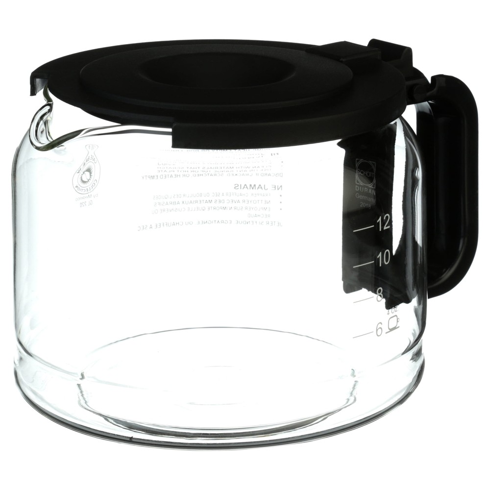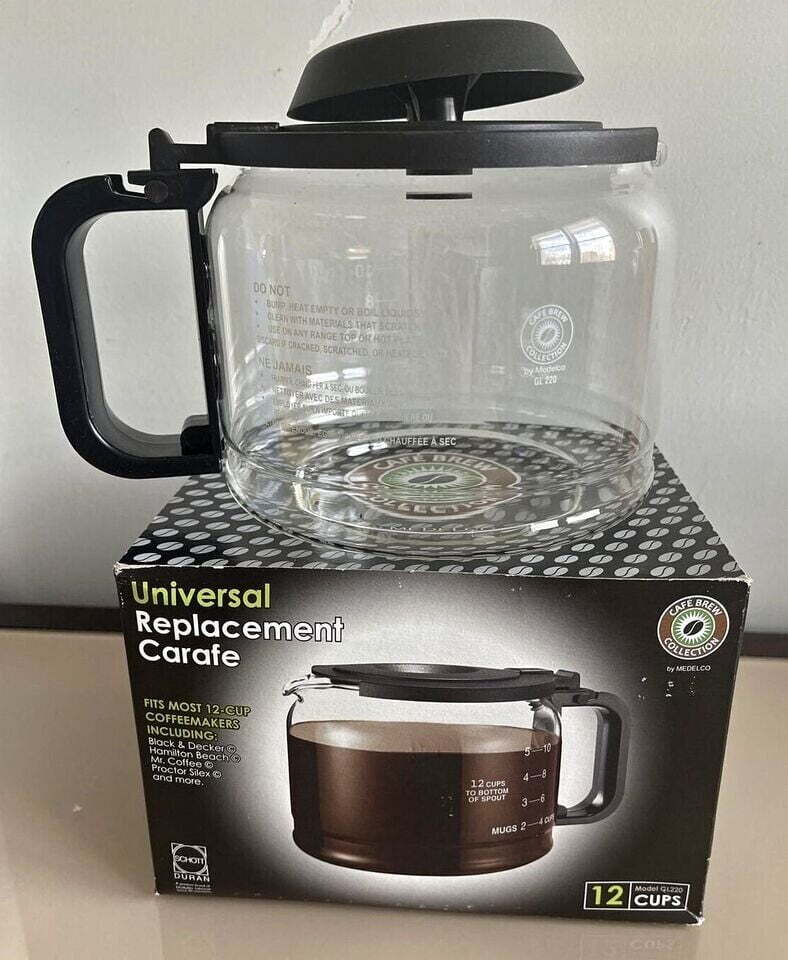 This carafe is packaged with a lid adaptor to expand the fit. The position of the "pause and serve" or "sneak a cup" feature on your coffee maker will determine if you need to use the adaptor.12 Cup Black color Height: 4.88" Height with Adaptor #1: 5.63" Diameter of pot: 6.25" Diameter of base: 4.25" Pause & serve. 12-Cup Traditional-Style Replacement Glass Coffee Carafe Household Appliance Accessories: Product Dimensions: Height: 5.1″, 130mm Height with Adaptor: 5.7″, 146mm Diameter of pot: 6.1″, 156mm Diameter of base: 4.2″, 106mm MODEL #GL220: PRODUCT INSTRUCTIONS: This replacement carafe is packaged with a lid adaptor. You will need to test the carafe to determine if the lid adaptor is required to trigger the “Pause & Serve” feature on your coffeemaker. To test the carafe: 1. Fill your coffeemaker with 2 cups of water; 2. Insert the carafe into the coffeemaker; 3. Turn on the coffeemaker. If the lid has properly activated the “Pause & Serve” feature, the water will flow into the carafe. If the water does not flow into the carafe, insert the lid adaptor into the lid center hole and retest. IMPORTANT SAFEGUARDS: A damaged carafe may result in burns from a hot liquid. Follow the instructions below to reduce the risk of breaking the carafe: The carafe is for household use only The carafe must never be used on a range top. Do not set a hot carafe on a wet or cold surface. Keep the lid on the carafe when in use. Do not use a carafe having a loose or weakened handle. Discard the carafe if chipped, cracked or damaged in any manner. Discard the carafe immediately if it is ever boiled dry. Do no subject carafe to impact, scratches or rough handling as this may weaken glass. CLEANING & PRODUCT CARE: Do not clean the carafe with abrasive cleansers, scouring pads or other abrasive materials; they will scratch and weaken the glass which may cause the carafe to break. Use only sponge, plastic or nylon wash pads with soapy water when washing by hand. Dishwasher top rack safe. Avoid carafe contact with other items in dishwasher.