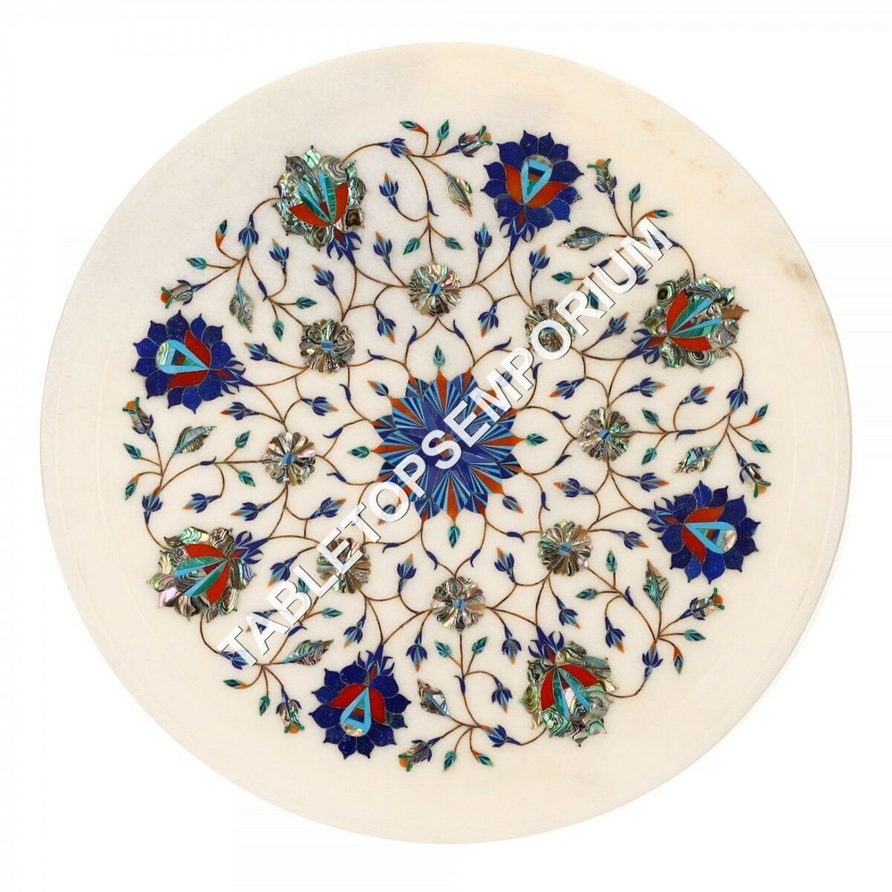 Produktinformation Größe: 12"x12" Zoll Material: Marmor und Halbedelsteine Form: Rund Dicke: 10-15 mm Fertig – Poliert Prozess der Herstellung von Marmoreinlagen Wir legen Halbedelsteine in drei verschiedenen Marmorfarben ein: Weißer Marmor, Schwarzer Marmor und Grüner Marmor. Der Marmor, der zum Einlegen des Halbedelsteins verwendet wird, stammt aus der Stadt Makrana, Rajasthan, Indien. Zuerst schneiden wir den Marmor in verschiedene Formen, zum Beispiel rund, achteckig, rechteckig, oval und quadratisch. Nachdem wir den Marmor geschnitten haben, bemalen wir die Marmoroberfläche mit Hina (roter Farbe), damit wir die Geometrie auf der Marmoroberfläche skizzieren können. Mit Hilfe einer Schmirgelscheibe schneiden, polieren und formen wir die Halbedelsteine in verschiedenen Formen von Blüten, Knospen, Blättern und Stielen. Alle Schnitte der Halbedelsteine werden von den Kunsthandwerkern manuell geschliffen. Nachdem wir die Halbedelsteine geschnitten haben, fügen wir sie zusammen, um das Motiv zu vervollständigen. Anschließend werden die Halbedelsteine auf die Marmoroberfläche gelegt, damit wir sie auf der Marmoroberfläche nachzeichnen können, um die genaue Größe der Hohlräume zu ermitteln. Sobald die Steine nachgezeichnet sind, entfernen wir die Steine Von der Oberfläche des Marmors aus meißeln wir den Marmor manuell mit Diamantmeißeln und Wolframkarbidmeißeln. Sobald die Hohlräume fertiggestellt sind, legen wir den Halbedelstein in die Hohlräume, um die Tiefe der Steine zu überprüfen. Wenn wir völlig sicher sind, dass der Stein gut in die Hohlräume passt, verwenden wir einen speziellen Kleber, um die Halbedelsteine im Marmor zu befestigen. Nachdem wir die Intarsien in den Marmor fertiggestellt haben, reiben wir die Marmoroberfläche zunächst mit Sandstein ab und polieren dann die Marmoroberfläche mit Sandpapier, was der Marmoroberfläche und dem Halbedelstein den natürlichen Glanz verleiht. Wir verwenden Wachspolitur, um die Oberfläche glänzend zu machen. Das Interessanteste an diesem Pietre Dure (Marmoreinlage mit hartem Stein) ist, dass alle Designs von Kunsthandwerkern angefertigt wurden und lediglich eine Fantasie des Künstlers sind. Sobald sie einmal gemacht sind, können sie kein anderes exakt gleiches machen, es wird zwar ähnlich aussehen, aber nicht dasselbe sein. Diese schöne Kunst ist eine aussterbende Kunst von Agra, Indien. Die Handwerker, die diese schöne Kunst herstellen, sind die Nachkommen jener Familien, die das Tajmahal im 17 Mauern des Tajmahal. Ich lade Sie ein, nach Agra, Indien, zu kommen und das wunderschöne Tajmahal zu besuchen. Sie werden sicherlich beeindruckt sein. Wir bitten Sie, uns die Gelegenheit zu geben, Ihnen die wahre handgefertigte Kunst von Agra durch unsere Handwerker zu zeigen. Wenn Sie dieses wunderschöne handgefertigte Marmor-Inlay-Kunstwerk kaufen, werden Sie immer glücklich sein, denn alle Stücke wurden von unseren Kunsthandwerkern mit Liebe, Hoffnung und Freude hergestellt. Sie werden immer Freude an den wunderschönen handgefertigten Marmor-Inlay-Kunstwerken haben, und zweitens werden Sie die lokalen Kunsthandwerker in Agra, Indien, dabei unterstützen, diese schöne sterbende Kunst am Leben zu erhalten. Der gesamte Kauf kommt den Handwerkern und dem Käufer zugute, da es beim Verkauf und Kauf keine Zwischenhändler gibt. VERWENDUNG DES PRODUKTS Es eignet sich hervorragend für dekorative handgefertigte Inlay-Kunstwerke, die Ihrem Zuhause ein königliches Ambiente verleihen. Sie können dies als Hotel, Villa, Heimgebrauch und Innendekoration, Hochzeitsanlass und Firmengeschenke verwenden. Notiz Wenn Sie etwas Individuelles suchen, lassen Sie es uns wissen. Wir fertigen es entsprechend Ihrem Design, Ihrer Größe und Form für Sie an. Kunsthandwerk aus Marmoreinlagen und andere Naturmarmorprodukte sind handgefertigte Produkte. Die Farben der verwendeten Halbedelsteine und des Marmors können geringfügig von der Abbildung abweichen. Ausrüstung und Zubehör werden nur für Fotozwecke verwendet und sind nicht im Lieferumfang des Produkts enthalten. Versand und Verpackung Für den Versand nutzen wir DHL & FedEx Exportverpackung aus versiegeltem Holz, Kiste mit Schaumstoffbändern außen. Wenn am Bestimmungsort lokale Steuern, Zölle oder Mehrwertsteuer anfallen, wird diese vom Käufer bezahlt . Inspiration/Geschichte hinter diesem Produkt Diese schöne Kunst ist eine aussterbende Kunst von Agra, Indien. Die Handwerker, die diese schöne Kunst herstellen, sind die Nachkommen jener Familien, die das Tajmahal im 17. Jahrhundert erbaut haben. Tajmahal ist ein Denkmal der Liebe und eines der sieben Weltwunder, das man leicht besichtigen kann Sehen Sie sich die Kunstwerke an, die mit derselben Technik an den Wänden des Tajmahal geschaffen wurden. Ich wünsche Ihnen einen schönen Tag und viel Spaß beim Einkaufen