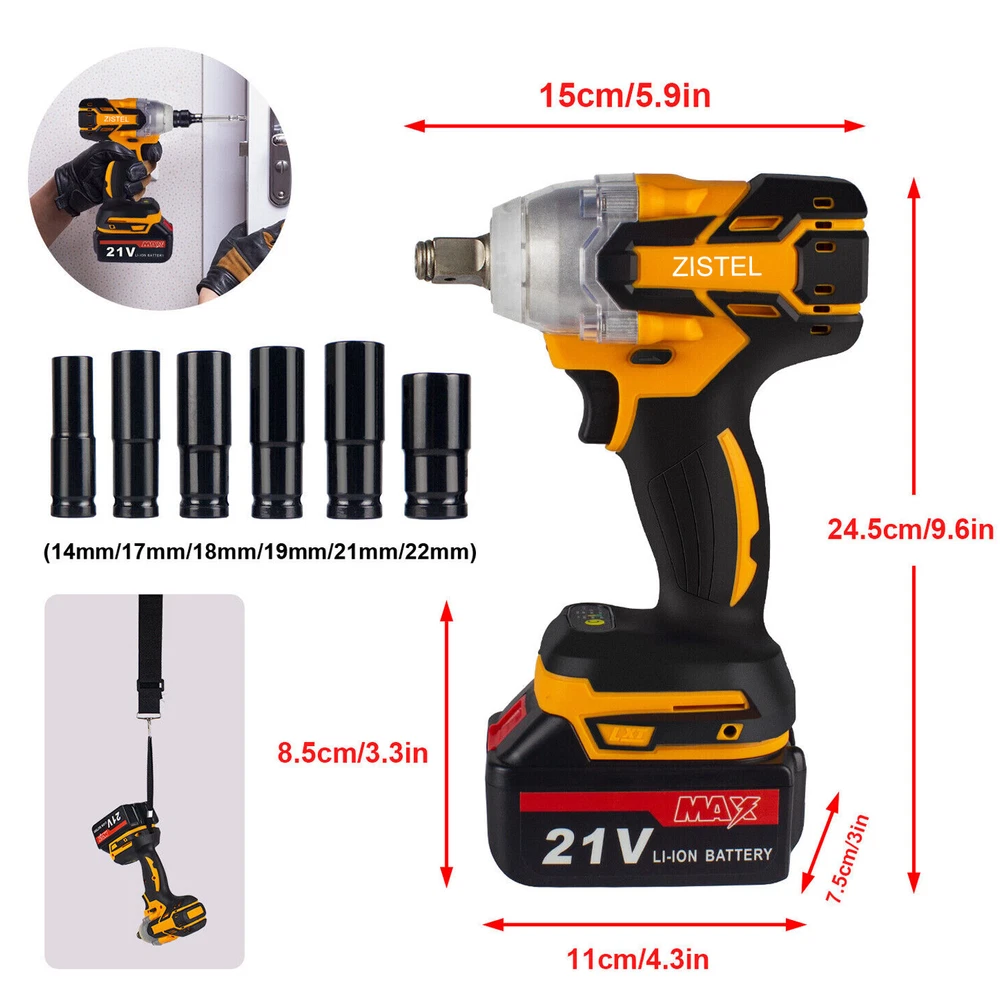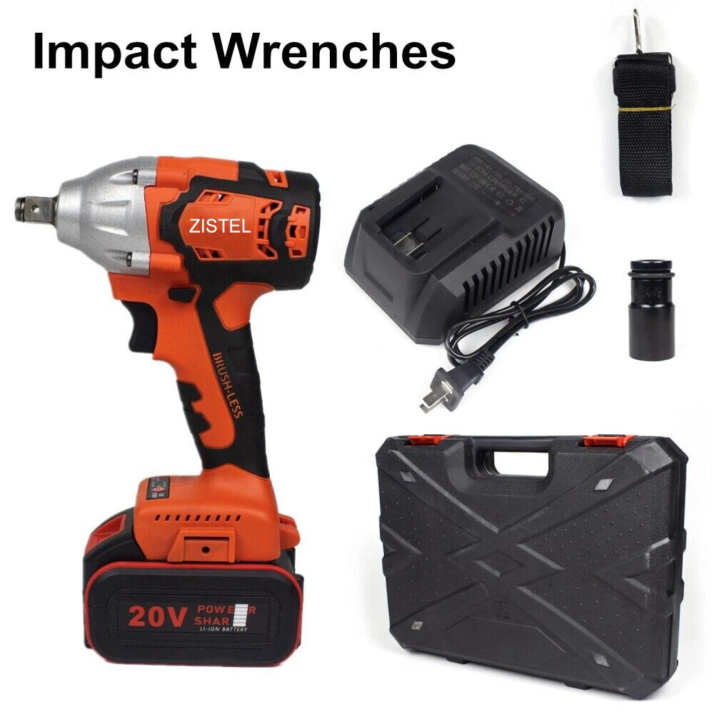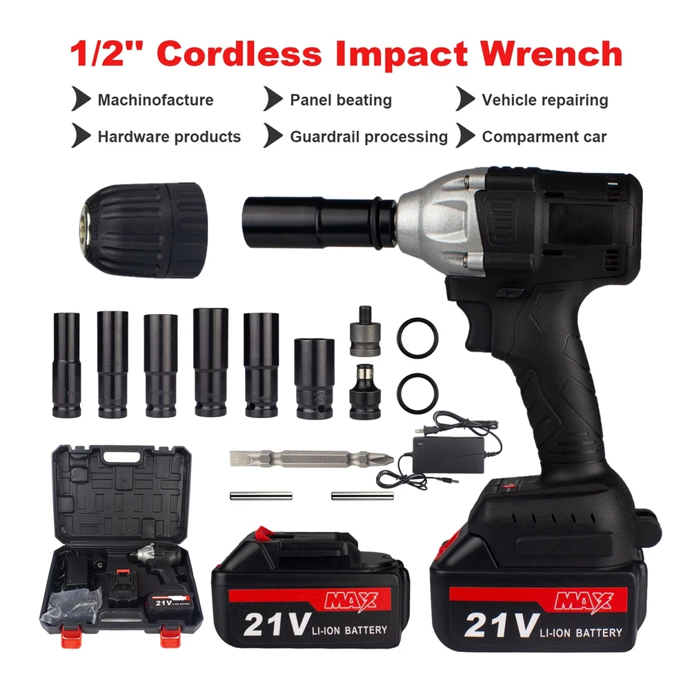 1/2'' Electric Impact Wrench Gun Cordless w/ Li-ion Battery High Power Driver Product Description Features: · Powerful Cordless Power Impact Wrench: This Impact Wrench has a powerful brushless motor, delivers a maximum torque of 520 N.M for fastening various applications. No load maximum speed of 2500r/min(frequency 1500r/min) for driving large fasteners quickly and easily. · Brushless Motor: Brushless motor for higher performance and durability with increased efficiency and runtime, less noise and sparkles compared to brushed motor. · Multi-Functional Cordless Impact Wrench, which can directly transform to Cordless Drill & Screwdriver,meet your work needs anytime, anywhere.It is equivalent to buying three tools at one price. · Configuration: Come with 3Ah Li-Ion Battery, which can last for 1.5-2H hours.The impact wrench have 2/3-speed & stepless speed, you can adjust the speed at any time. Equipped with LED light, there is no hindrance to work in a dark environment. · Forward / Reverse Button: enables easily change rotating direction,can be used for tightening or loosening nuts and bolts. Robust design combines with aluminum alloy housing which prevents damage to the tool. · Come with 14mm 17mm 18mm 19mm 21mm 22mm Wrench Sockets(Only Black,Yellow): different sockets used to be tighten or loosen the nuts and bolts, suitable for automobile repair, engineering maintenance and other applications.Come with a Tool Box as well,easy to carry and storage. · Humanized design: Light weight and compact size suitable for a variety of environments; Handle designed more comfortable and better grip. Specifications: · Voltage: 21V Li-ion Battery / 20V Li-ion Battery · Motor Type: Brushless · Speed: 2 / 3-Speed & Stepless Speed · Frequency Speed: 0-1500r/min · Max.Speed: 0-2500r/min · Max. Torque: 520 N.m · Wrench Chuck:1/2" · Drill Chuck:0.8-10mm / 3/8" · Powered Source: Battery Powered · Battery Capacity:3 Ah Li-Ion · Battery Qty:1 PC / 2 PCS · Working Time: 1.5-2 hours · Charging Time: 3-4 hours · Input:100-240V - 1.0MAX,50-60Hz · Output:21V 1.2ADC · Material: Metal&ABS Plastic · Socket Size: Black, Yellow: 14mm 17mm 18mm 19mm 21mm 22mm / Orange: 22MM Battery Tips: 1. Before first using,please make sure fully charge(3-4 hours) the battery to activate battery performance. 2. Keep the battery away from water,do not pound the battery violently. 3. If you encounter any problems during use, please let us know as soon as possible and our team will help you. Black + 2 Batteries Package Includes: 1 x 21V Impact Wrench 2 x 3Ah Li-ion Batteries 1 x Charger 6 x Socket Sleeve (14mm/17mm/18mm/19mm/21mm/22mm) 1 x Drill Adapter 1 x Drill Connector 1 x Hex Screwdriver Adapter 1 x Hex Screw Bit 1 x Rubber Ring 1 x Latch 1 x Portable Tool Box 1 x User Manual Yellow + 1 Battery Package Includes: 1 x 21V Impact Wrench 1 x 3Ah Li-ion Batteries 1 x Charger 6 x Socket Sleeve (14mm/17mm/18mm/19mm/21mm/22mm) 1 x Drill Adapter 1 x Drill Connector 1 x Hex Screwdriver Adapter 1 x Hex Screw Bit 1 x Rubber Ring 1 x Latch 1 x Adjustable Shoulder Strap 1 x Portable Tool Box 1 x User Manual Orange + 1 Battery Package Includes: 1 x 20V Impact Wrench 1 x 3Ah Li-ion Battery 1 x Charger 1 x 22mm Socket Shipping Policy All packages will be shipped within 1 business day. Notification of shipment will be sent to buyer through email on the same day that your item is shipped. We will ship this product via Standard shipping services. Normally, It takes * 1-3 business days to the Western United States * 4-6 business days to the Eastern United States However, please note that there are certain circumstances that we unfortunately can not have control i.e. weather condition, delay by post office, Sundays, National Holidays, etc. Besides, we don't arrange shipment on weekends. We appreciate your great understanding.